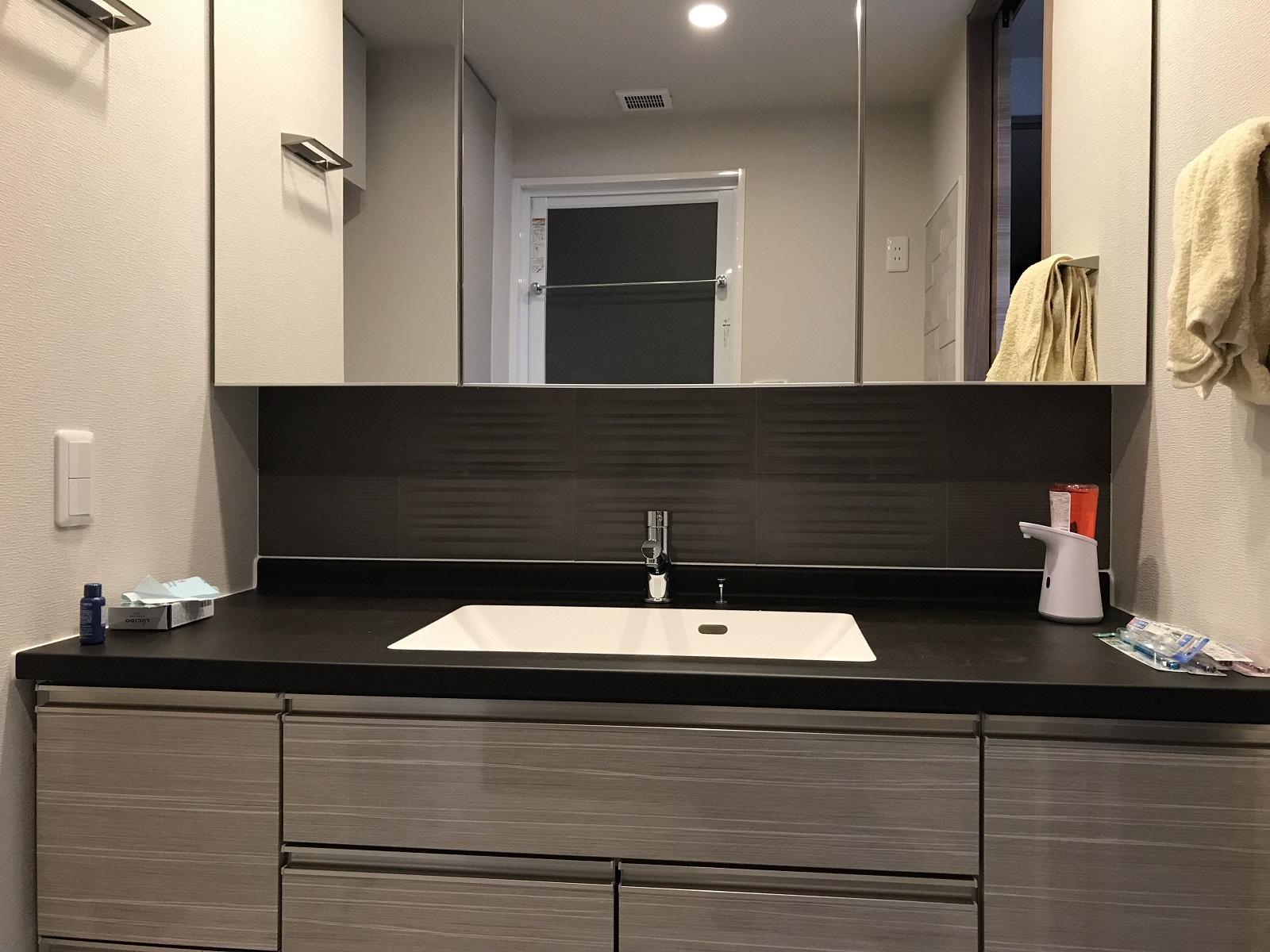 ミラーとカウンター天板の間の壁面に貼りました。グラナスラシャ(ダークグレー)使用