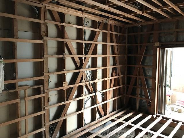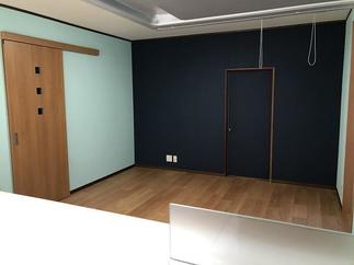 リビングとダイニングの床は無垢調のフローリングを貼り、天井・壁はビニルクロスで壁はライトブルーとアクセントでテレビ背面の壁はネイビーブルーにしました。