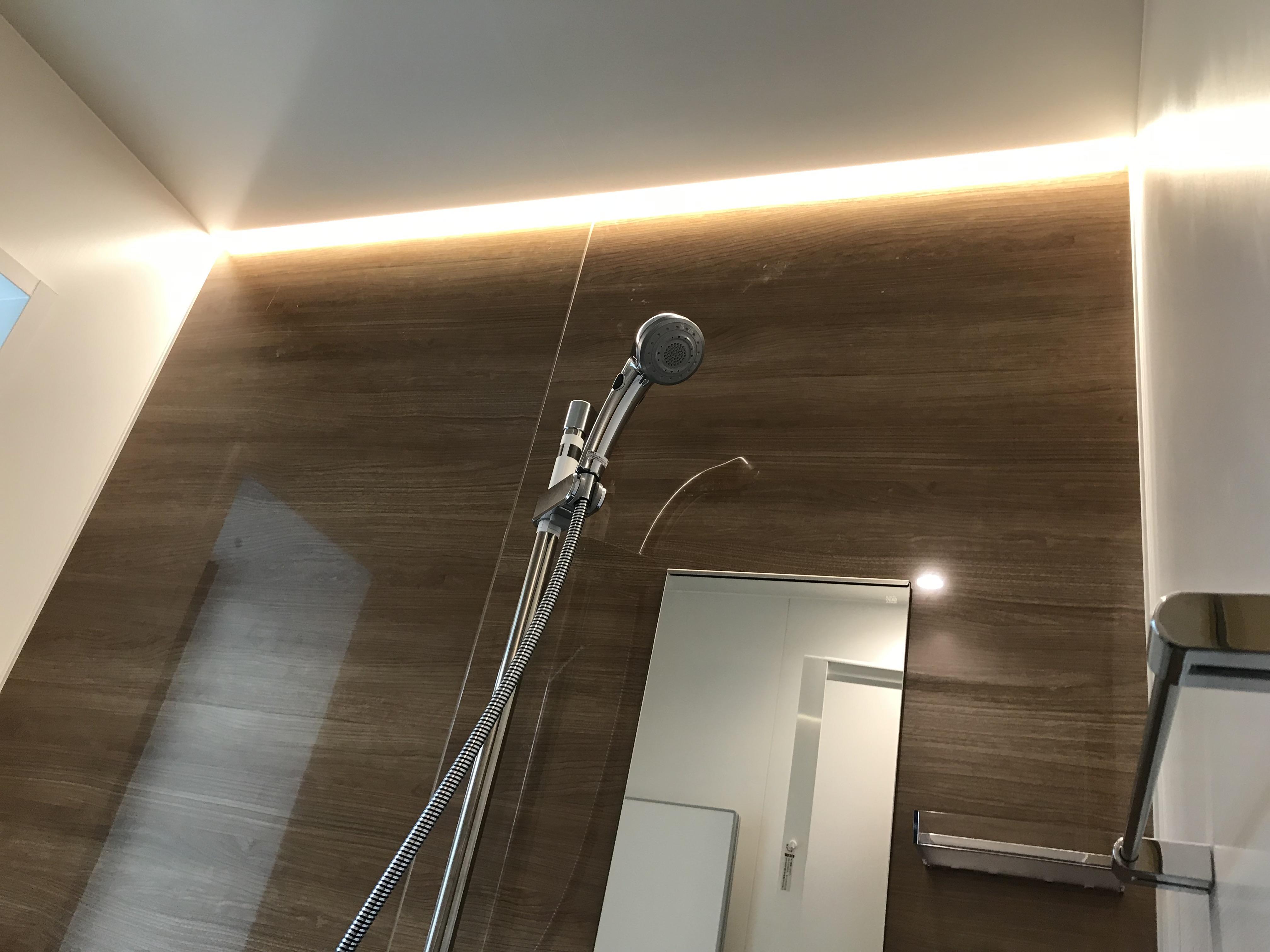 癒しの空間をさらに際立たせてくれるライン照明です。この照明は爽やかな明かり(白っぽい明り)からあたたかなあかり(黄色っぽい明り)まで自在に調整できるんです。朝や夕方気分にあわせてご入浴を楽しめます。