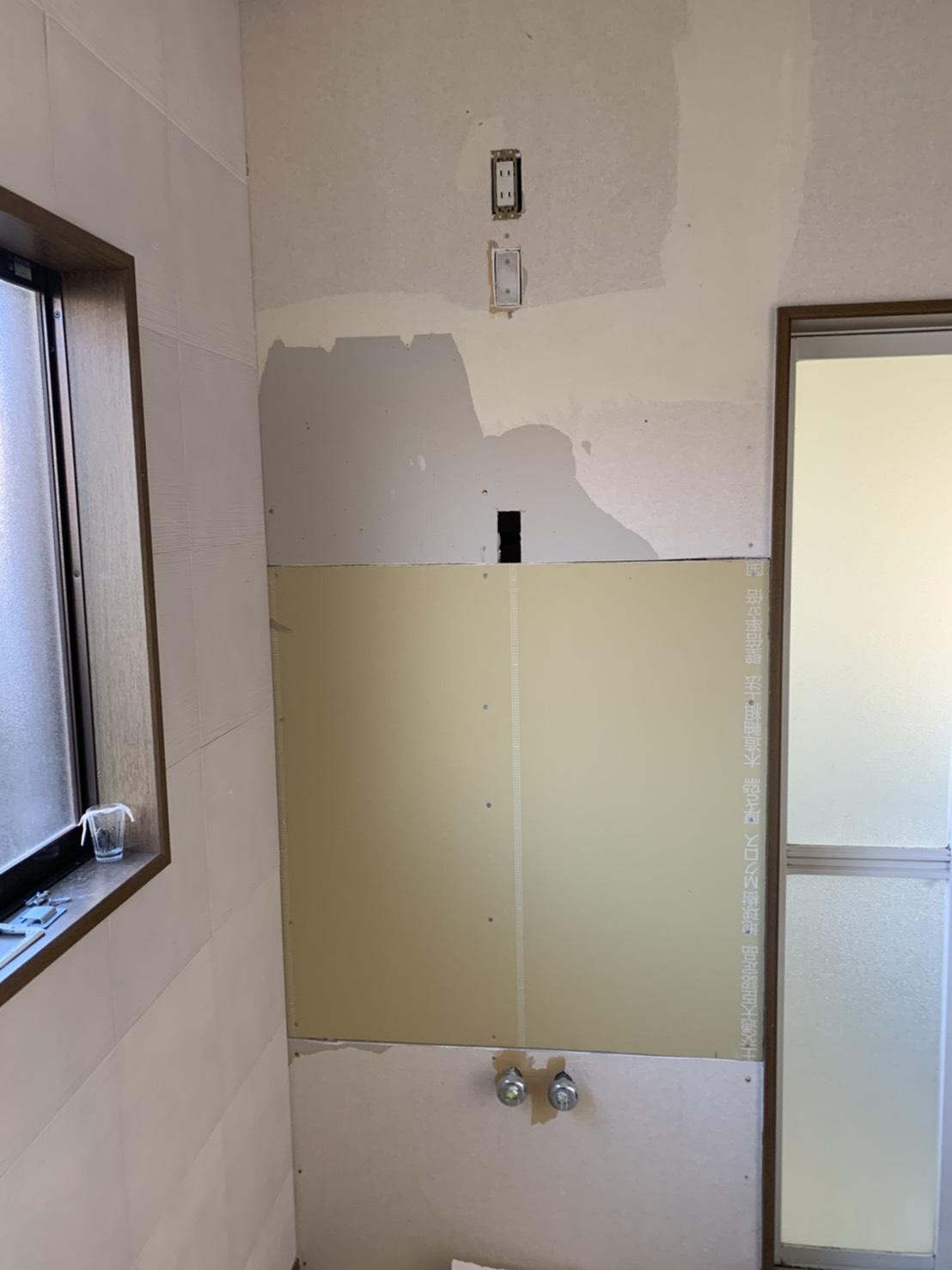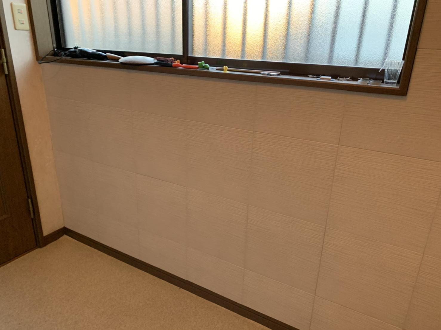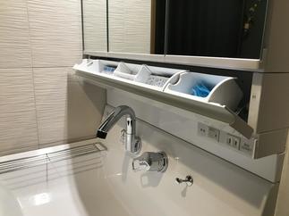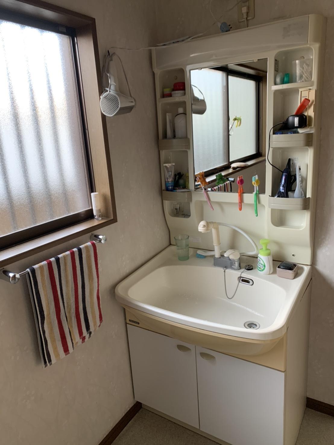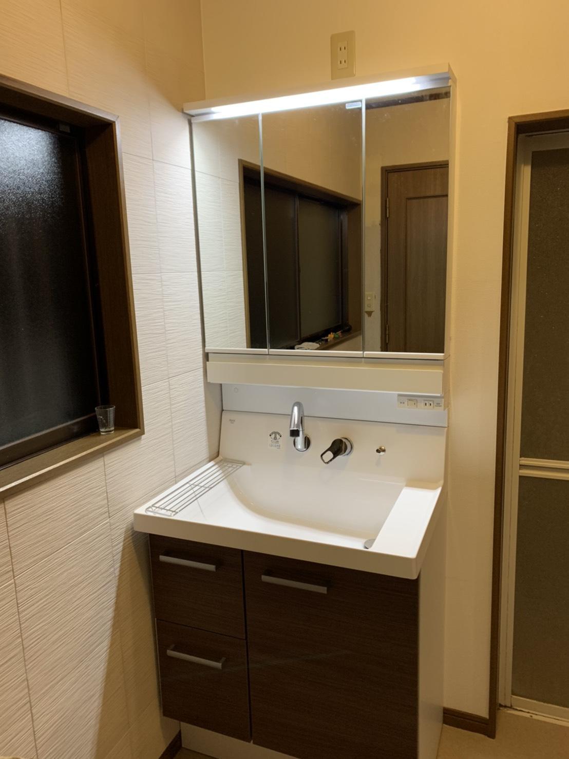元々、中古物件を購入して気に入った洗面台ではありませんでした。 洗面台の廻りにはいつも、物があふれていてスッキリ収納したいと不満に思っていました。 壁紙も好みではなく、浴室の入口廻りの床材も剥がれて来ていました。 お風呂の出入りの時に湯げが入ってきて湿気も気になっていたようです。 このような事を改善したいとの事でリフォームさせて頂き、大変満足して頂きました。