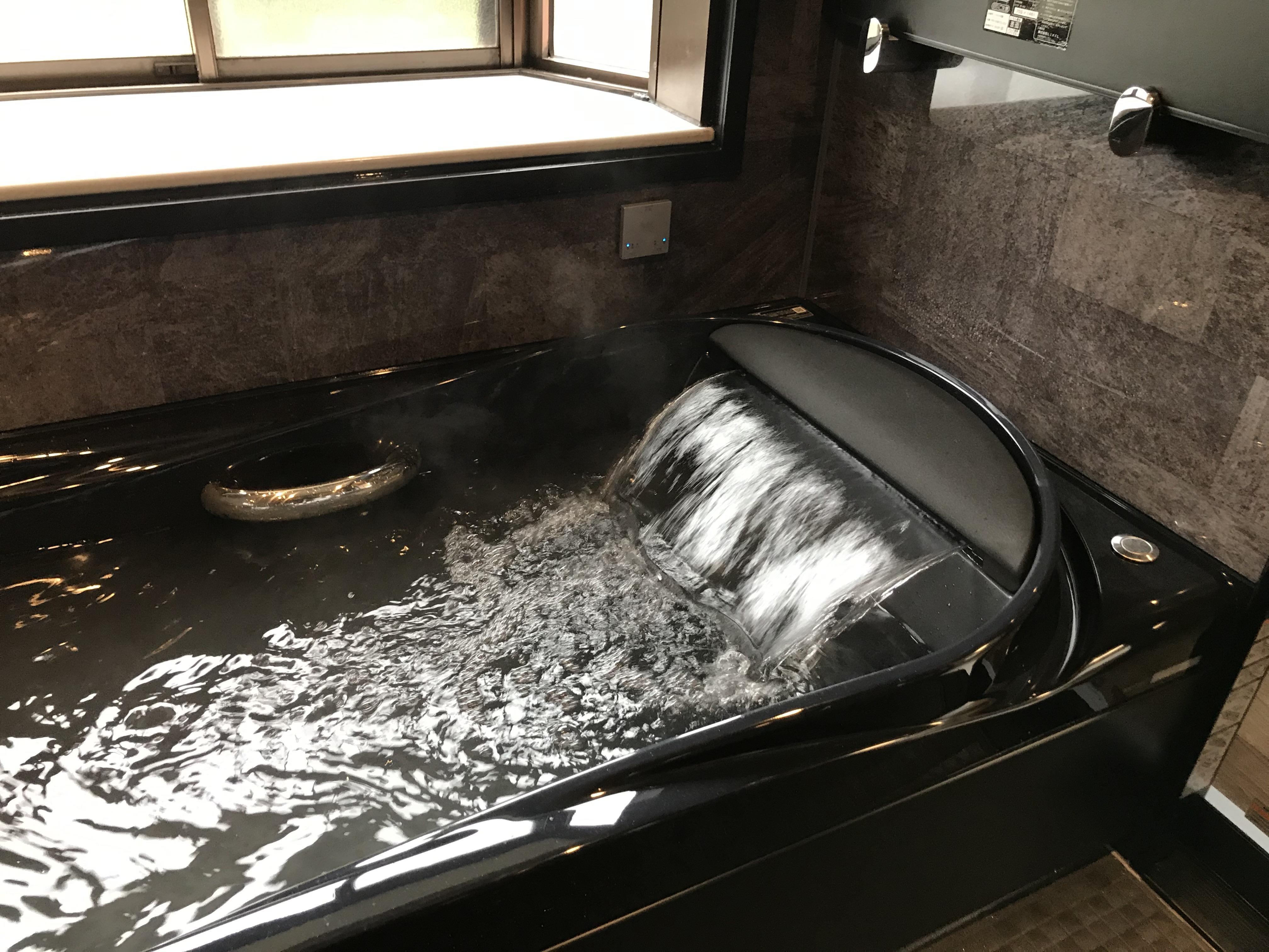 LIXILの最高級品ユニットバス、スパージュになります。 他メーカーにはない4mmのなめらかに、途切れることなく流れ続けるお湯のベール。 心地よく、溢れるようなお湯のあたりを実現しています。