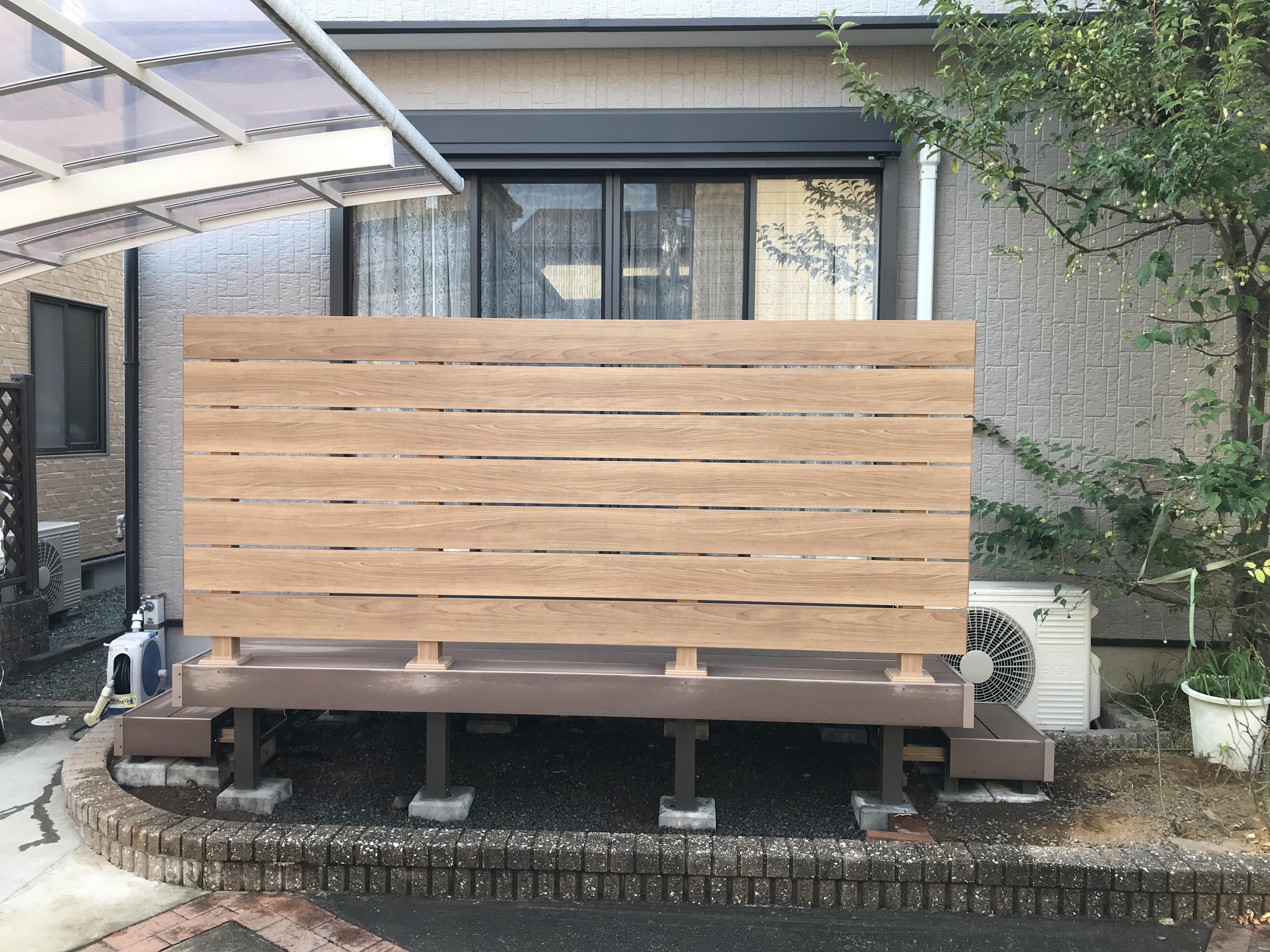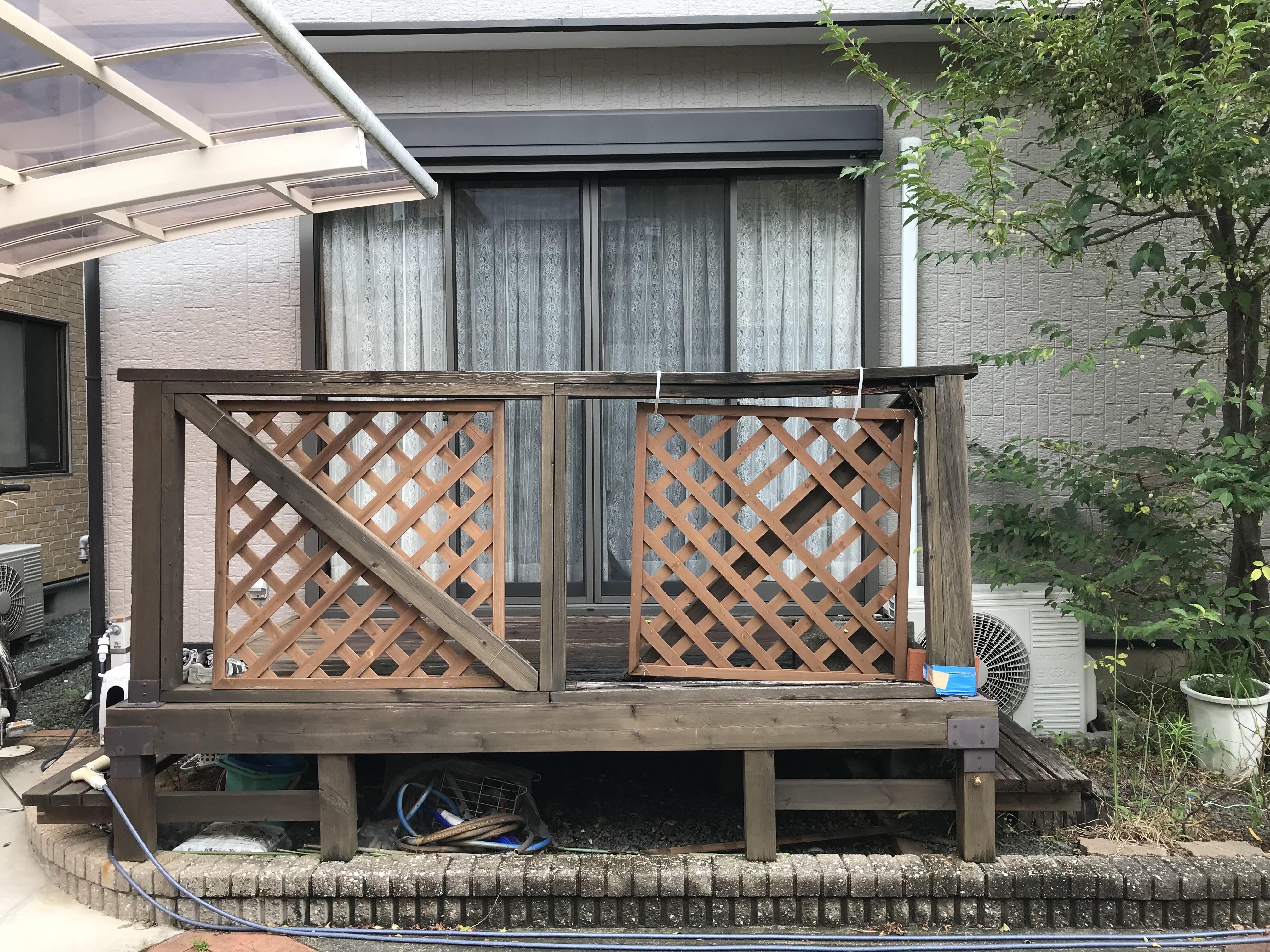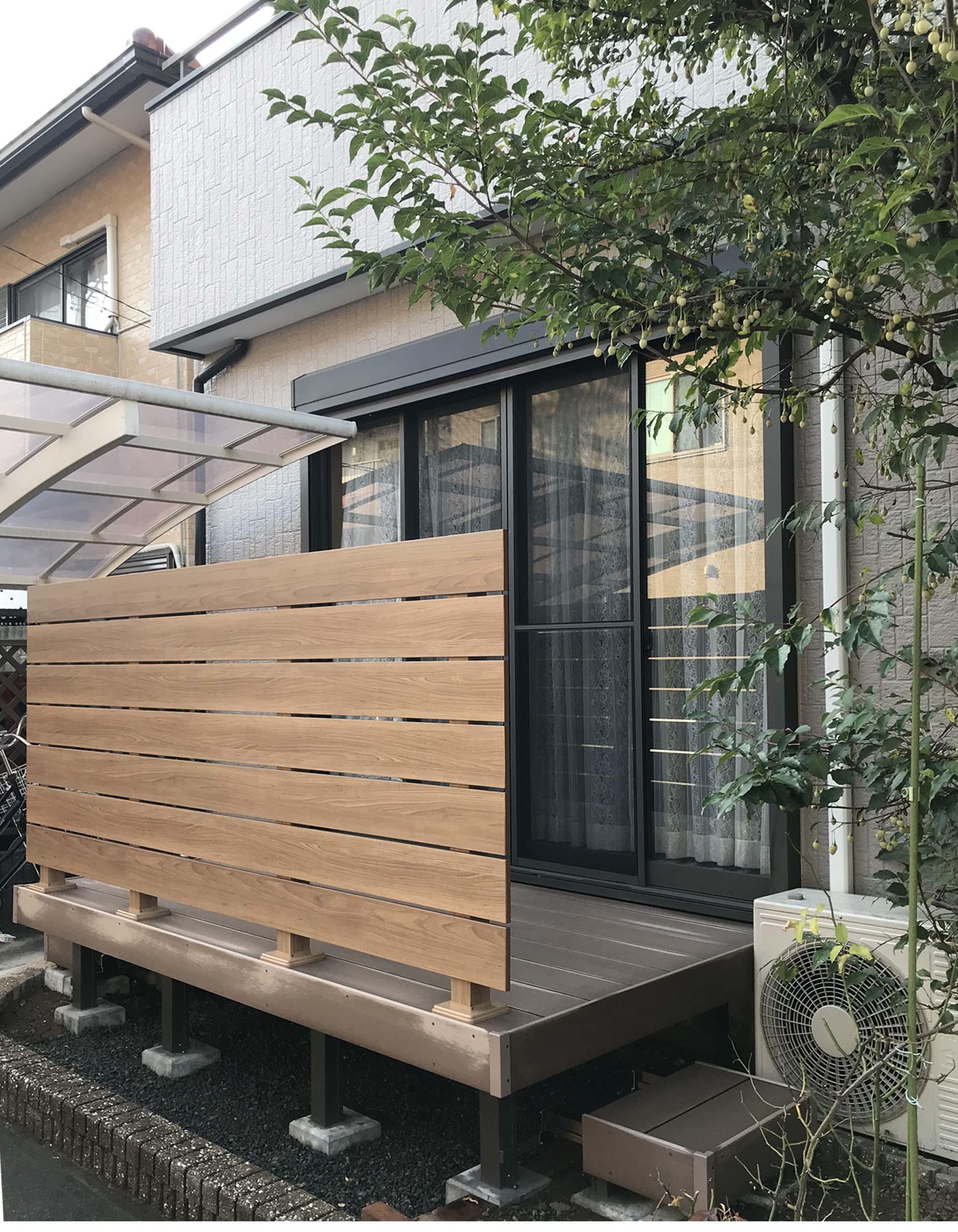 木材で作ってあったウッドデッキが長年の風雨にさらされあちこち朽ちてしまったそうで、今回見た目、肌触りは天然木とあまり変わらず腐食やシロアリの心配もない人工木材を使用したLIXILの樹ら楽ステージを採用していただき交換となりました。またリビングの目隠しも兼ねてフェンス付とさせていただきました。他にアルミ材の物も以前ご検討されたようでしたが、日差しを受けるとかなりの熱を持ってしまうためその対策として人工木材を使用した物ならアルミの物より熱を持たない事もえらんでいただいた理由の一つだそうです。