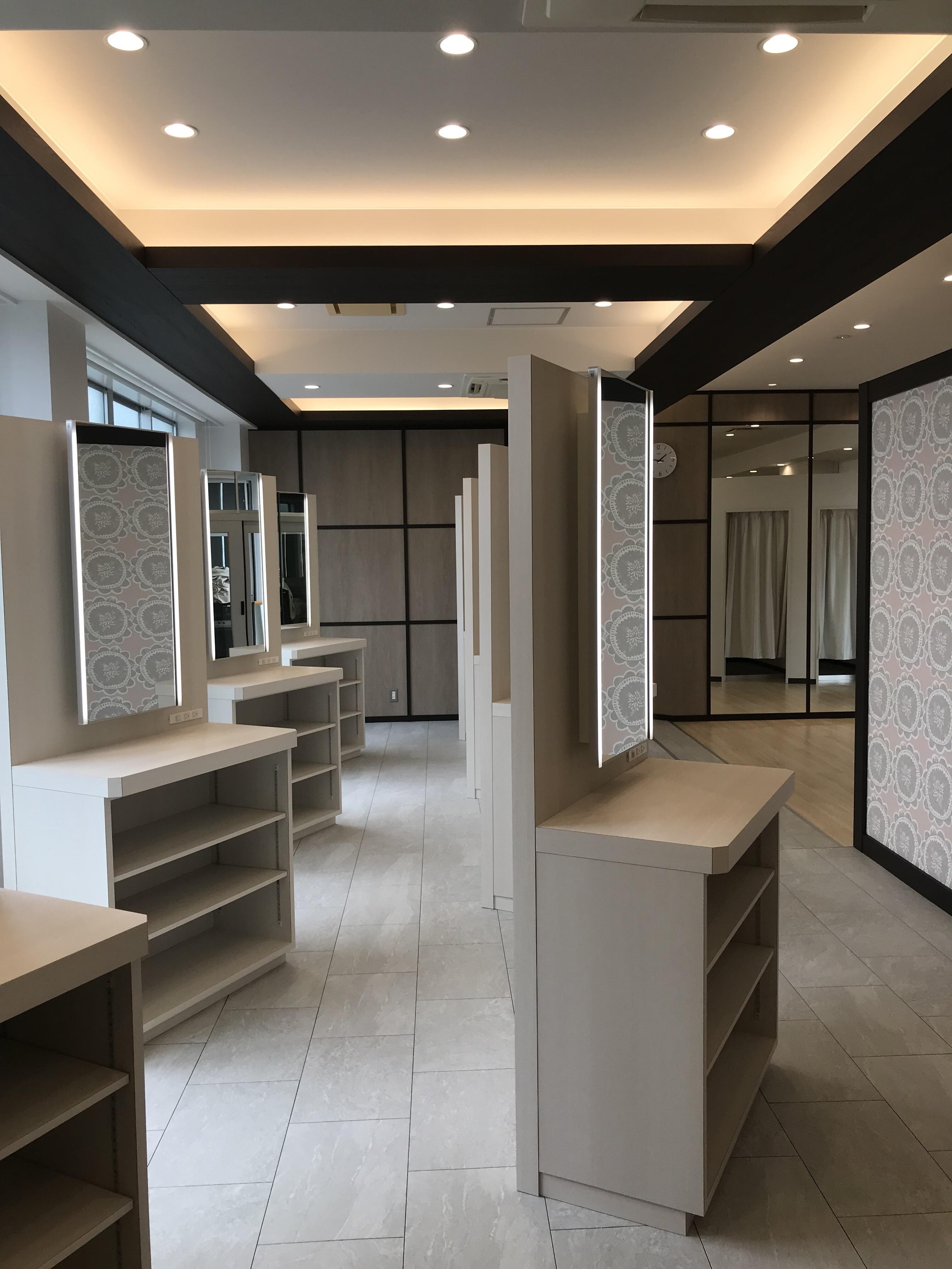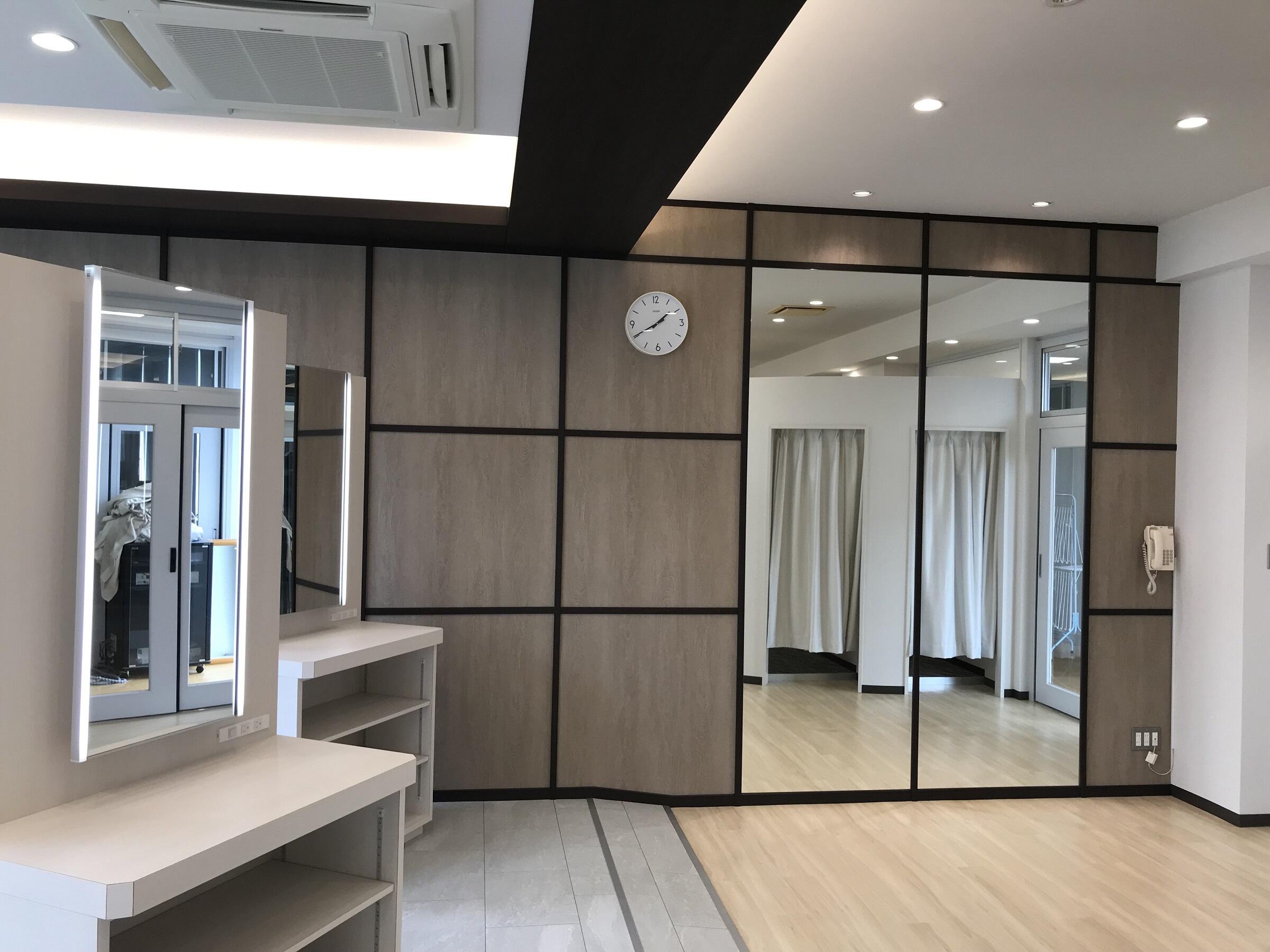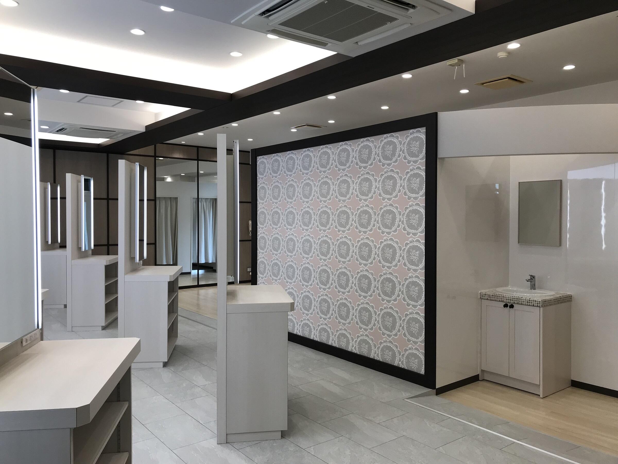 今まで多目的教室として利用されていた空間を、生徒さんたちが休み時間などに利用できるパウダールーム&更衣室に改修しました。 将来の理容・美容師さんたちの学校ですので資格をとり将来働く場所として見ても遜色のないパウダールームを考えました。 綺麗にできあがりとてもうれしいです。