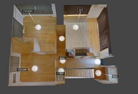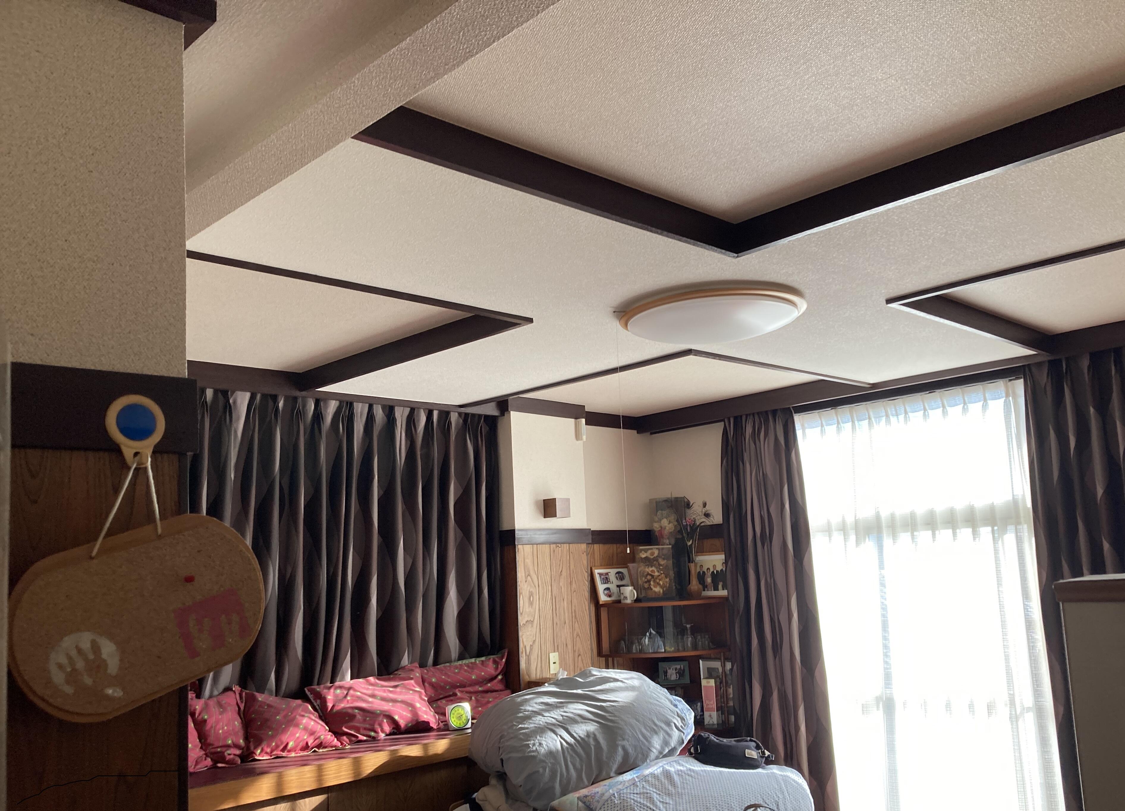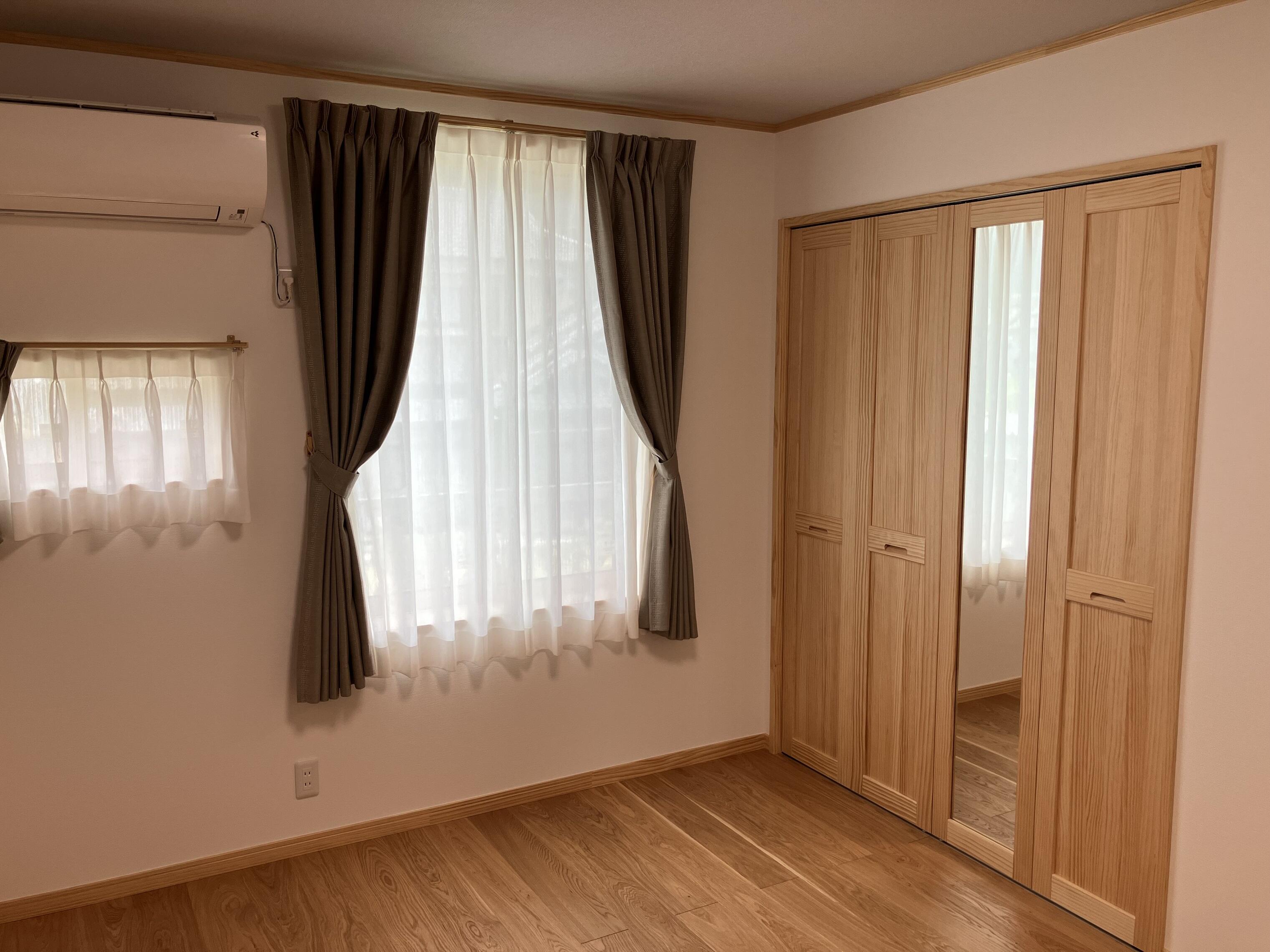 寝室ですので朝の日差しが気になります。そこでカーテン取付部分をカーテンBOX風にし天井より高い部分にしました。かつ壁一面をカーテンとした事により日差しはほぼ入ってきませんし、かつカーテンが落ちついた高級感を持たせます。廊下から部屋に入ってくる部分は廊下と同じフローリングとしベッドを置く部分はタイルカーペットとしました。このフローリングは表面に3mm厚の挽板を使用しており肌さわりは無垢材にも劣りません。またタイルカーペットも音を吸収しかつ足裏に柔らかい素材ですので寝室にはピッタリです。