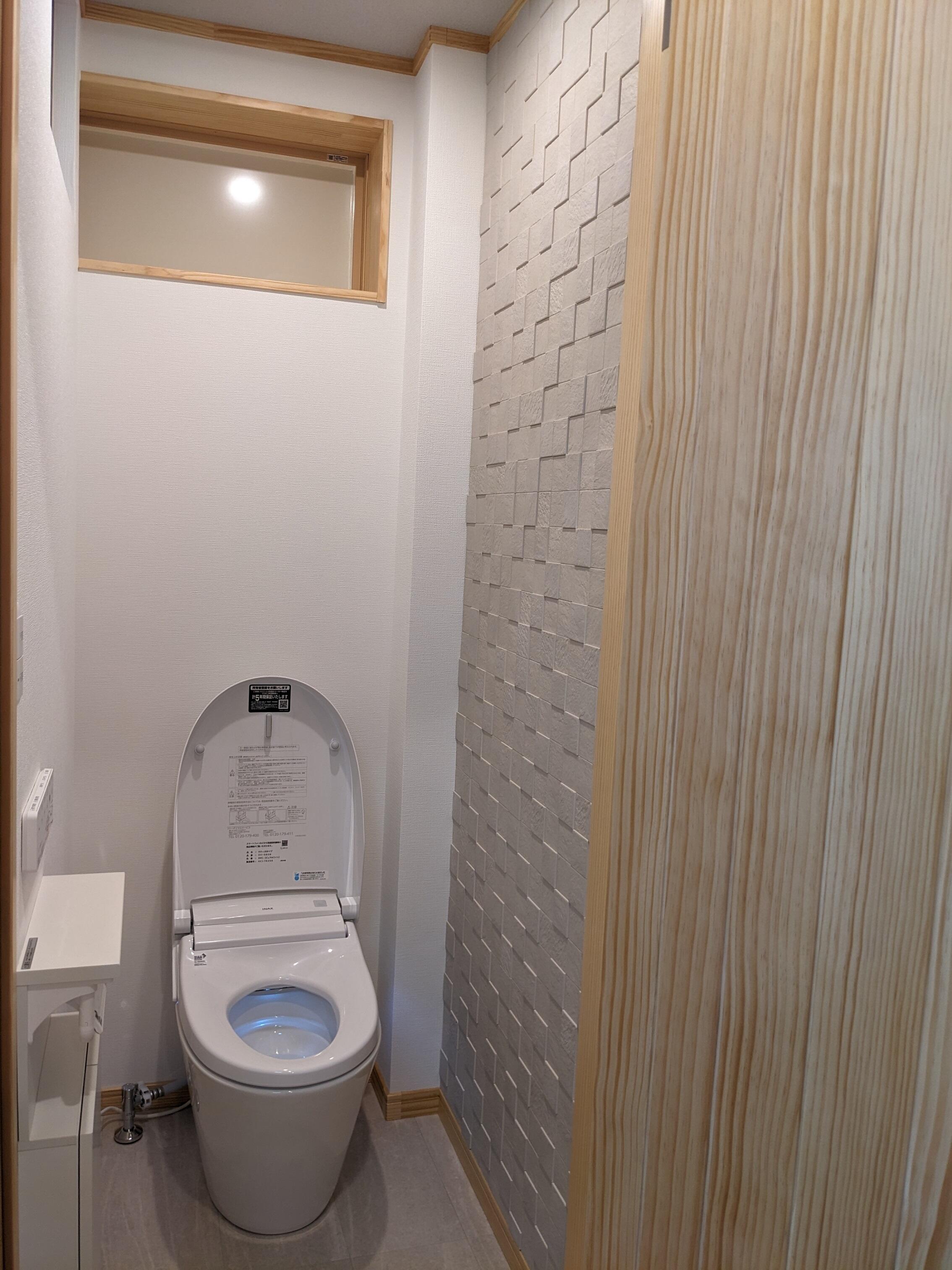 けっして広くはない空間ですがそんな時こそLIXILのサティスの出番です。通常の物よりサイズが小さいので問題なく使用できます。また壁には埋め込み収納付きの紙巻き器を取付。ペーパーなどの置き場所にも配慮いたしました。そして壁一面にはLIXILのエコカラット。優しくやわらかで高級感のある仕上げとなりました。