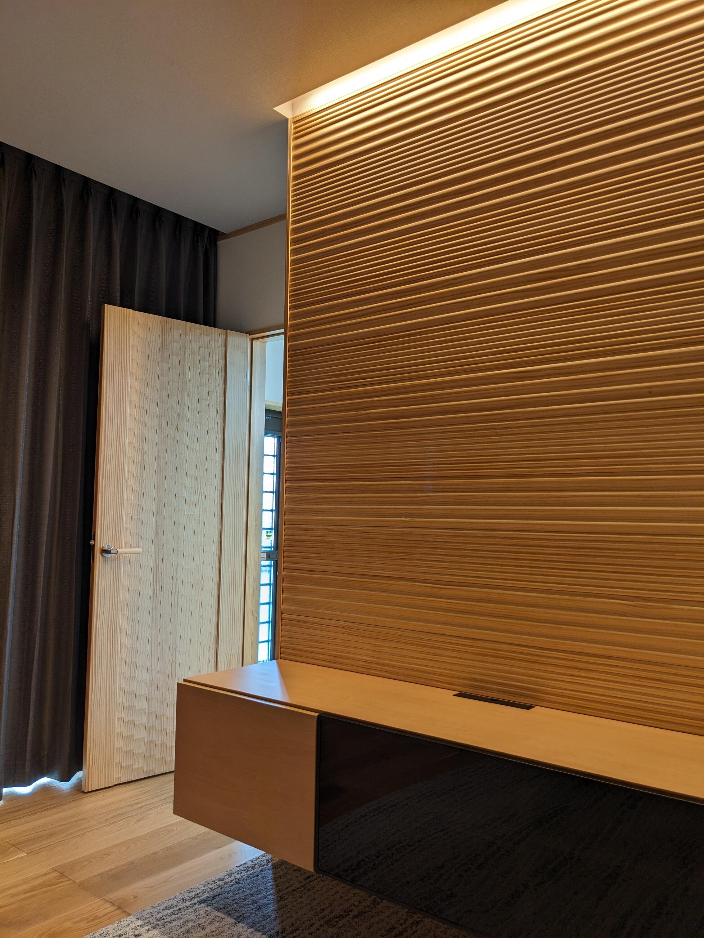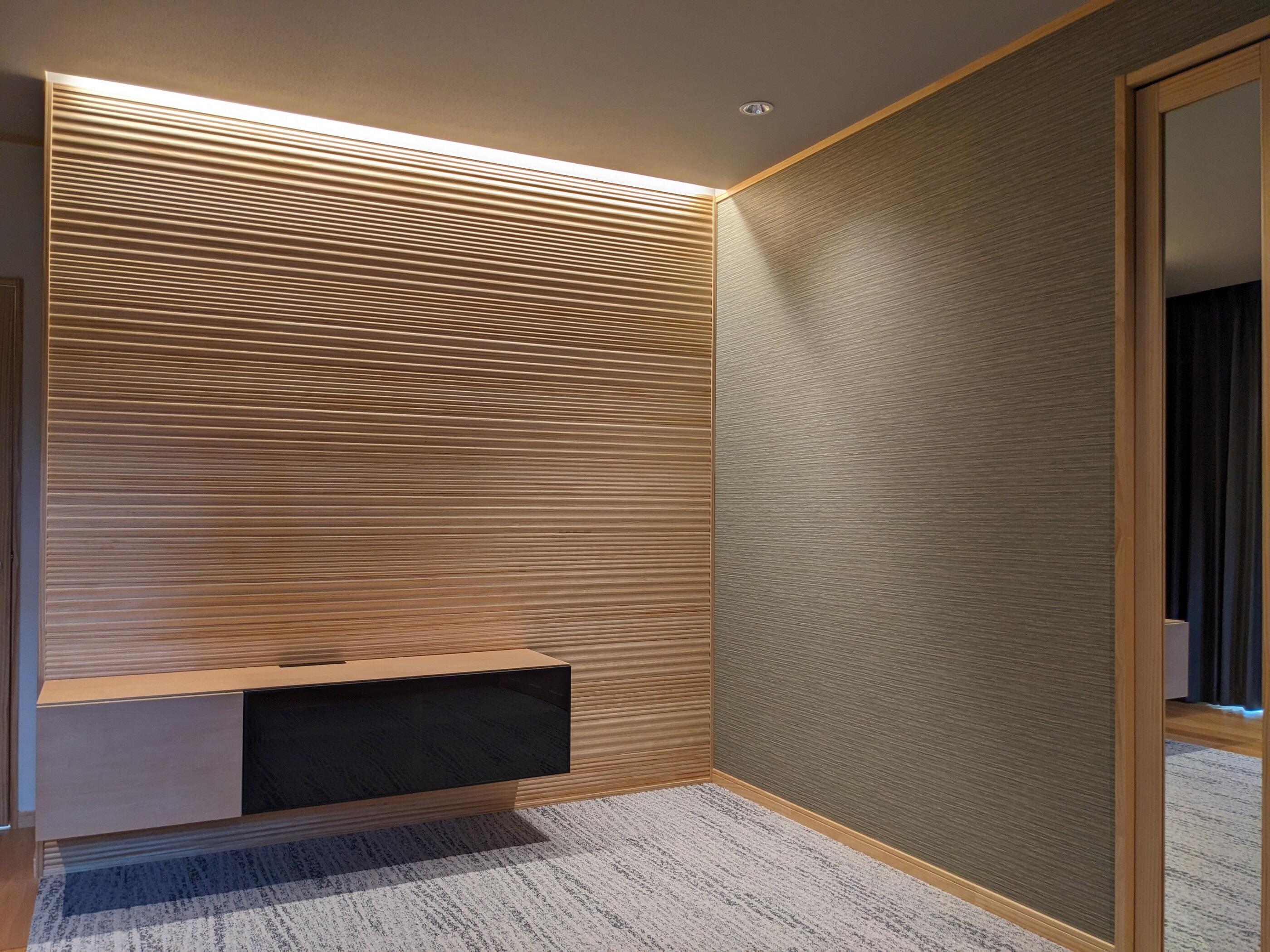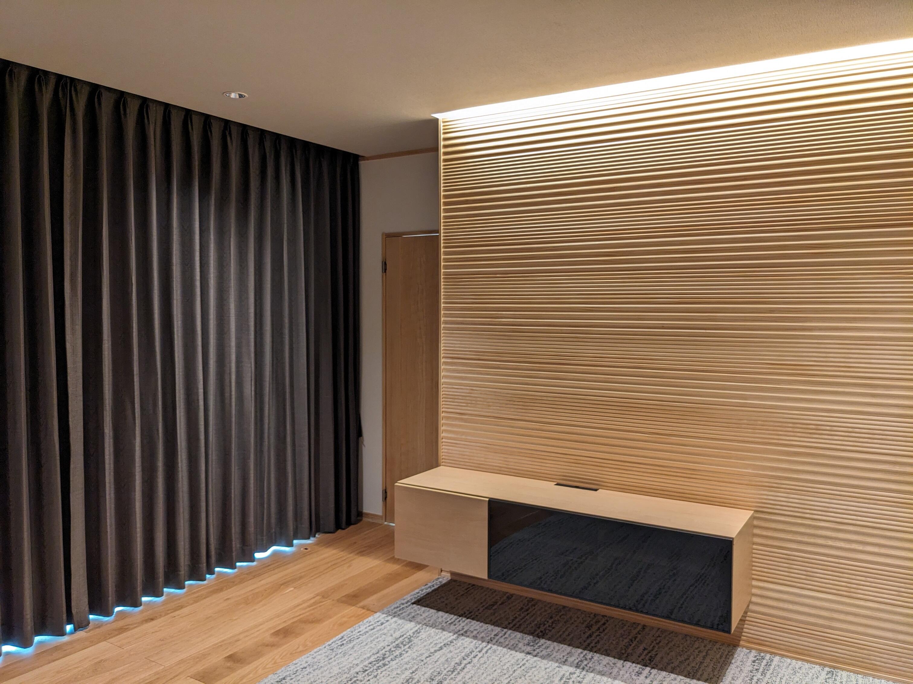 壁にはウッドワンのデザインウォールを取付、無垢の木の柔らかさと大、小のウエーブで落ち着いた空間になります。また間接照明を当てる事により一層立体感が浮き出てとてもきれいです。