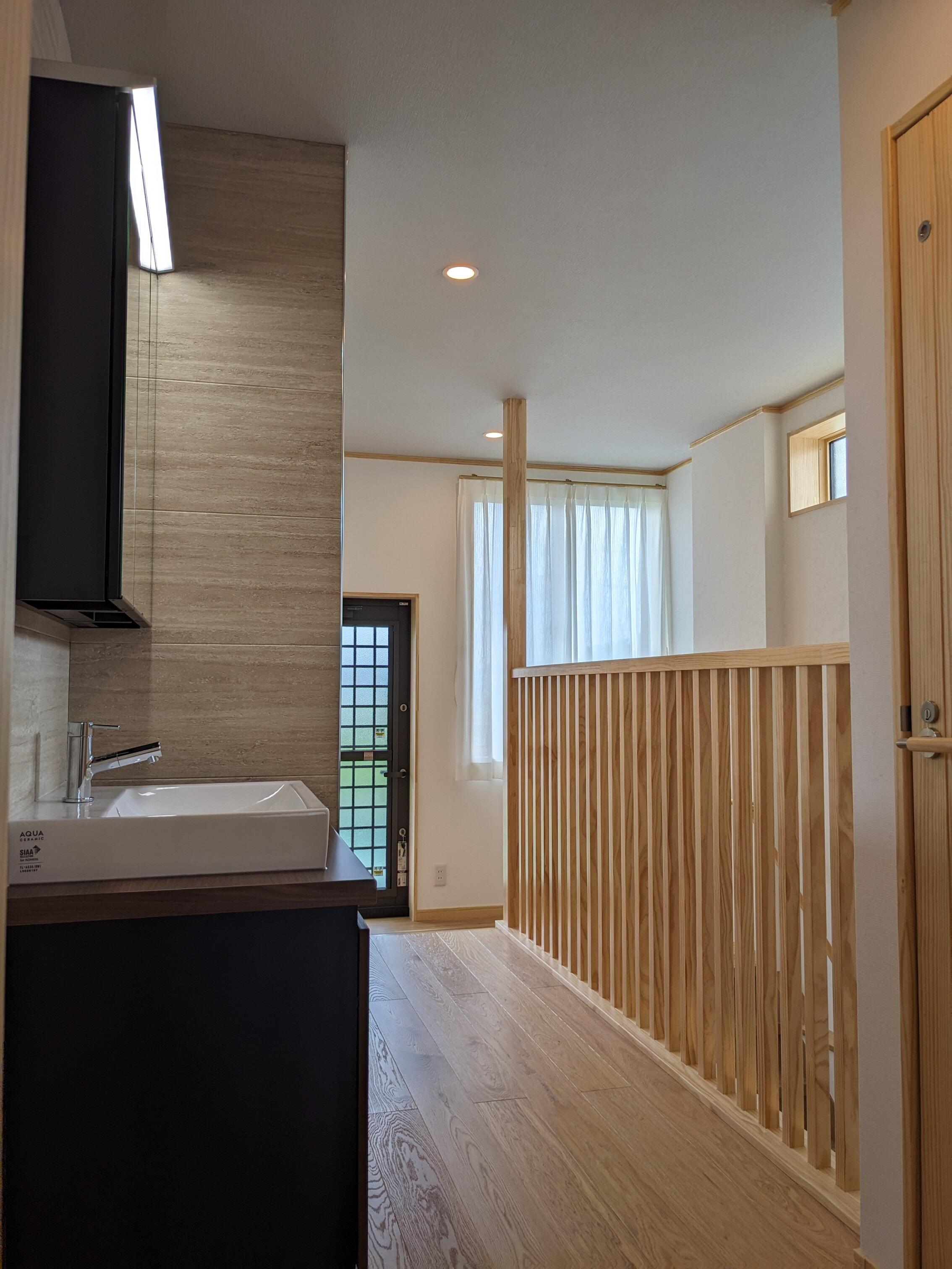 階段ホールの手摺も壁とせず写真のように隙間がとれるタイプを選んだので光あふれる明るい感じになりました。そして廊下巾を90cmとした事で(通常の木造ですと75㎝くらい)とてもひろく感じられる空間となりました。