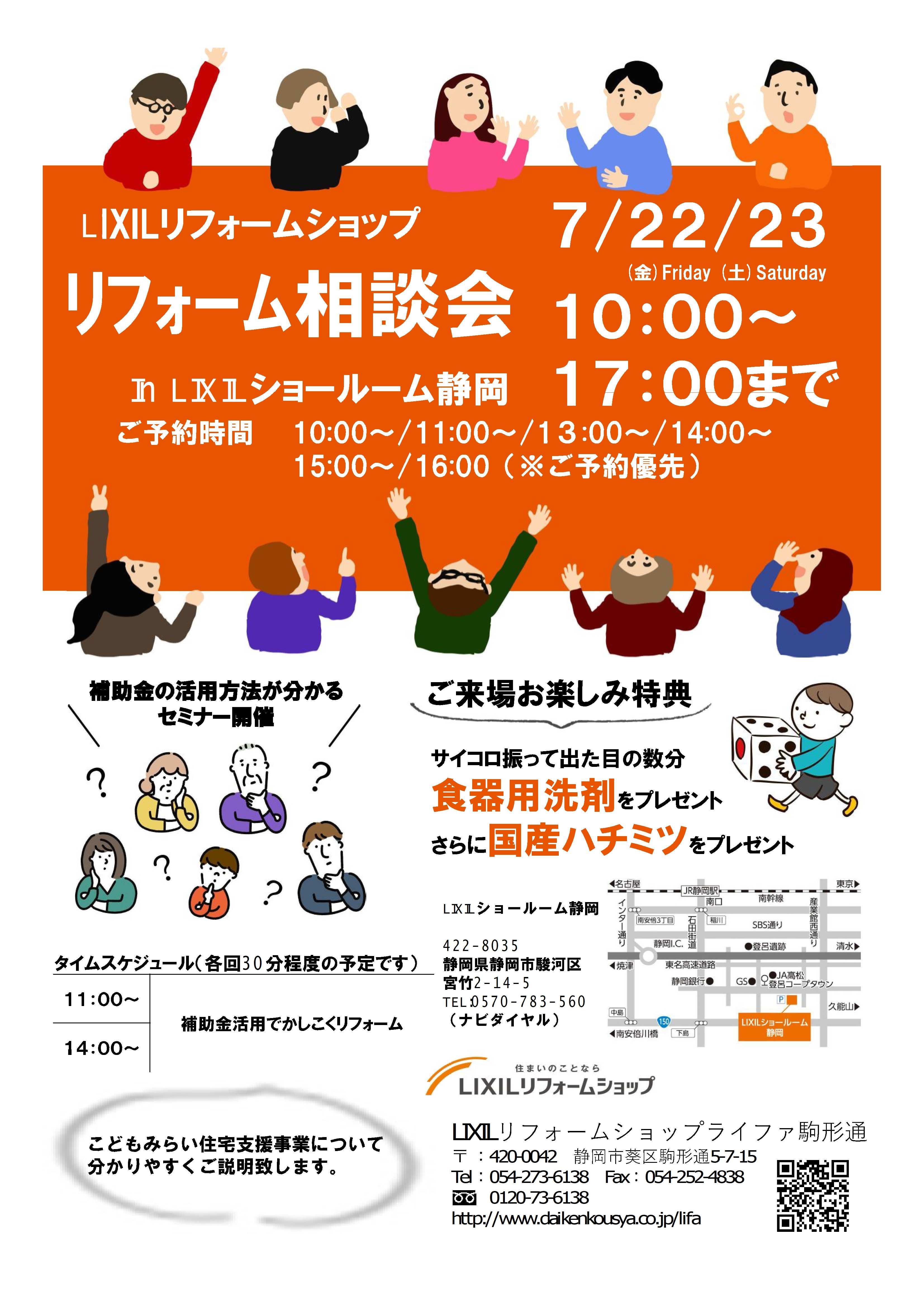 7月22日(金)23日(土)LIXILショールーム静岡にて、リフォーム相談会を開催いたします。