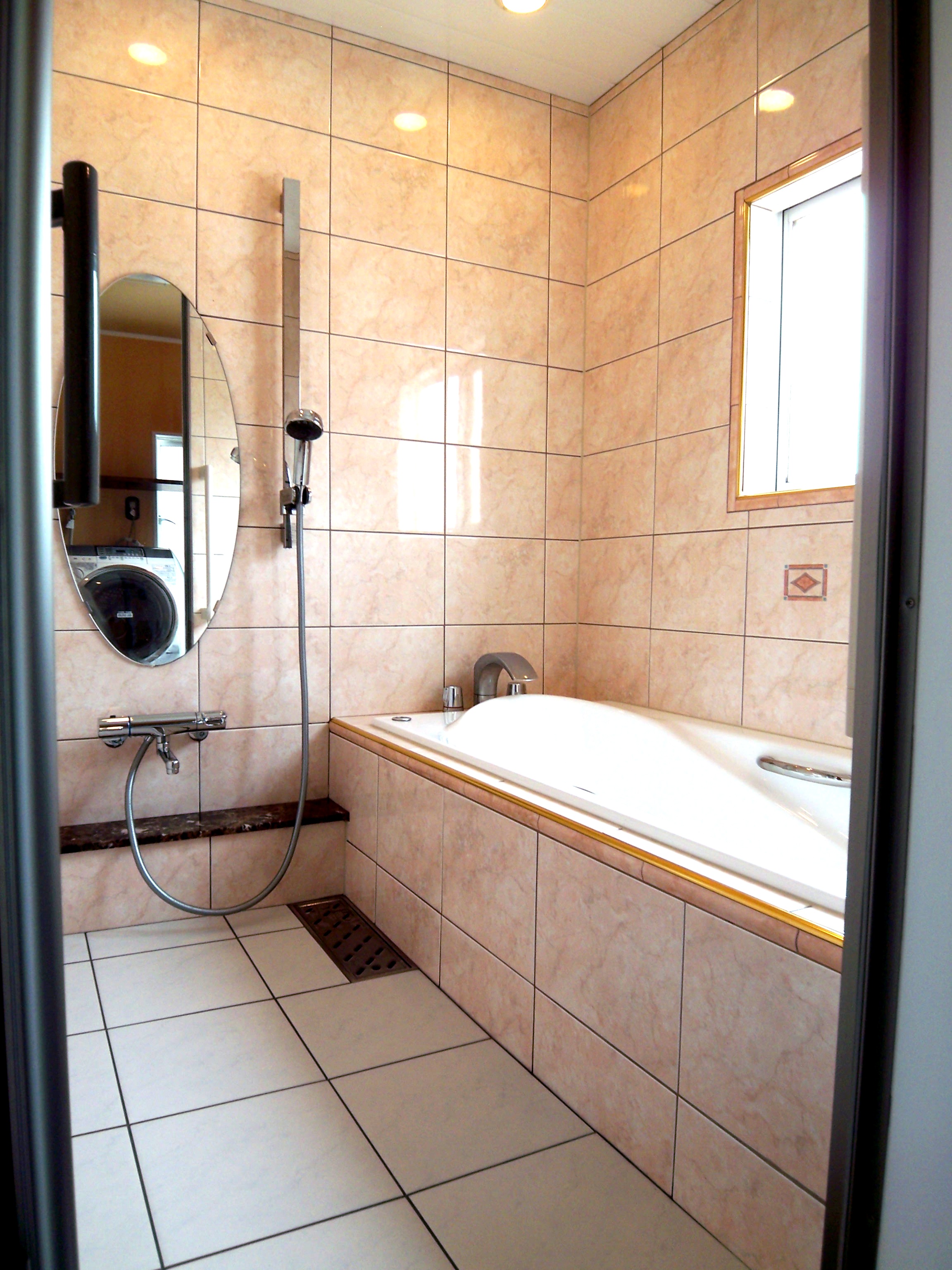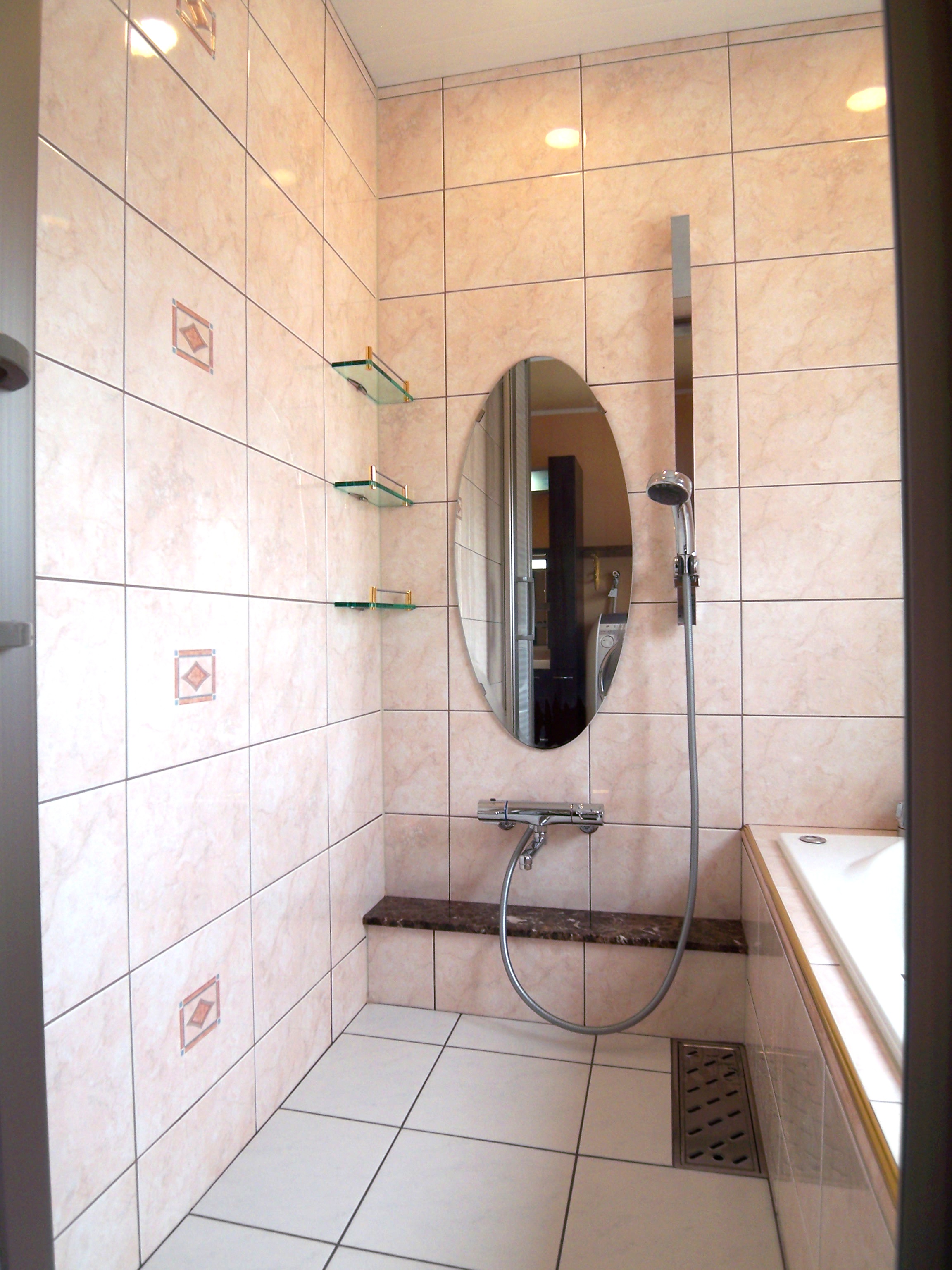バスルームの洗い場もミラーやスライドバーや収納などをひとつひとつ決めて取り付け。装飾性も高めます