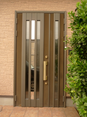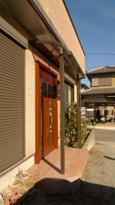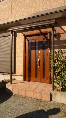 玄関の親子ドア交換にあわせて、ポーチタイルの補修とポーチ屋根の取付を行いました。親子ドアの鍵はなんと、ボタンを押してカードを「かざす」だけのCAZAS付!。ポーチタイルはクルマが敷地奥に入り易いように形状変更と、凍害で割れてしまったタイルの交換。また、玄関に庇をとのご要望でライザーテラスルーフを付けました。見違える出来栄えに、大変ご満足いただけたようです。