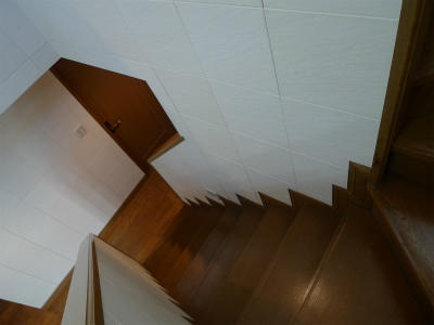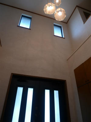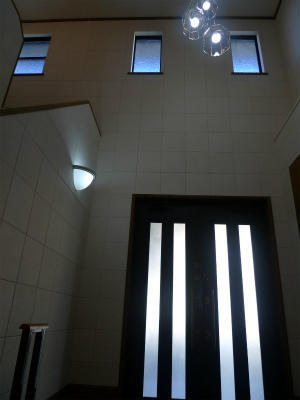 大きな吹き抜けの玄関ホール、玄関に入ってから見える壁面を全てエコカラット貼りにとのご依頼。高さ、面積ともにありますので、足場を組んでの施工となりました。広い面積ですのでタイルも陰影がしっかりとあり立体感のある、大きめ300角のストーンⅡを選ばれました。目地の割り付けには職人も悩んでいたようですが、流石に完成したホールは「圧巻!」でした。