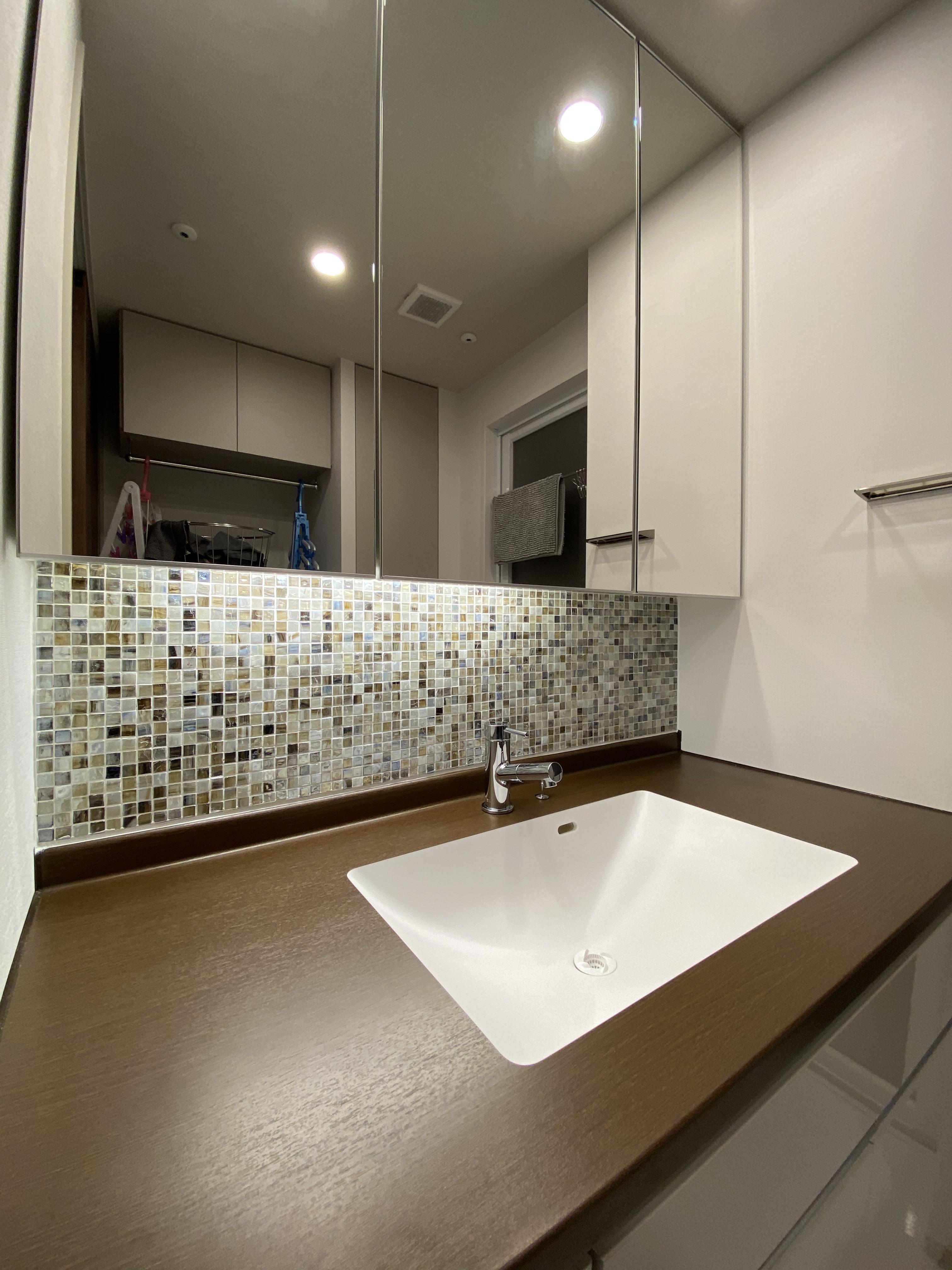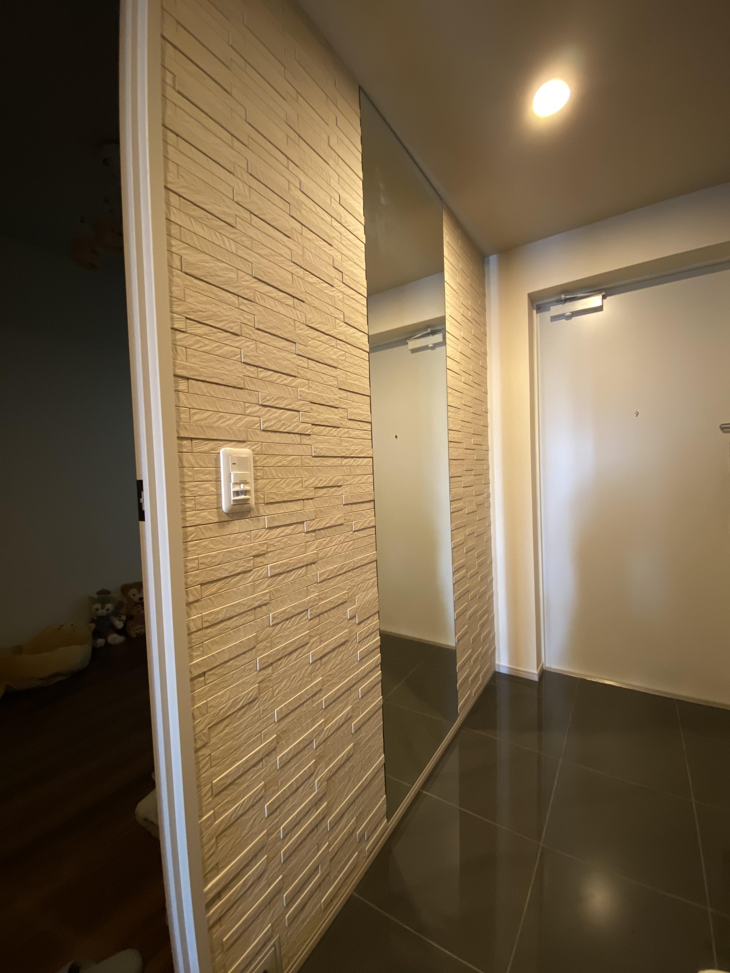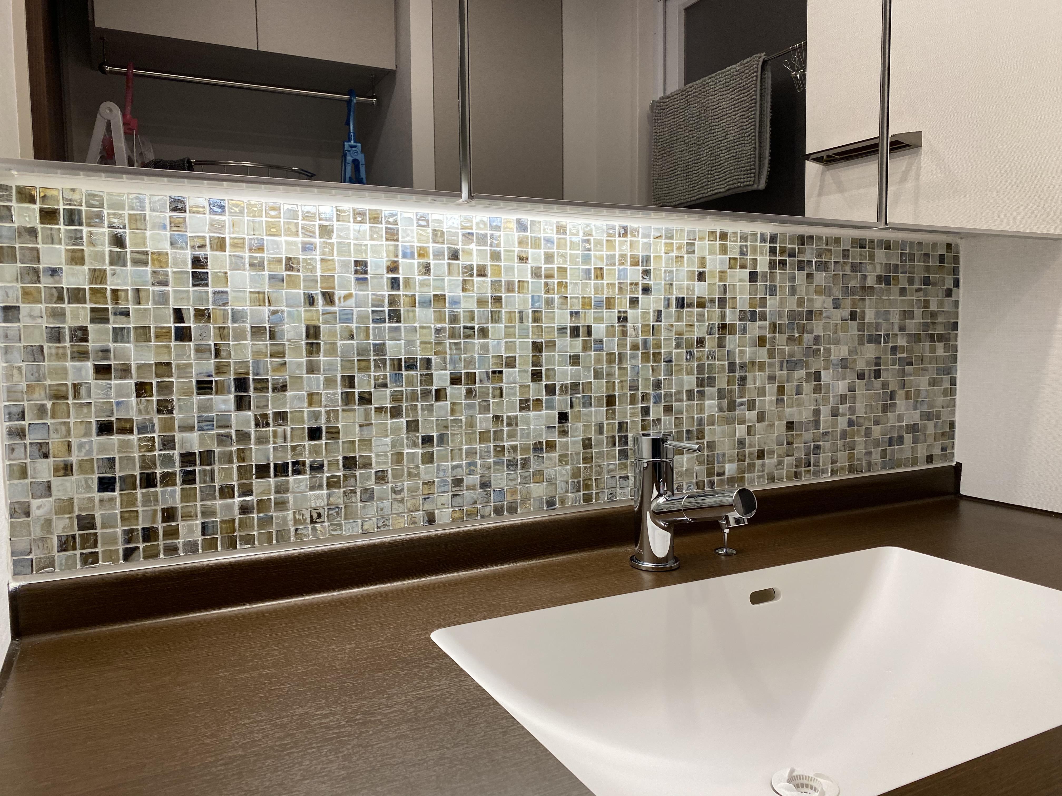 新築マンションを購入予定のお施主様よりお問い合わせ頂きました。弊社施工例にも多く掲載のリビング/玄関のエコカラット工事を行いました。加えて洗面所の一部もモザイクタイルを施工します。
