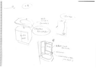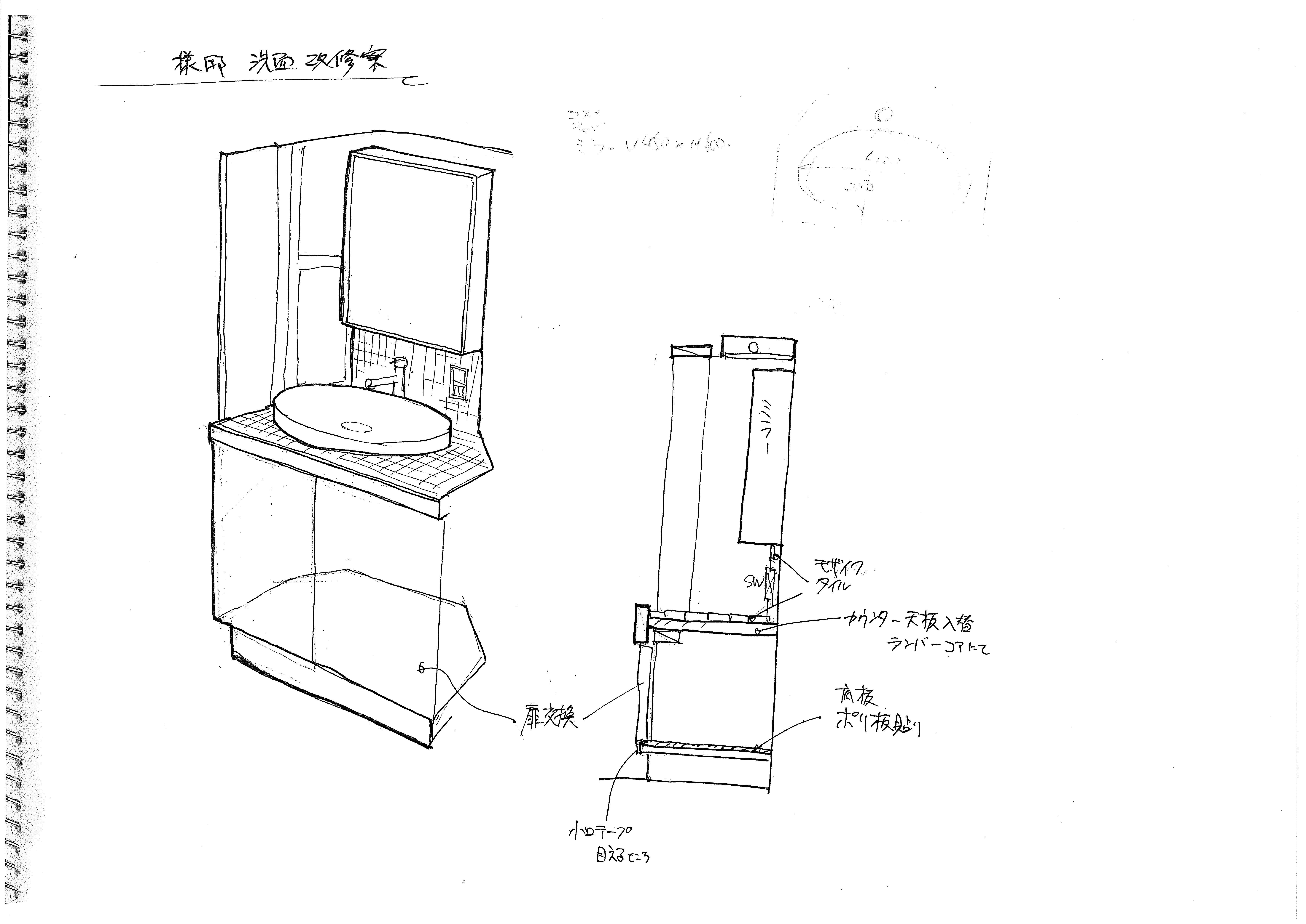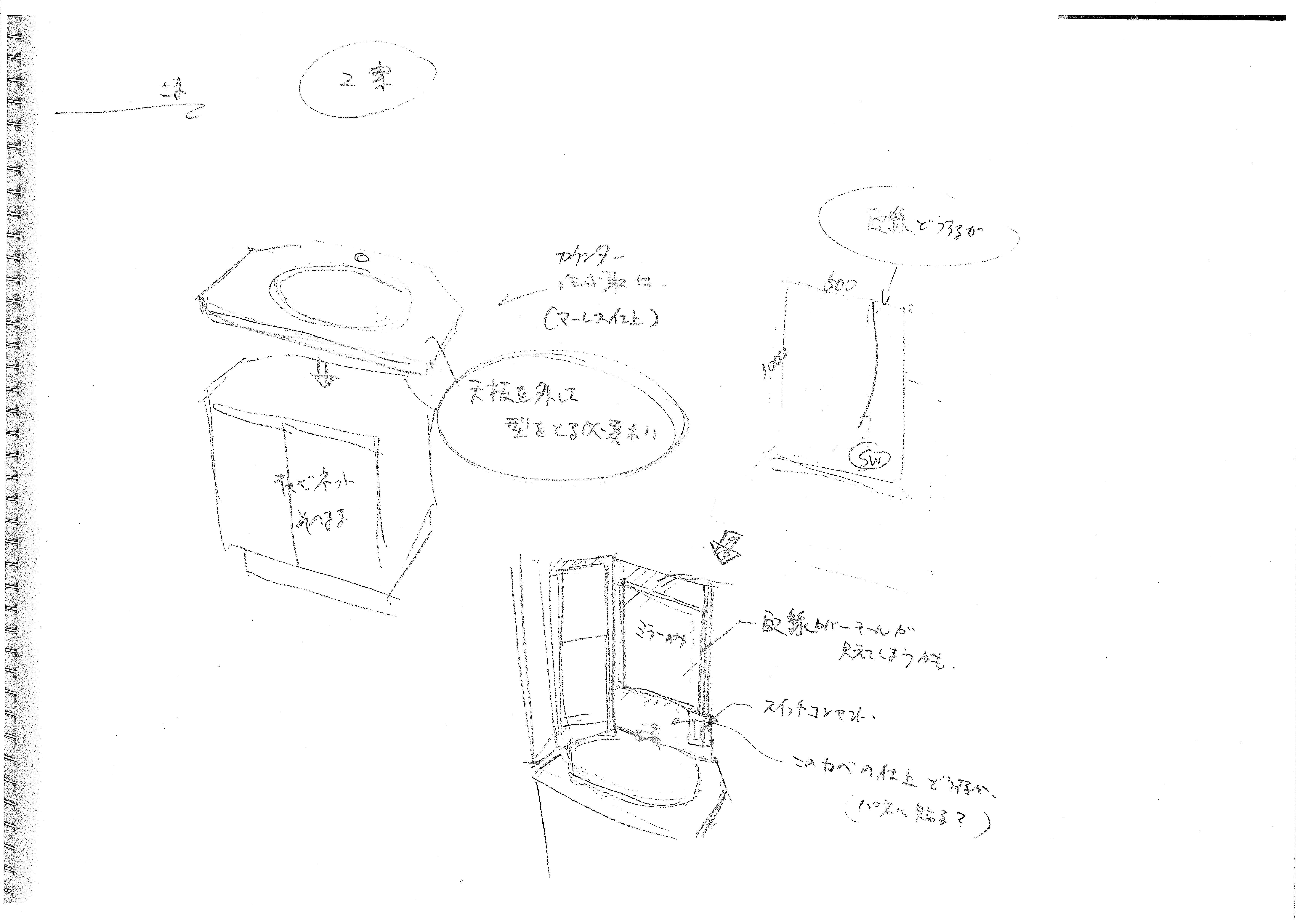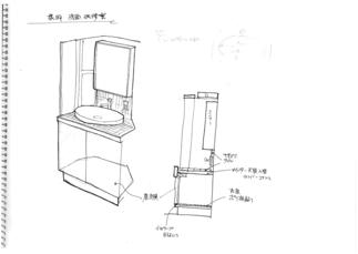 なかなか珍しい納まりの化粧台の為、工事の施工上色々と制約があるのですがメーカーではすでに廃盤の為どのように納めるか思案しました。