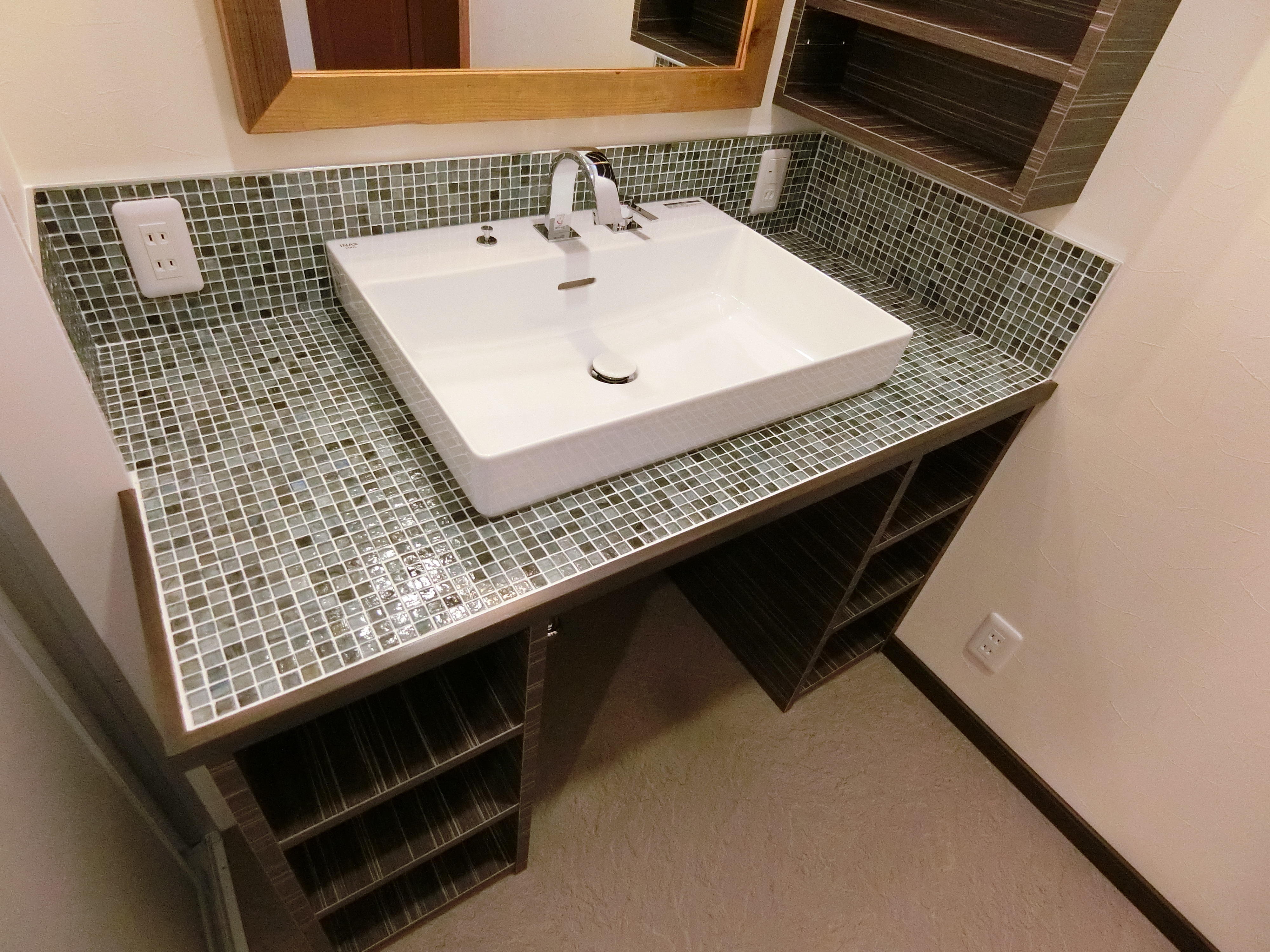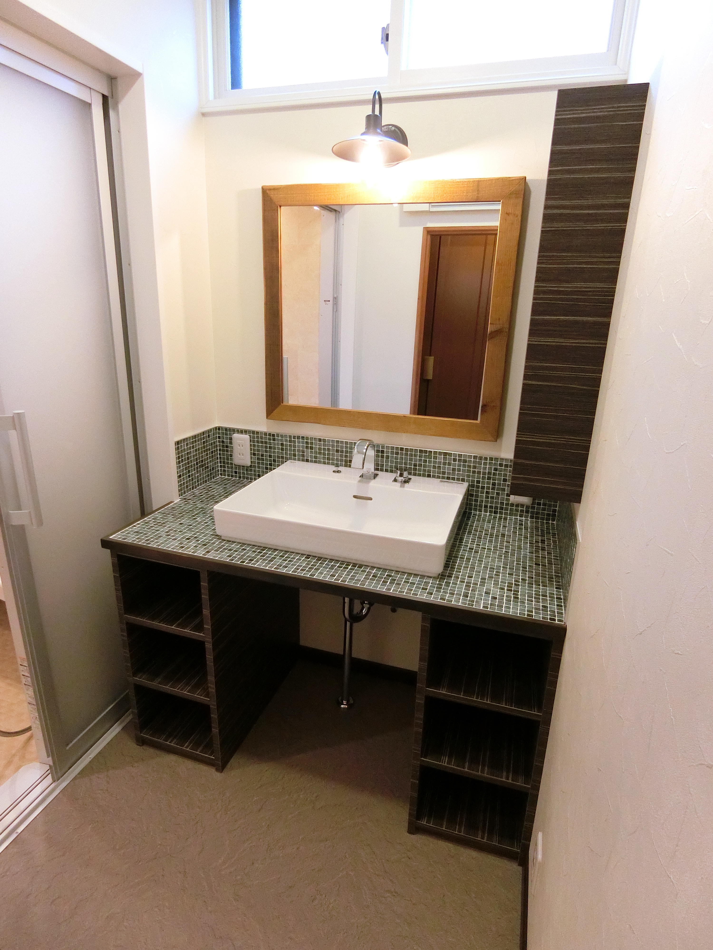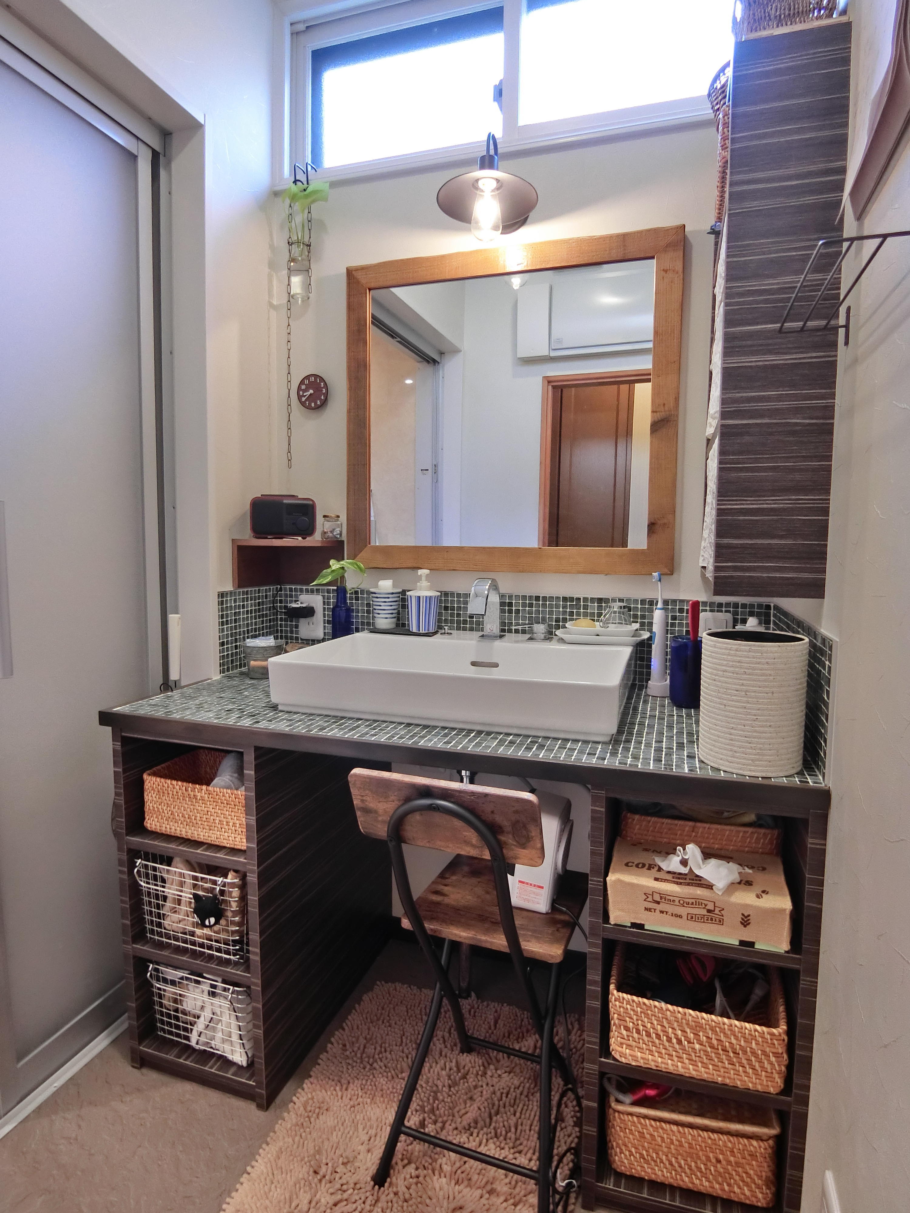 ショールームでご覧いただいた展示品の『スパージュ』の仕様をお施主様に気に入られた為、今回のお話を頂きました。もとから広めのシステムバスであったのですが新築時より20年ほど経過してきた為細かな部分でヘタり始めていました。毎日使うお風呂こそちょっといいモノを、肩湯なども愉しめる『スパージュ』で贅沢にリラックス出来るリフォームになりました。また当初の洗面リフォーム案は当初通常のメーカー品をご提案させていただいたのですがお話を進めるにあたり奥様のご希望が膨らみ洗面台は家具やタイルから製作する造り付けでのご提案をさせてもらいました。