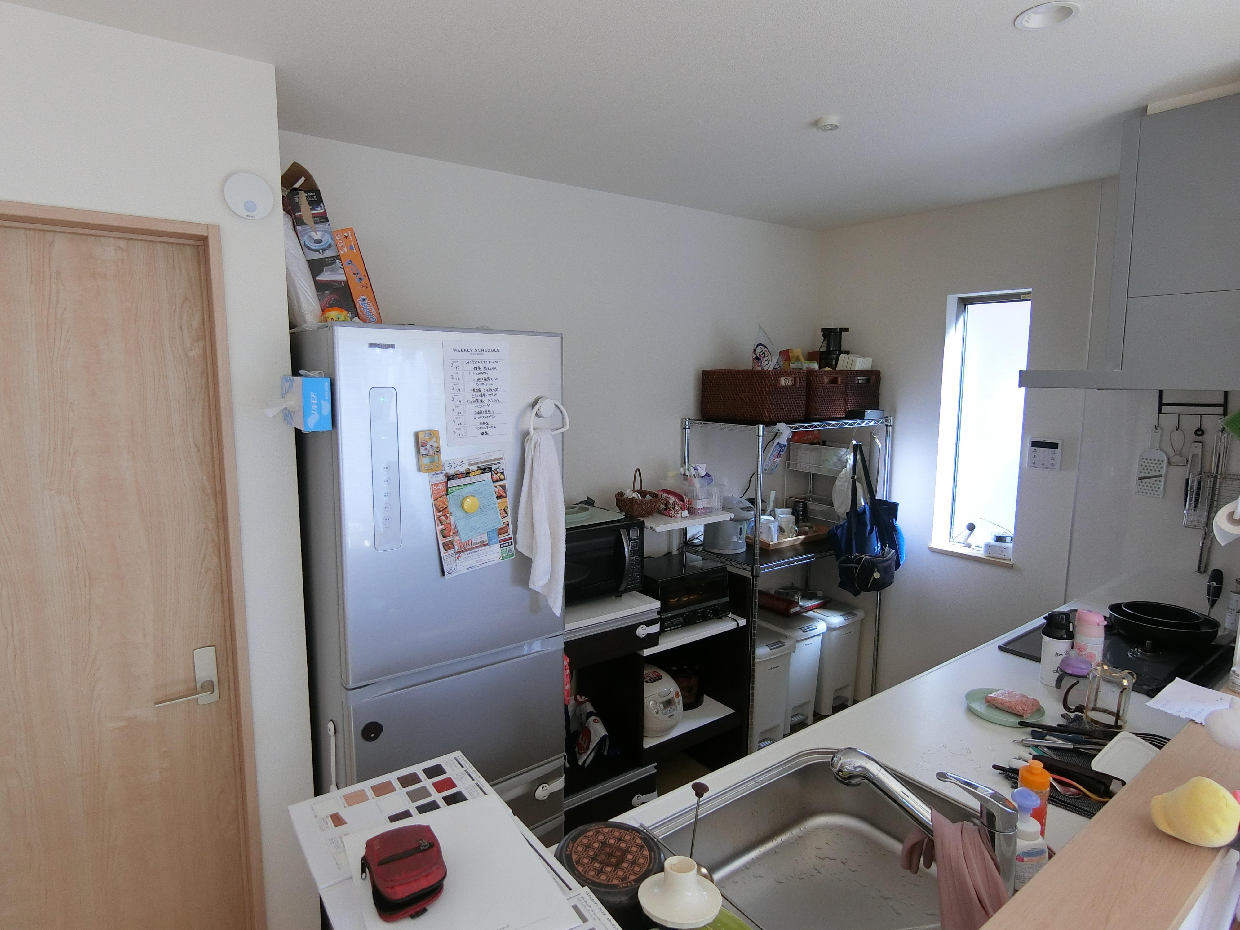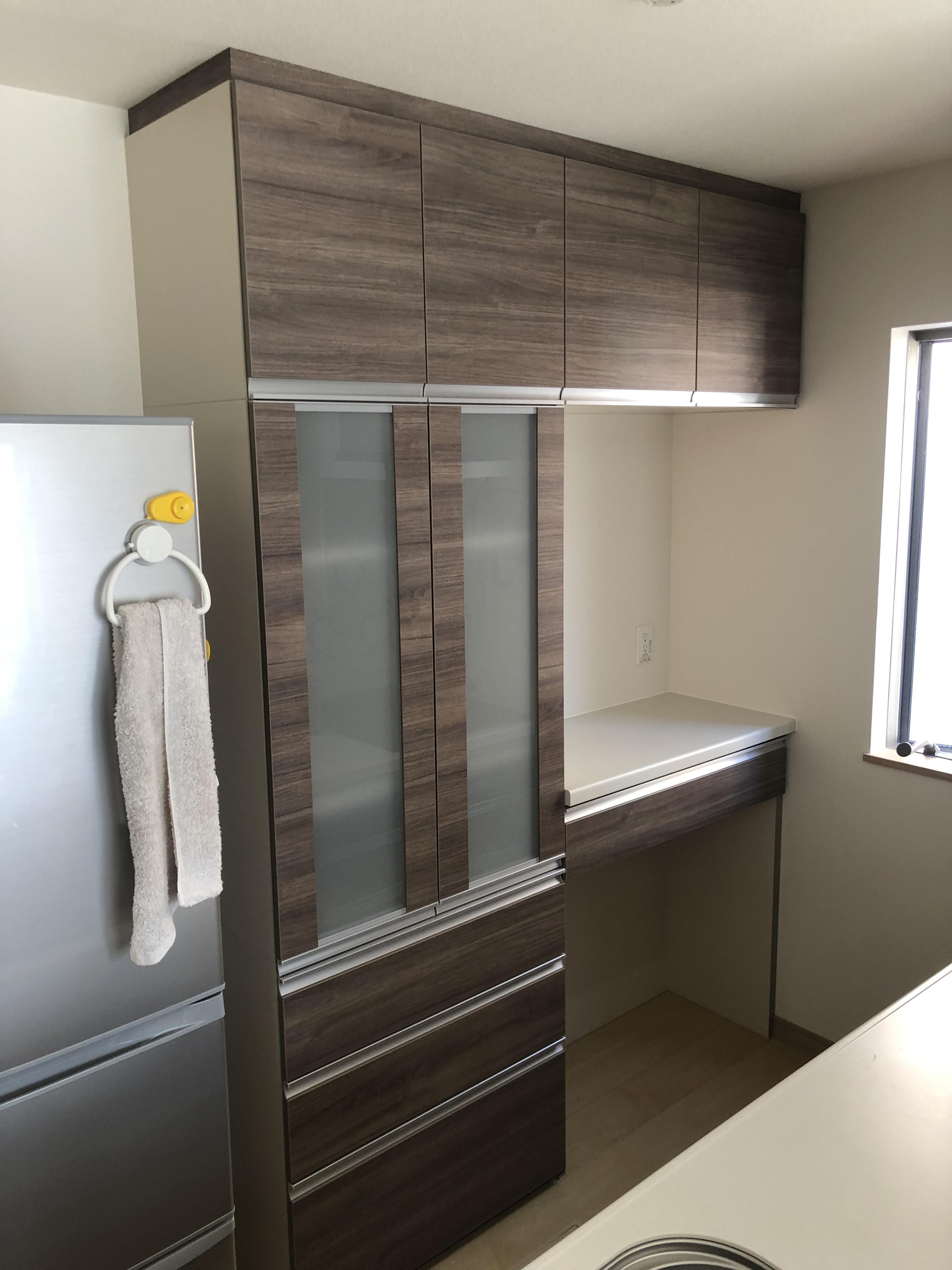 新築を購入されたお客様からのお問い合わせでした。「量販店さんのカップボードではサイズが合わない!」「キッチンと色味を合わせたいけど…」などなど悩んでいらっしゃいました。今回はLIXILのカップボードでお客様希望のサイズ及び扉の色、柄をキッチンと合わせました。さらに、カップボードと天井の10㎝程度の隙間も専用部材で塞ぎました、これで埃がたまる心配もありません。