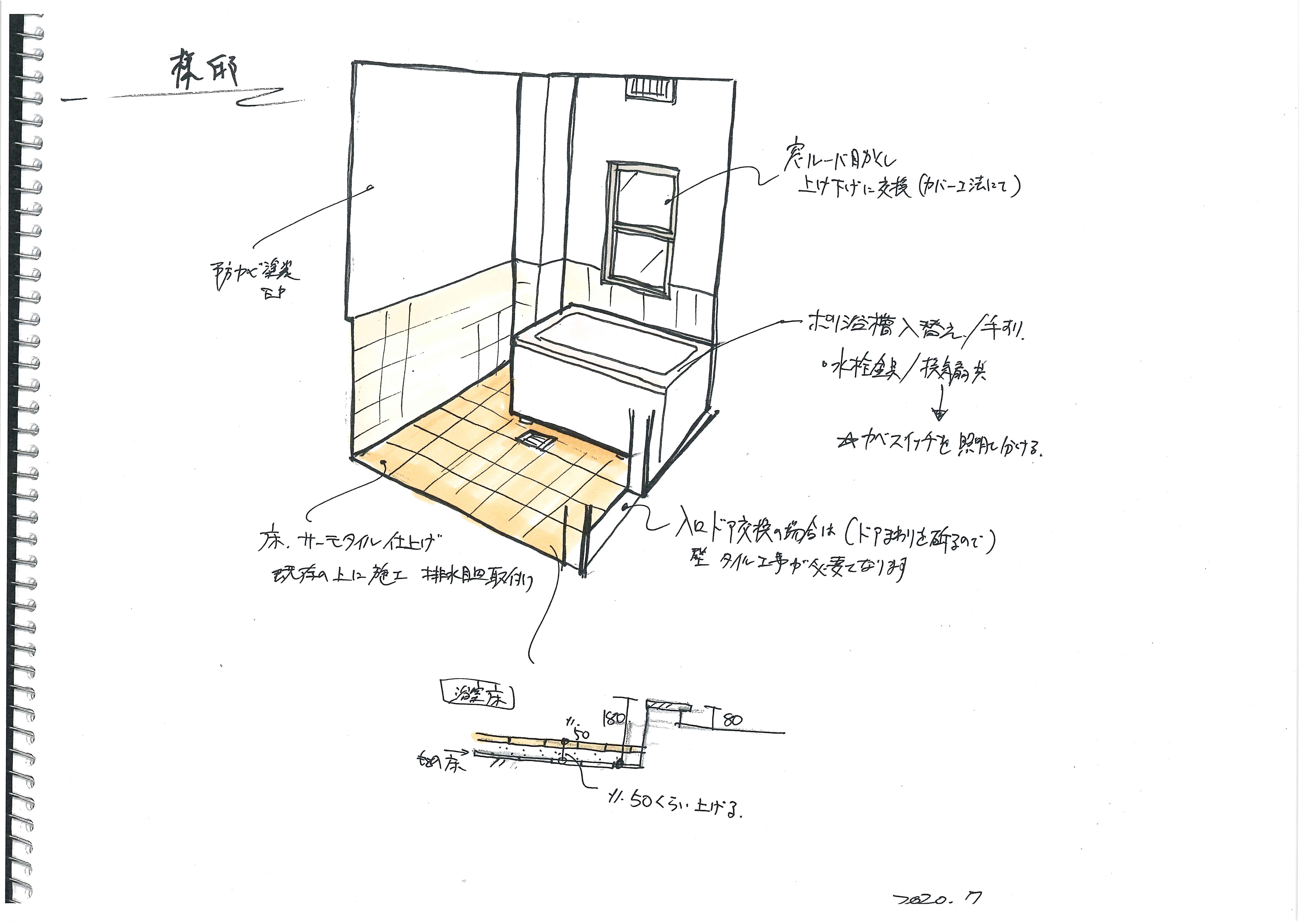 鉄骨造の柱型のある造りで大きさの制約がある為システムバスなどへのリフォームも難しく、なかなかリフォームへ踏み切れずとの事でした。