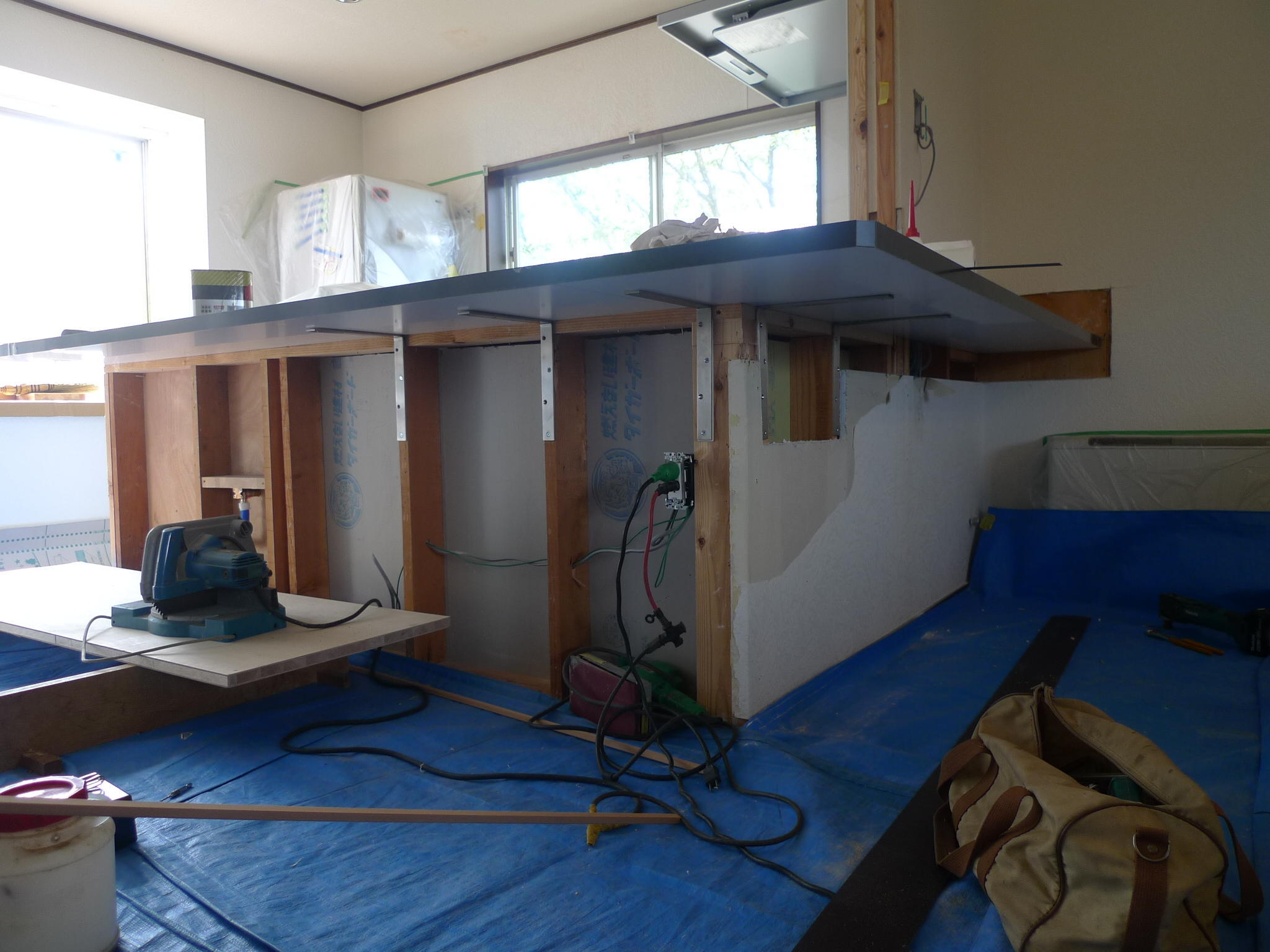 とある山の中腹の、富士山が綺麗に見える別荘地。暫らく使われていなかったお住まいのキッチンをリフォームです。ご主人はこのリフォームを期に、そば打ちを始められたいとのこと。そのためになんとしてもセラミックの対面を実現させてみたい、その希望を叶えるべく作成致しました。その中にはいくつか難しいオーダーも。できれば脚は付けないでおきたい、カウンタートップと机の面が同じであってほしい、などなど。一見シンプルに見えますが、それを実現するにはかなり気を遣う工事でした。作成家具側のカウンタートップはメラミンに。キズが付きにくく熱にも程々強い素材です。何よりも好きな色模様が選べるのが楽しみなところでしょうか。脚をつけないでおくために、壁を補強し、カウンターを固定する金物を多めに入れました。