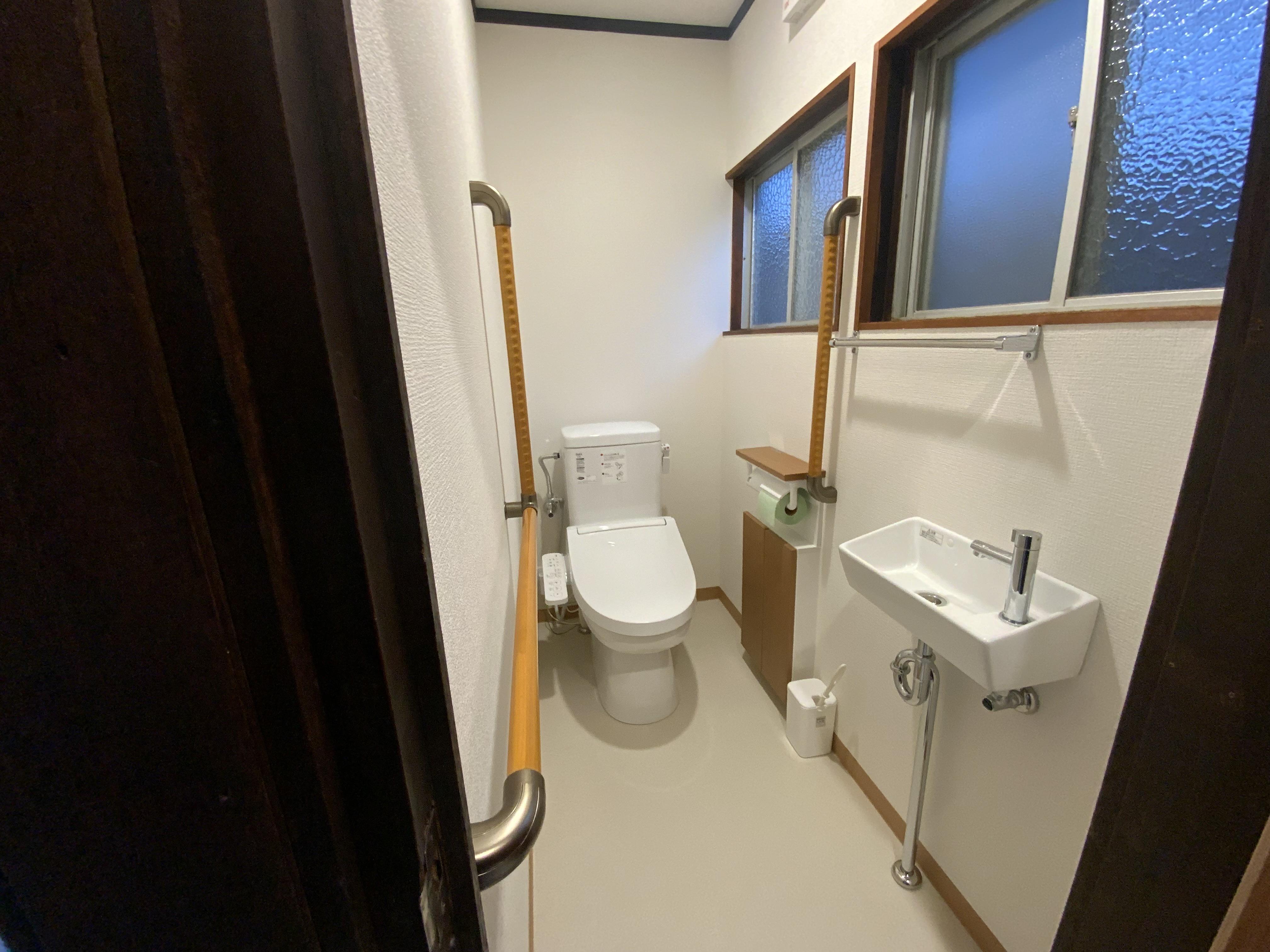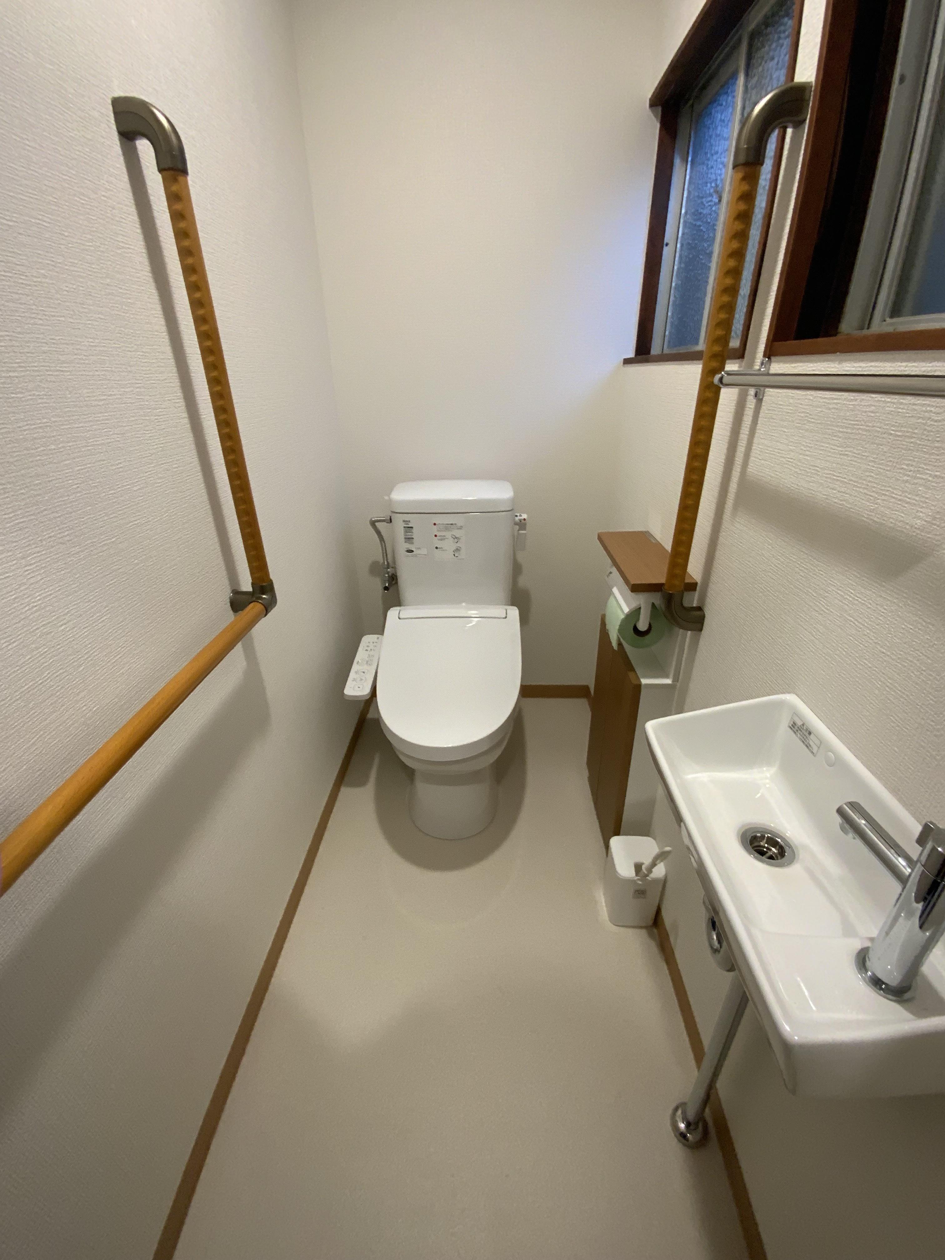 タイルのひんやりとしたトイレから、新築同様のトイレへと生まれ変わらせました。 元々は2室に分かれていたトイレを1室にし、広々とした空間へ。 今後のことを見据えて手摺も設置。