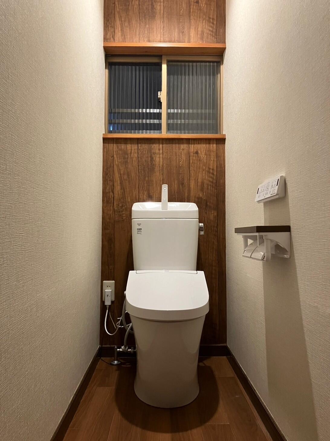 トイレ交換工事と併せて天井壁床を貼替させていただきました。 1日あれば、トイレ室自体を今までとは違う新しい空間に生まれ変わせることができます^^