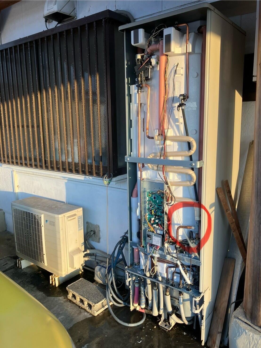 今回のご使用していらした エコキュートは少し前からタンク側の内部から(写真の赤丸しるしの銅パイプ箇所から)漏水をしていた様です。 タンク下の基礎コンクリートがいつも濡れているなどありましたら、早めに機器の点検を依頼した方が良いかと思います。