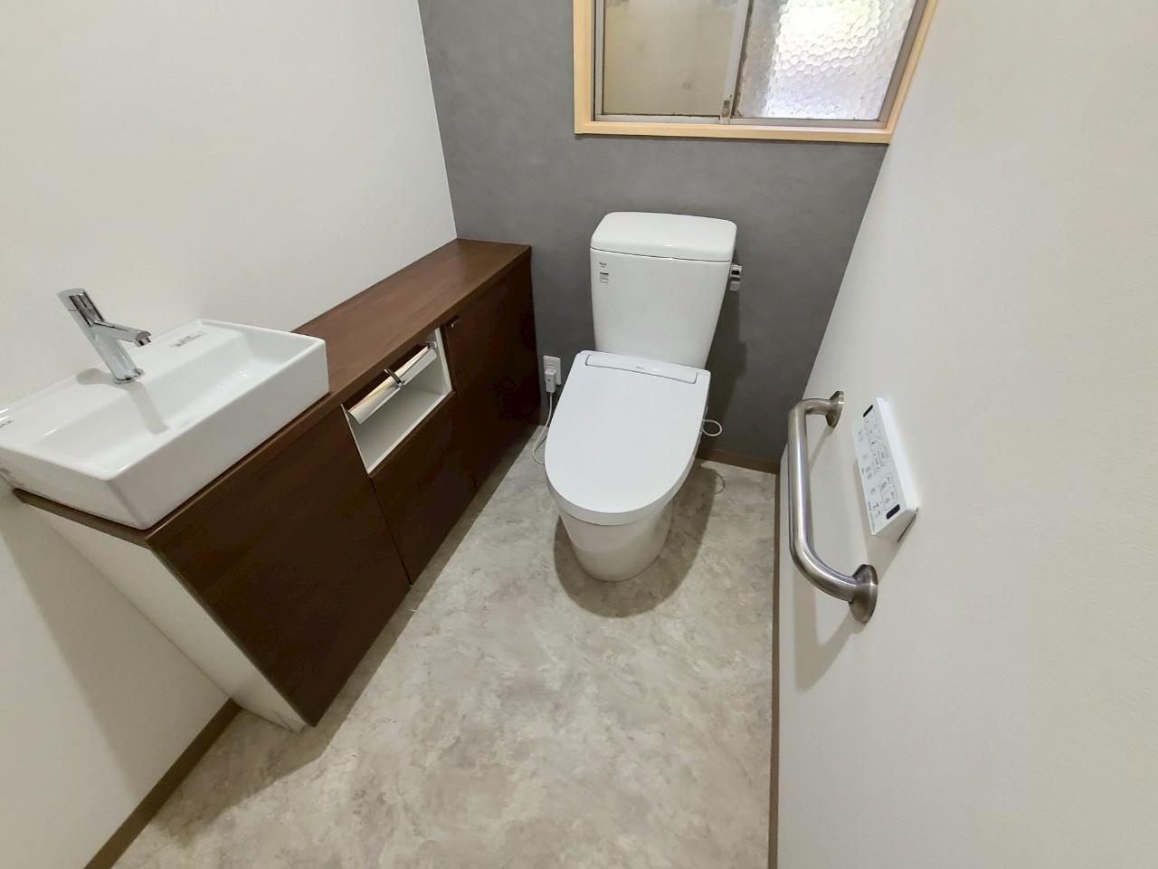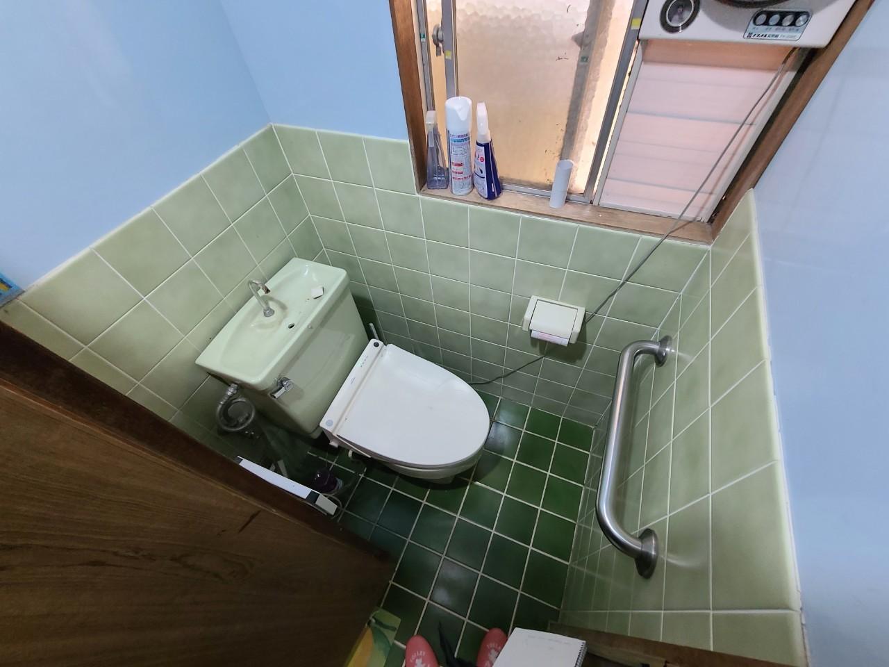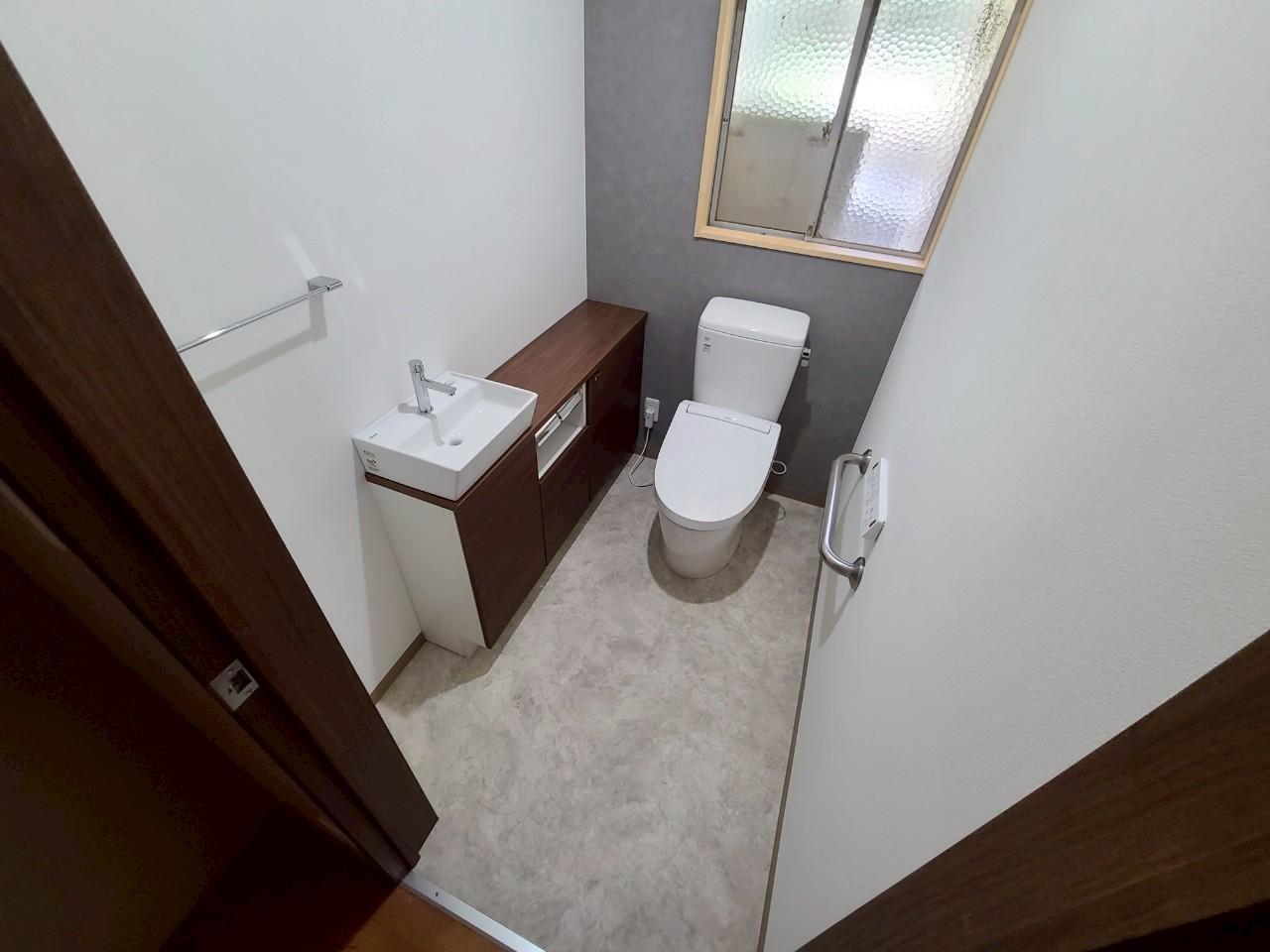 在来の床と腰巾木がタイルで出来たトイレ(パーテーションで間仕切られた2室)を下地まで解体して改修。廊下-トイレ間の段差を解消し、廊下の飾り格子を撤去して、廊下幅の拡張を行いました。 床と外壁面には断熱材を敷き、窓も断熱性の良いものに取替え、断熱性をUP。トイレ内で間取りを変更し、より広く快適に使用できるよう工夫しました。 室内扉と、玄関扉は、現状の周りの風景になじむような物を選定し、気密性、断熱性共により良いものを選定させて頂きました。