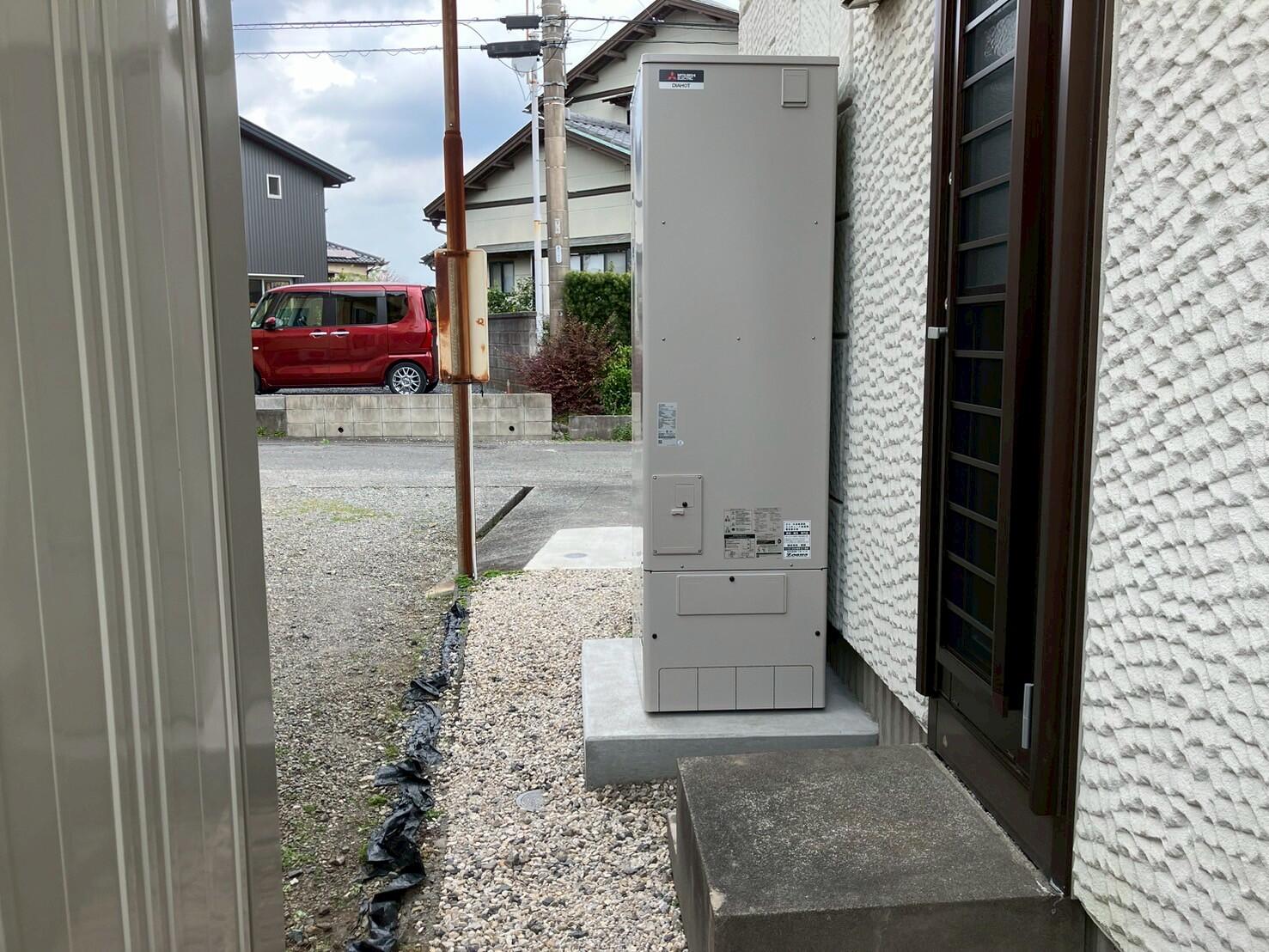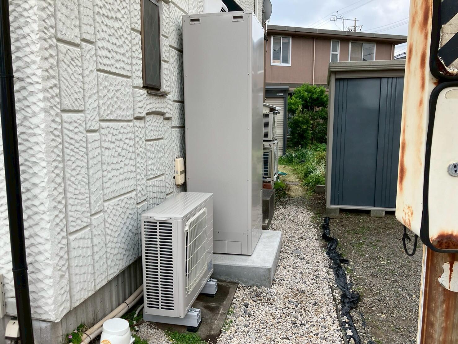 お電話でのご依頼日にはすでに既設エコキュートがお湯を作れない状態でしたのでガス給湯器の仮設をさせていただきました。 今回の様なタンク下の基礎コンクリートの片側が沈んでしまった場合の取替時の修繕も承れますのでご依頼下さい。