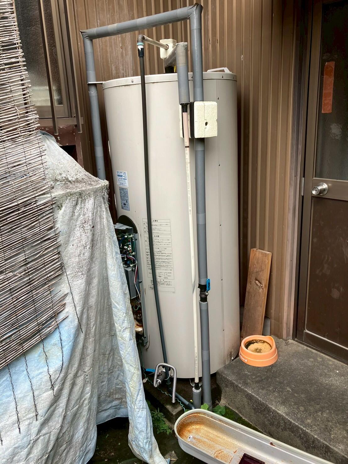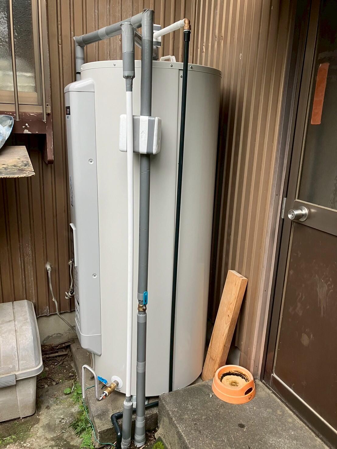 こちらの様な電気温水器の取替を承る施工業者は、年々少なくなっているようです。 当社ではこの丸形タイプは長府製作所と三菱メーカーの品をご用意出来ます。お取替のご依頼や点検は是非当社へご連絡下さい。 ※今回も仮設の給湯器を付けさせていただきました。