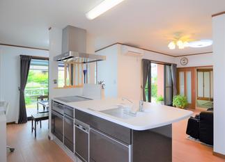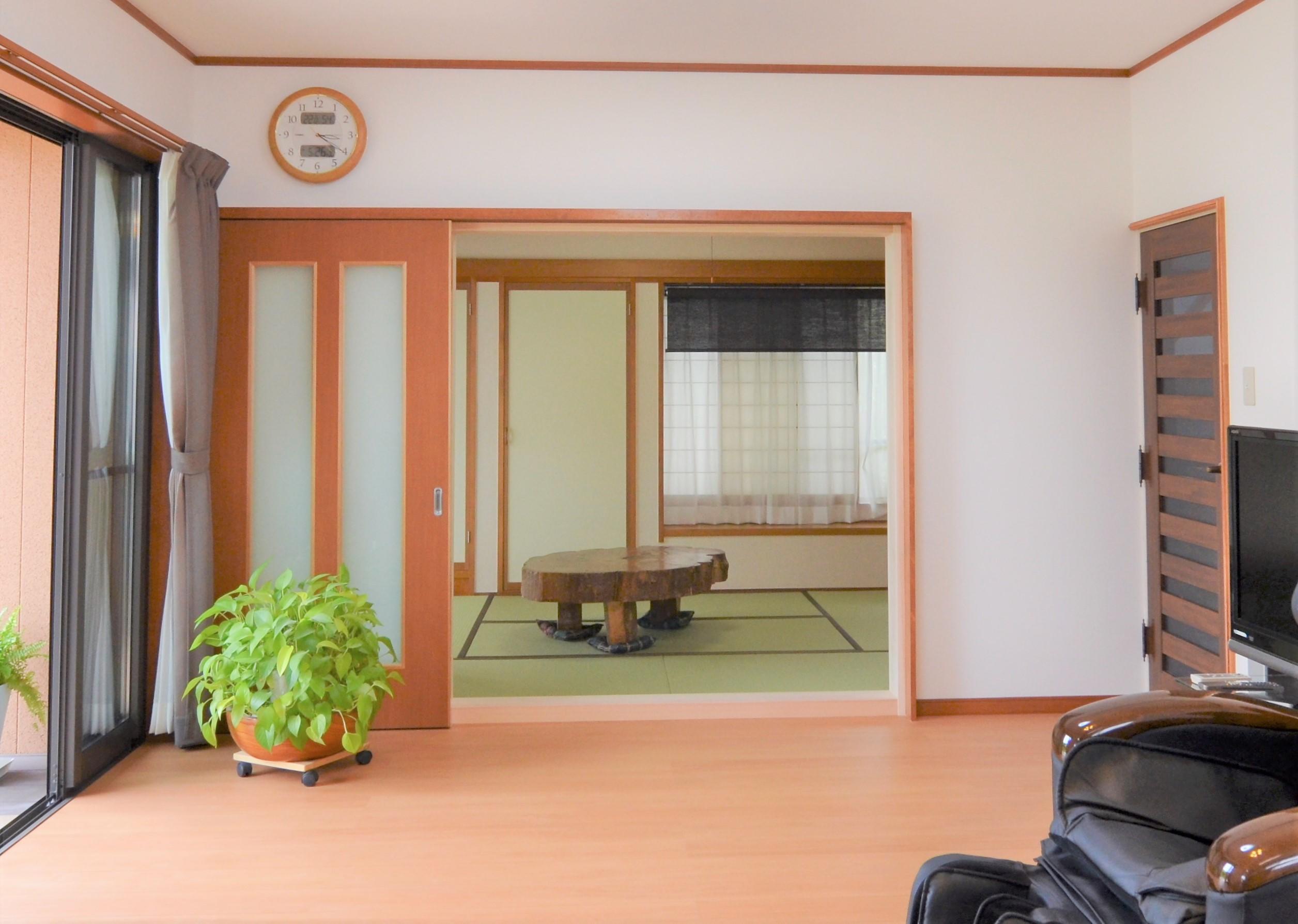 工事途中では、南側の外壁やキッチンとリビングの天井や床がなくなり柱だけになってしまって大丈夫だろうかと心配になりましたが、出来上がってみると、とにかくリビング明るくてキッチンから和室まで素通しになって広く感じるので、リビングにいる時間が楽しくていつもワンちゃんと一緒にくつろいでいます。