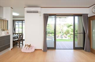いつも暗いリビングを明るくする事に重点を置いて、リビングを暗くしていた壁を撤去しサッシを取替え、庭に設置した広いウッドデッキと一体感のあるリビングををイメージしました。