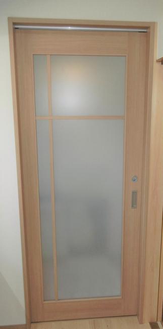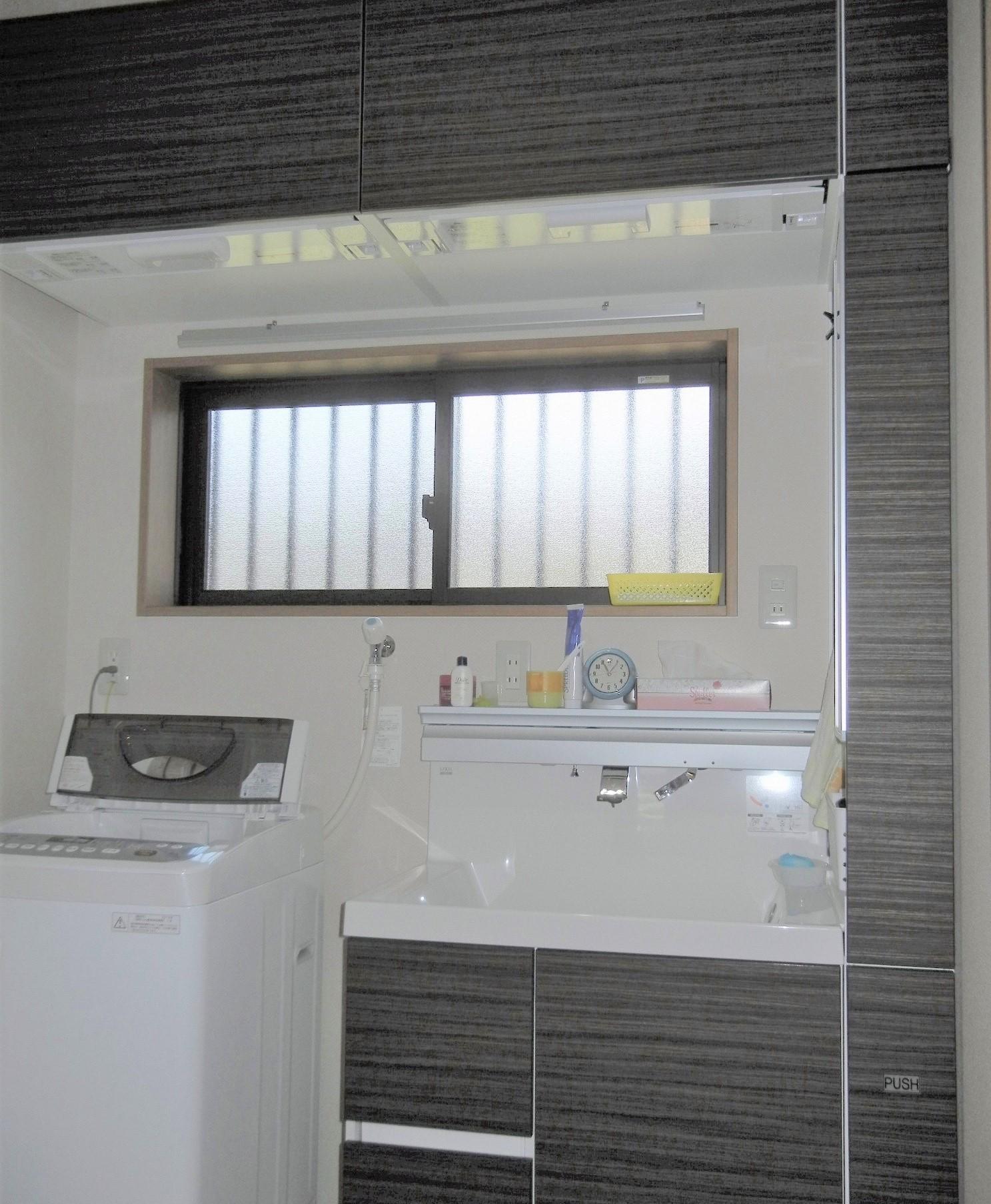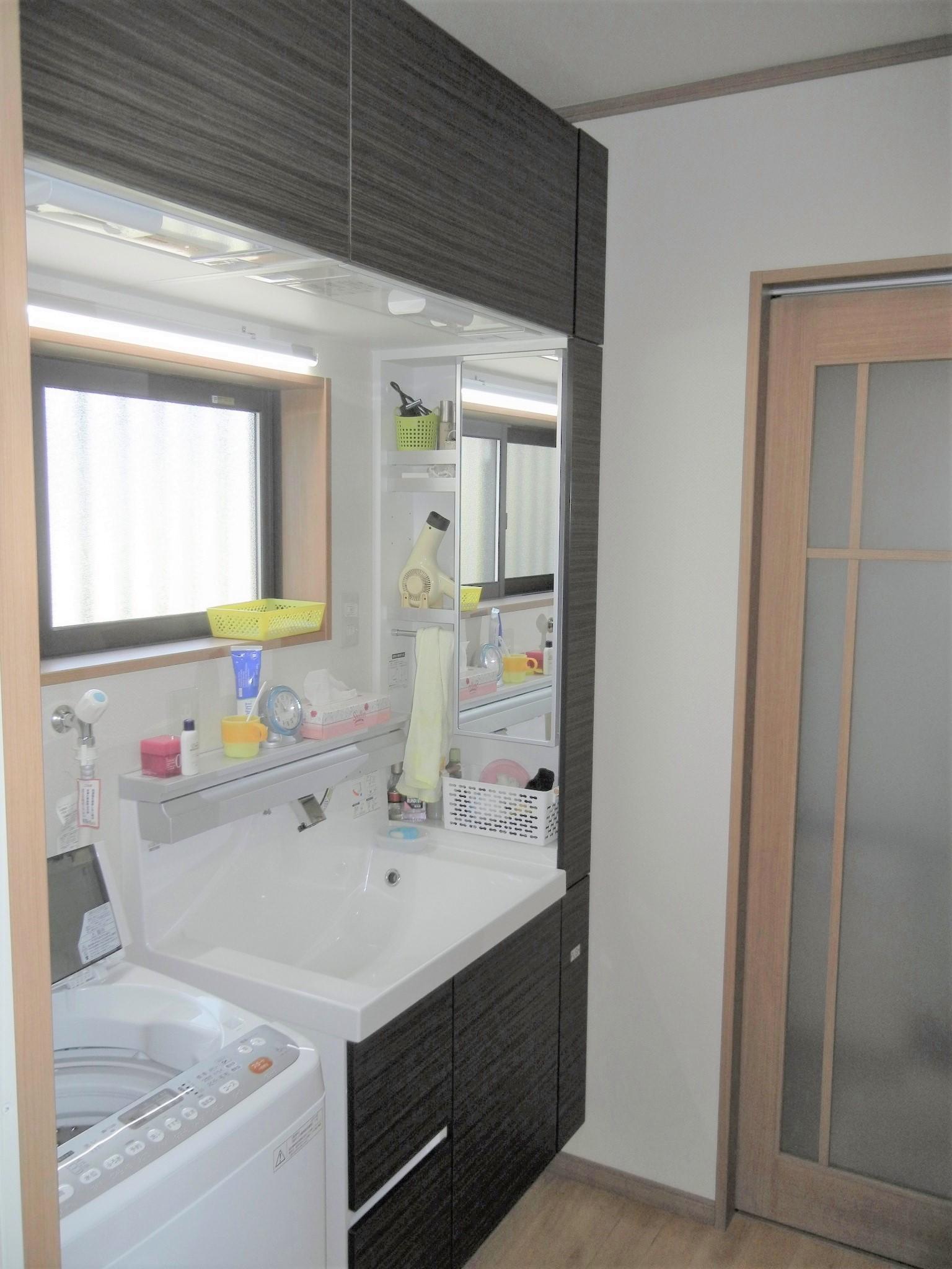 洗面所からトイレ前を通って浴室がある少し前のホテルスタイルかと思いますが、トイレと浴室の境がシャワーカーテンのためお客様の訪問時など不便さを感じる空間になっていました。今回は浴室・洗面所・トイレ全体のスペースは変えずに、配置を変えることですべての不便さを解消するプランにしました。また今まで冬場の寒さがかなりつらかったとの事だったので、サッシは全てペアガラスに取替え、少しでも明るくするためサイズも今までより大きくし、またお施主様に建具のデザインを描いてもらってこだわりのサニタリースペースにすることが出来ました。