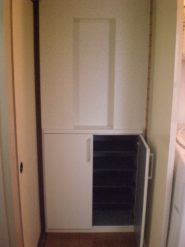 玄関からまっすぐ寝室につながる廊下を、新洋室から寝室へ移動できる開口を作り、廊下の一部を、玄関収納と棚を作成し、靴の整理をしやすくしたと同時に、裏の寝室からも収納が使えるように、収納の工夫をさせていただきました。
