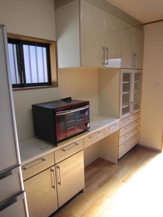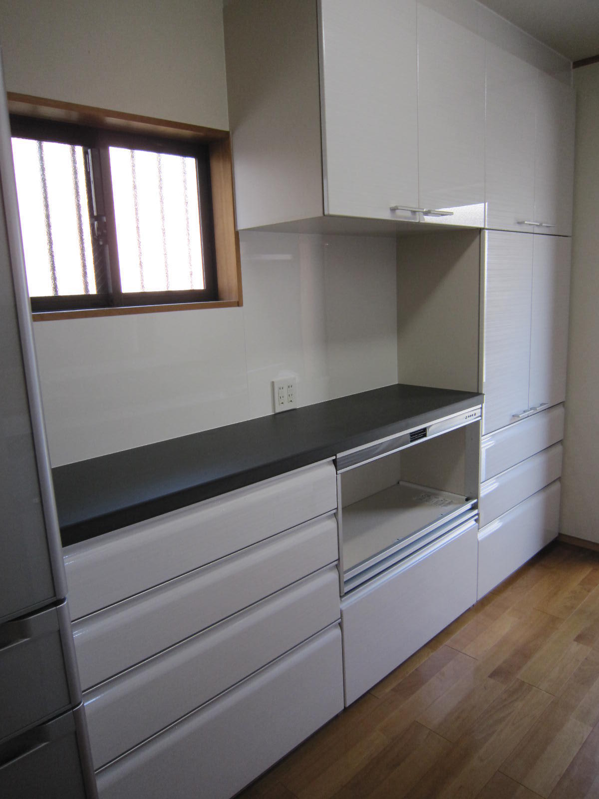 気になっていたガスコンロもIHに交換し、安心してお料理が楽しめます。扉の取付が悪かった背面収納もご一緒に改修し、快適に収納できるようになりました。