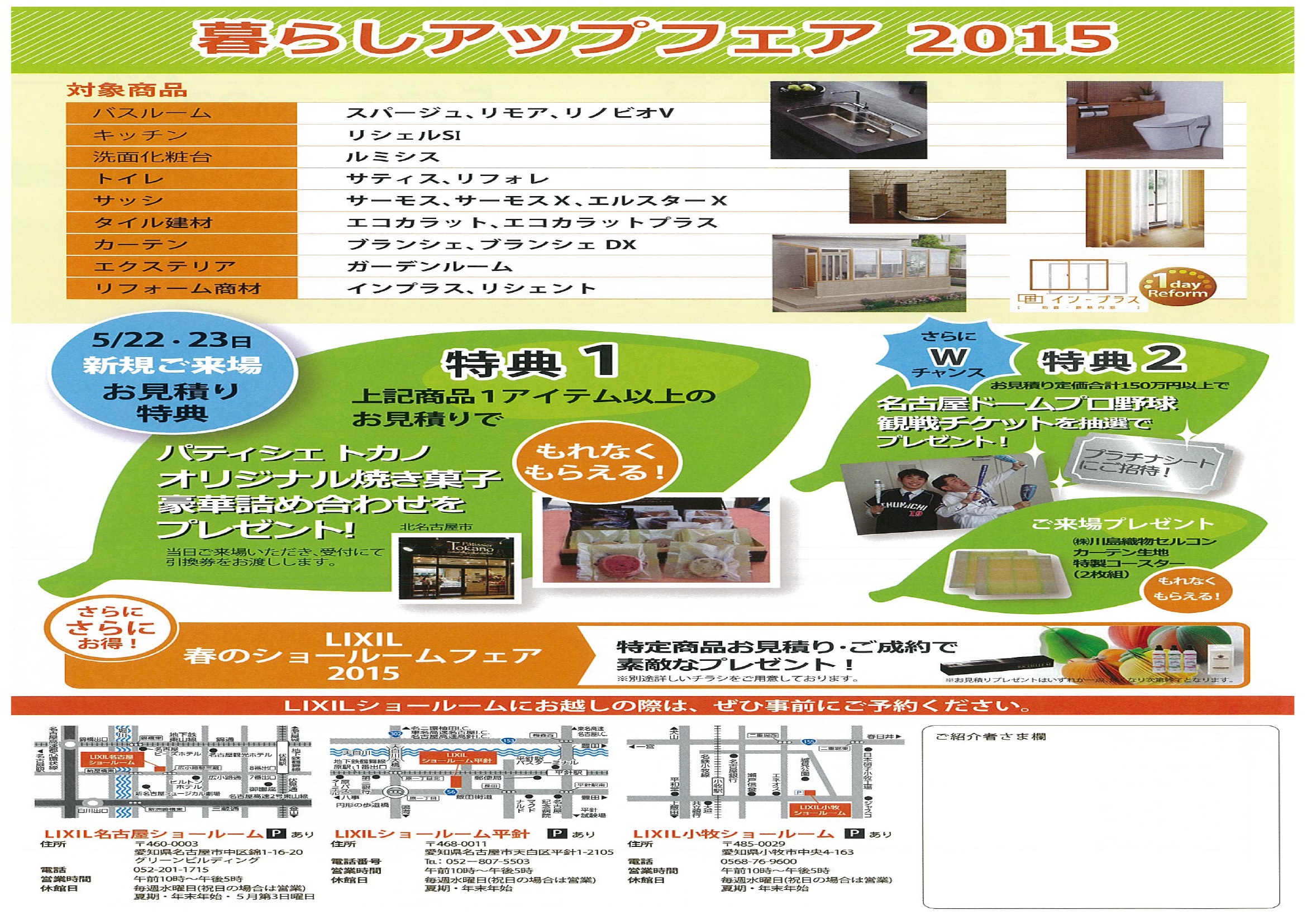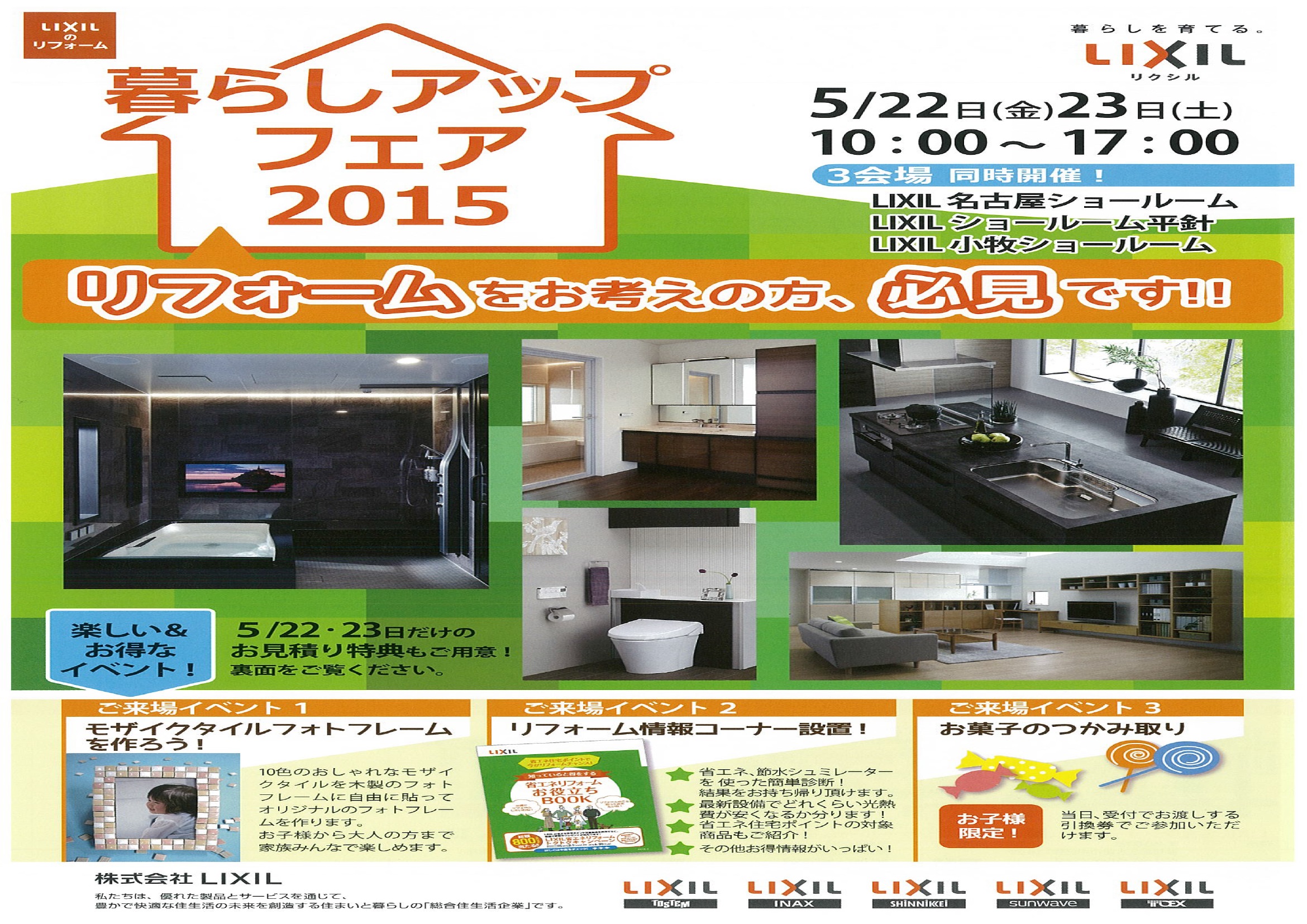 5/22(金)・5/23(土)10:00~17:00よりLIXIL名古屋ショールーム・LIXILショールーム平針・LIXIL小牧ショールームにて【暮らしアップフェア2015】を開催しております。