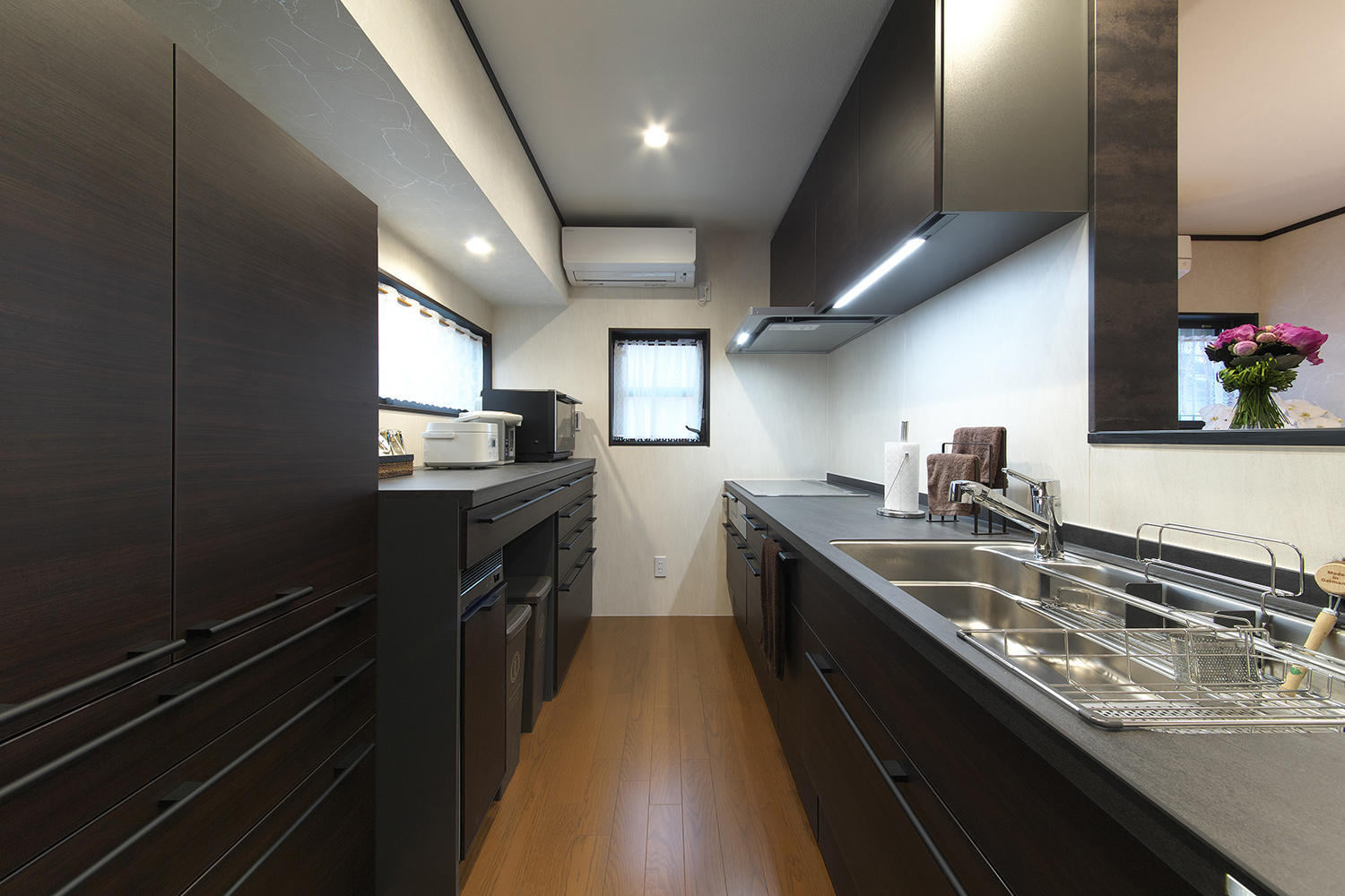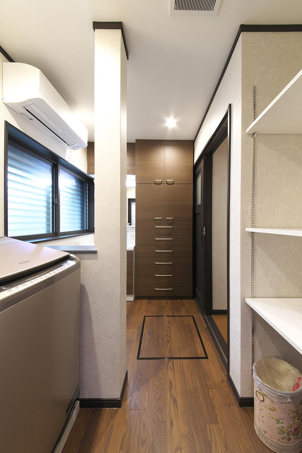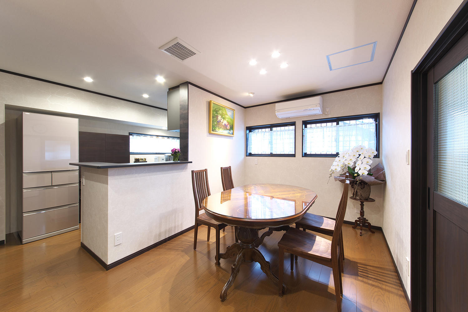 複層ガラスサッシ 壁天井 そして床下の断熱工事 自然の空気を取り入れながらも 全室に エアコンを完備して 全室温度が均一になるよう健康配慮がされています。収納はしっかりとの要望で キッチン横 洗面所 などたくさん収納をつくりました。特に キッチン横の3連戸の収納庫には食器 食品 たくさんのものが入ります。洗面収納は ご家族分のそれぞれの衣服が すぐにとりだせる 引き出しなど 使いやすさにも工夫しました。帰宅後のご主人のアウターも 玄関横にすぐに収納することができます。 お施主様のこだわりは 和です。解体すると立派な大黒柱に 大きな梁があり これを利用して間仕切りも大変な作業でしたが お客様にご満足いただける仕上がりとなりました。キッチンはリシェルSI セラミックトップです。ショールームで打ち合わせをした初回に 一目で気に入っていただき採用をいただけました。奥様よりとても使いやすいとおっしゃっています。