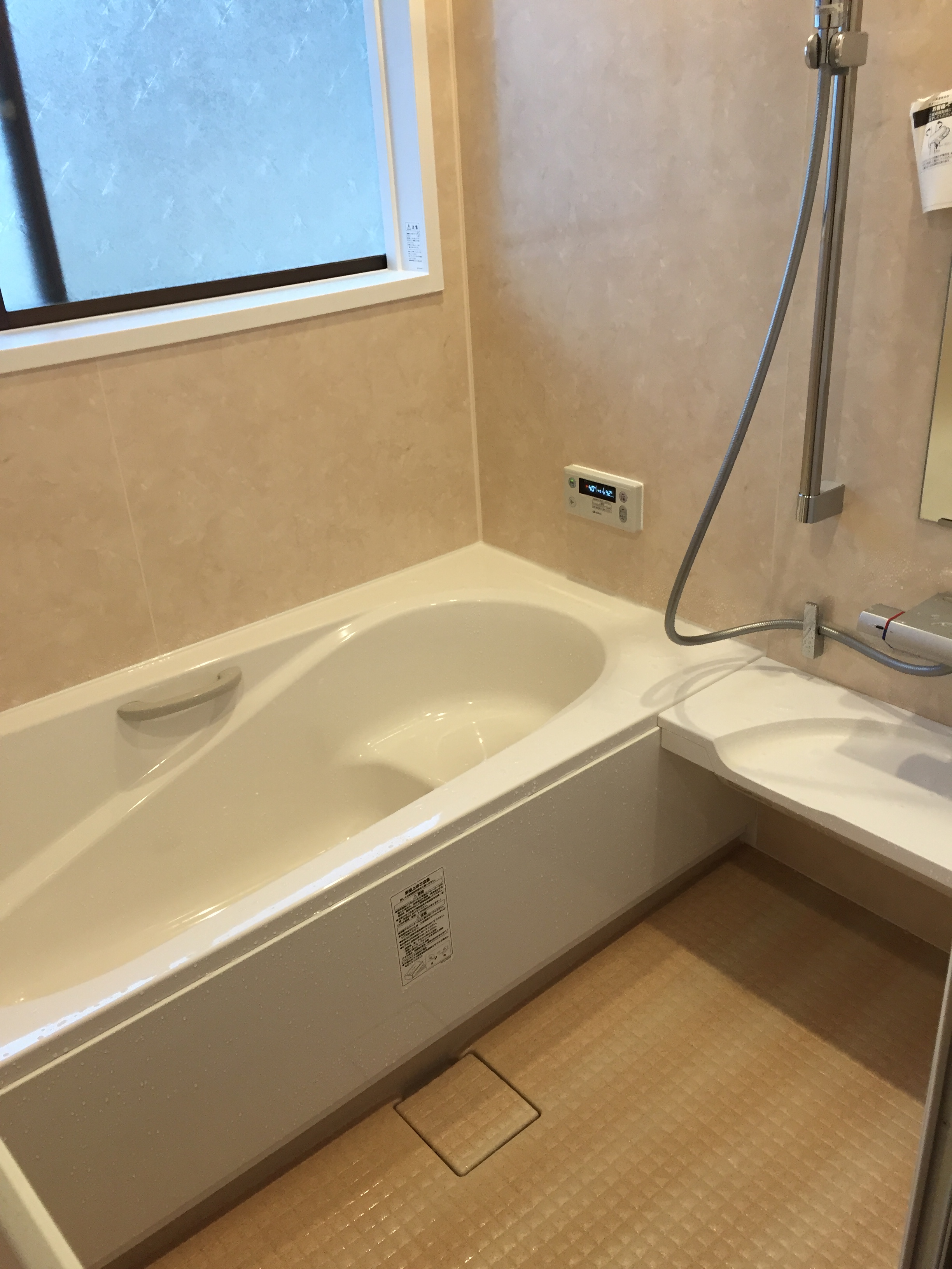 タイル張りの在来浴室をシステムバスにリフォーム。浴室暖房乾燥機付きで冬の入浴も安心です。