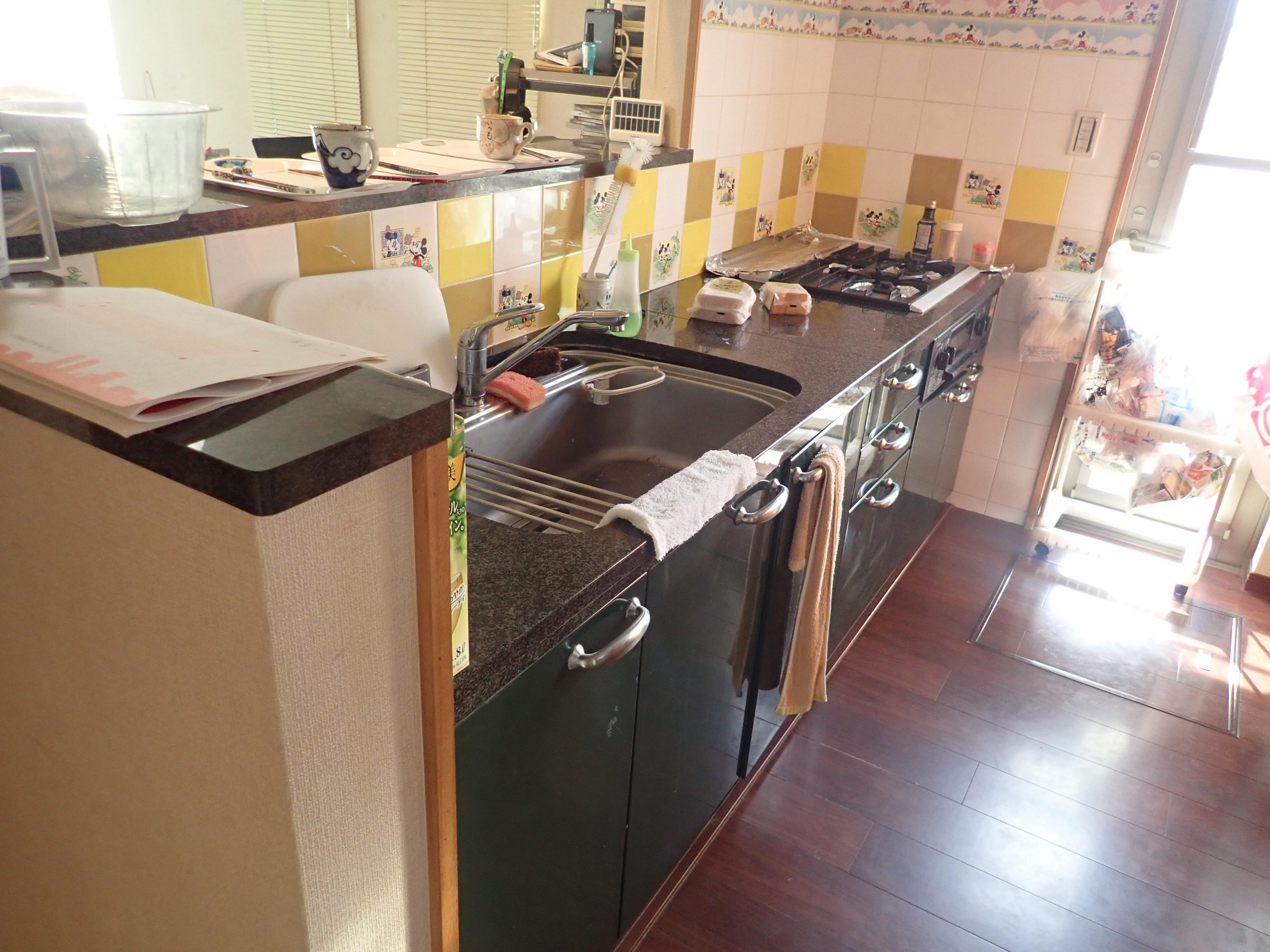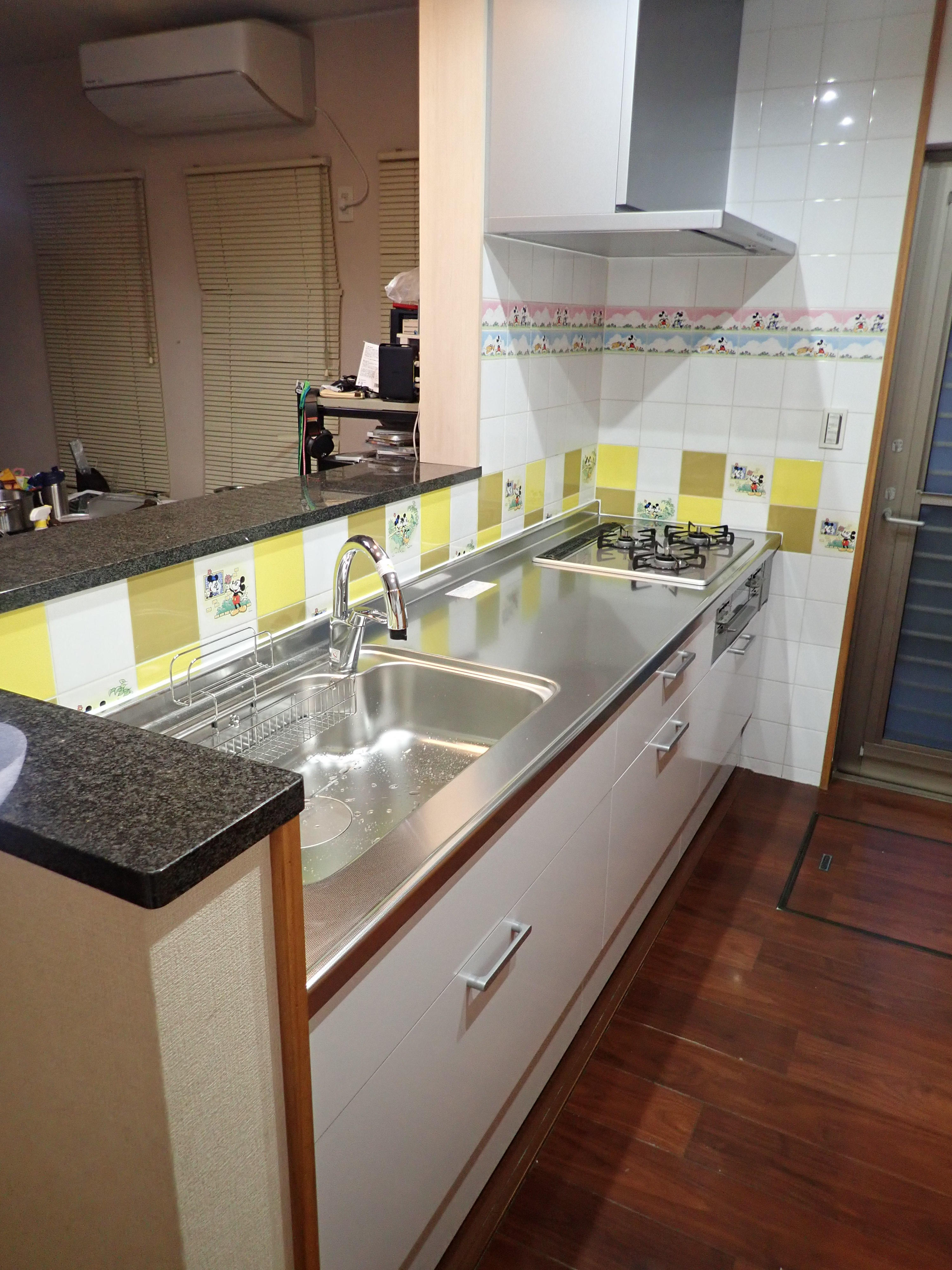こちらの新しいキッチンは、LIXIL≪アレスタ≫I型です。今回奥様の1番のお気に入りはやはり革命的換気扇の【よごれんフード】です。リフォームされる方の中ではとても人気があります。かわいいキャラクターの絵柄のキッチンタイルはそのままにし、キッチンのカラーを正反対にしたことで明るくなりました。