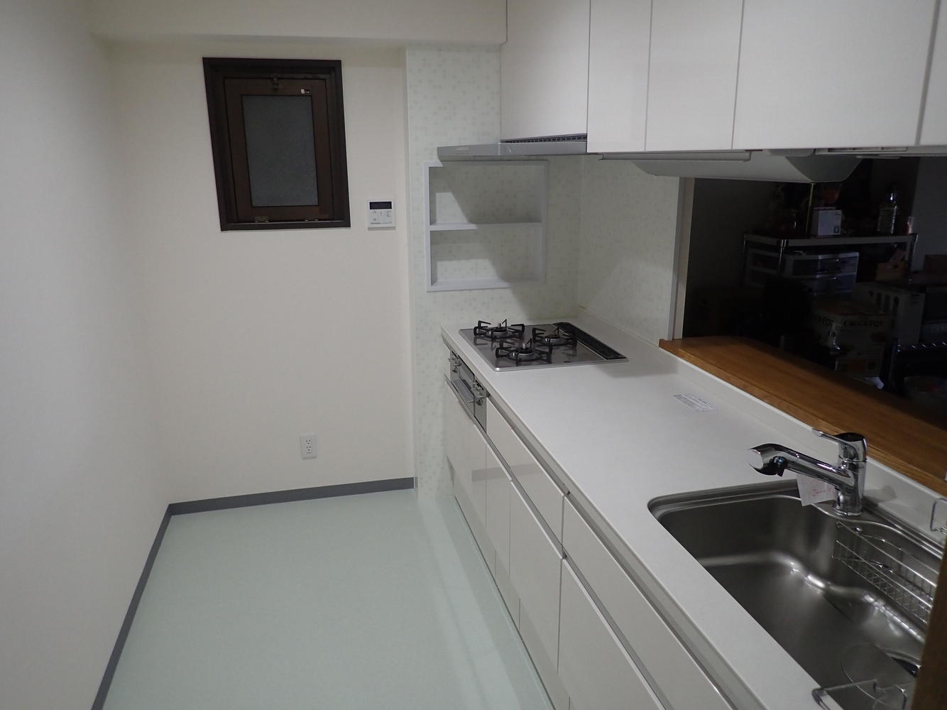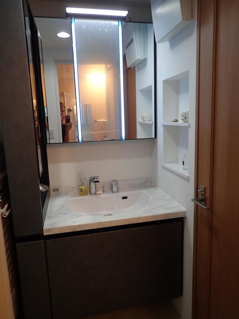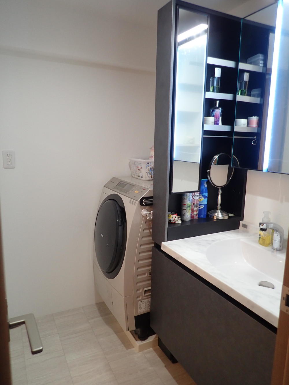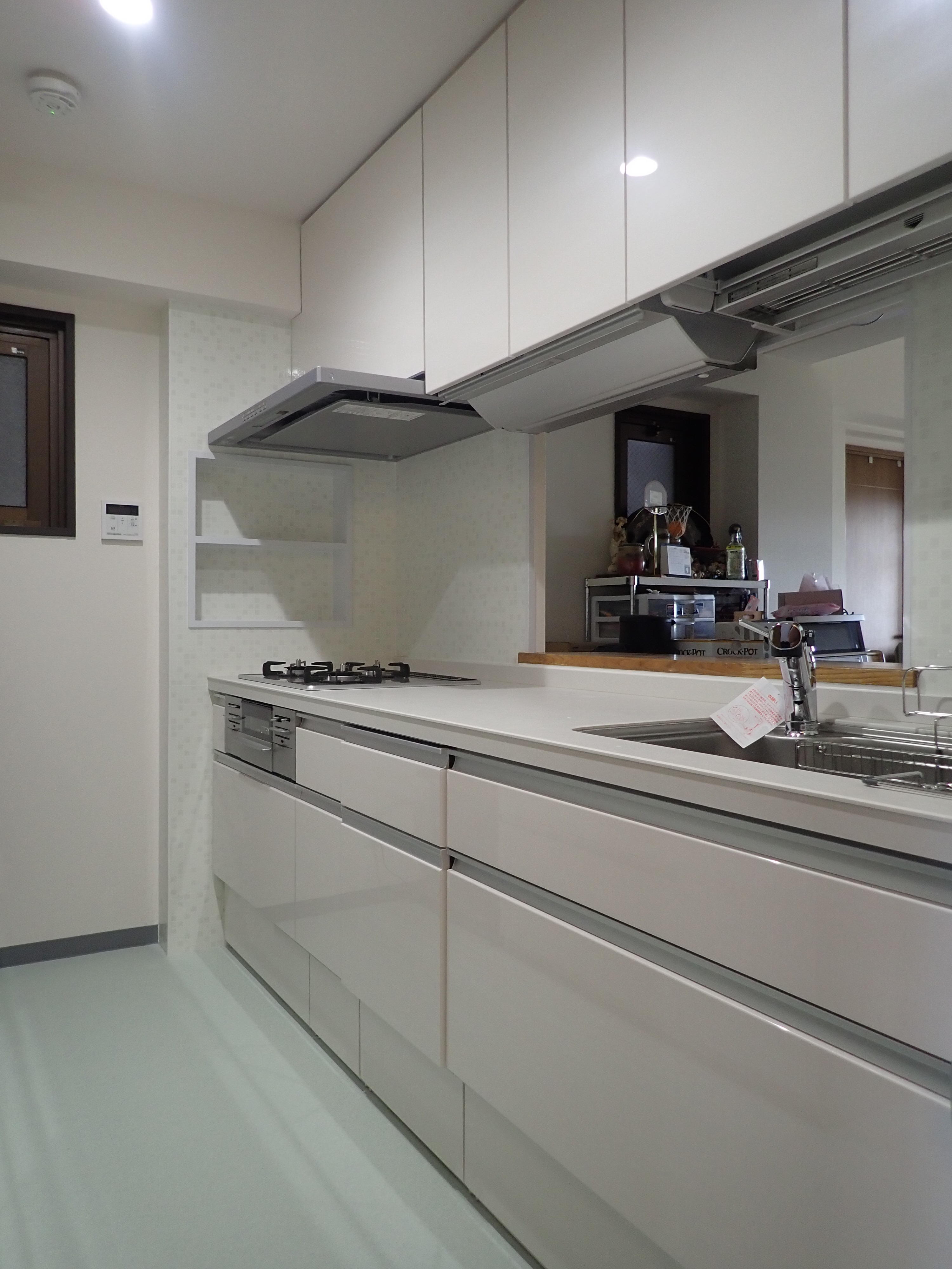 古くなった水回りを中心にリフォームをいたしました。マンションはどうしても収納が足りなくなりがちですがスペースをうまく活用できる提案をさせていただきました。キッチンの奥には調味料などを置いておける埋込収納を造作しています。