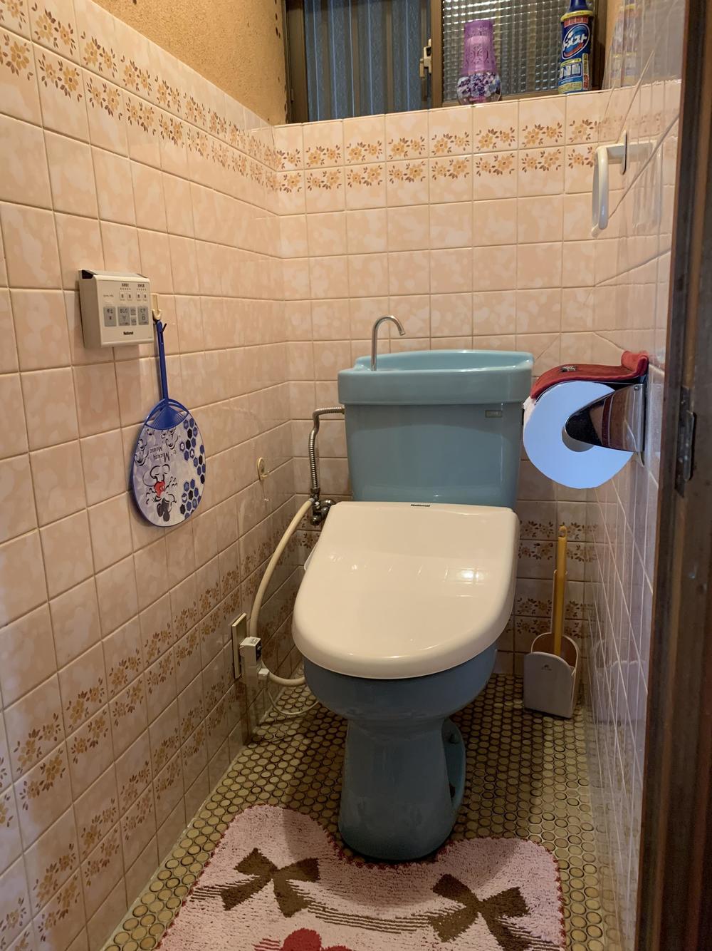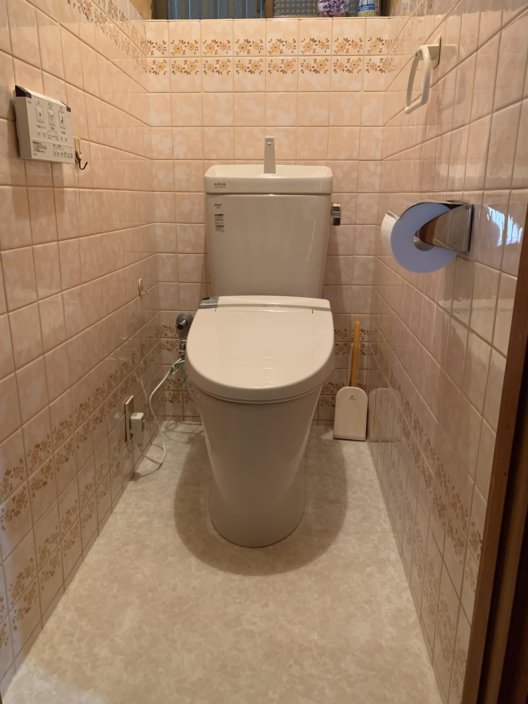 古くなったトイレをお取替えいたしました。タイル床の掃除がしずらいとのことでしたので、タイルの上に下地をつくり、クッションフロアで仕上げました。