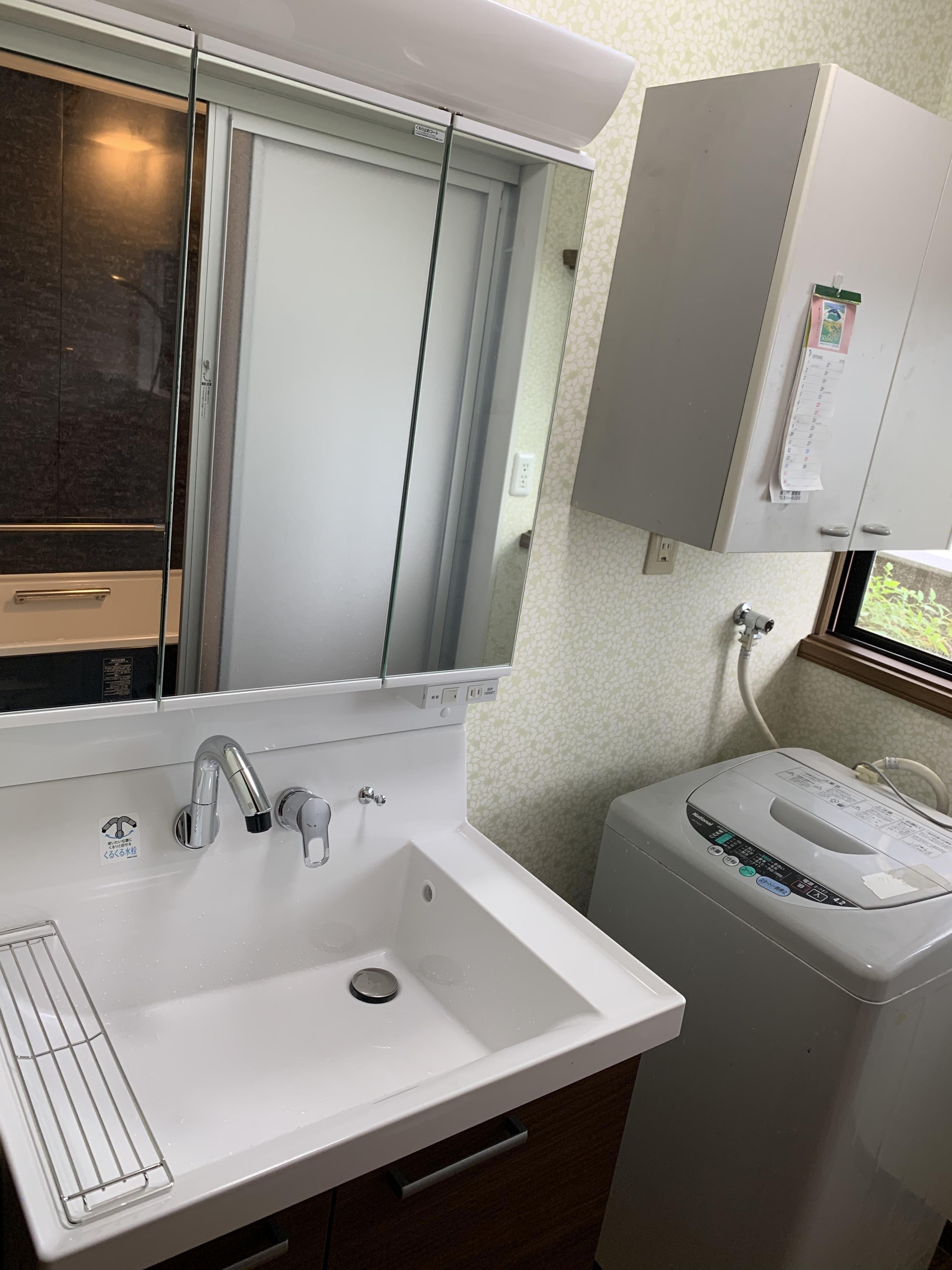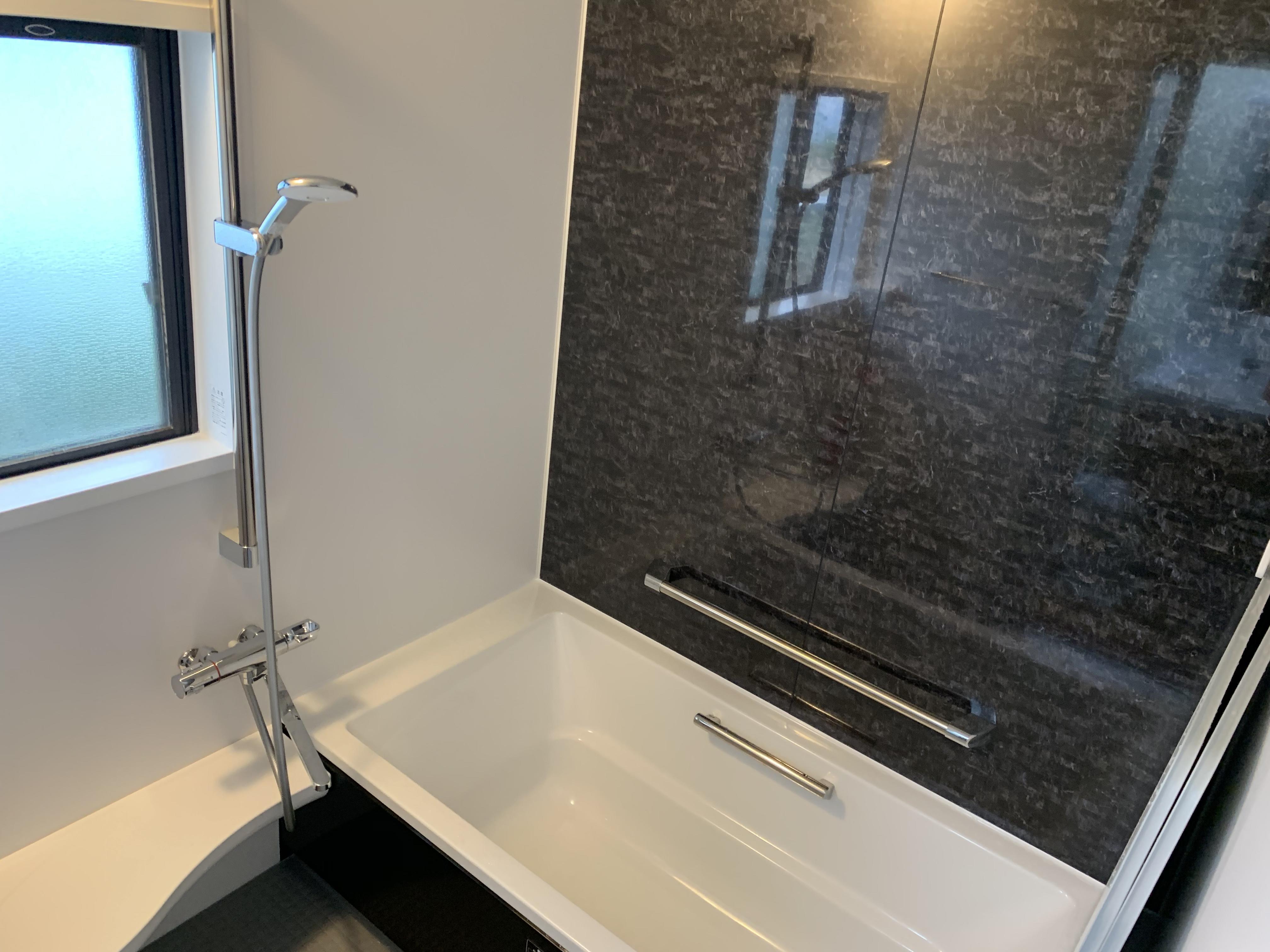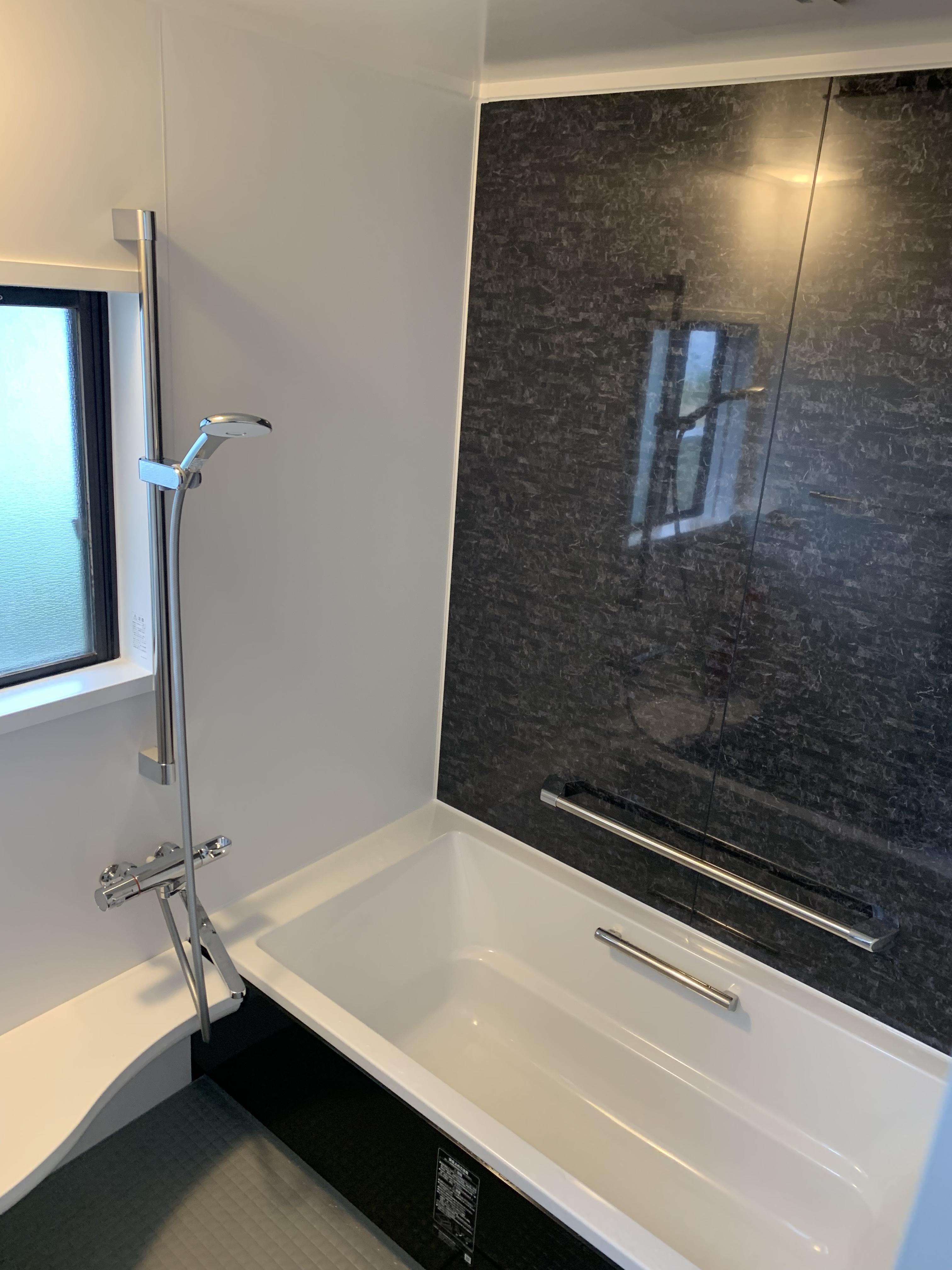 以前は外から使用できる物置が浴室横に設置されており、足が延ばせる浴室にしたいとご希望でした。白を基調とし、黒のパネルとエプロンで落ち着いた印象のお風呂になりました!浴槽はミナモ浴槽を使用し、ゆったりと浸かれます。【LIXILユニットバス アライズ1616サイズ/アクセントパネル/ストーンモザイクダーク】