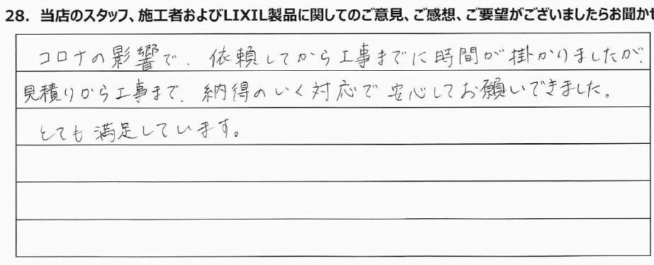 コロナの影響で、依頼してから工事までに時間がかかりましたが、見積りから工事まで、納得のいく対応で安心してお願いできました。とても満足しています。