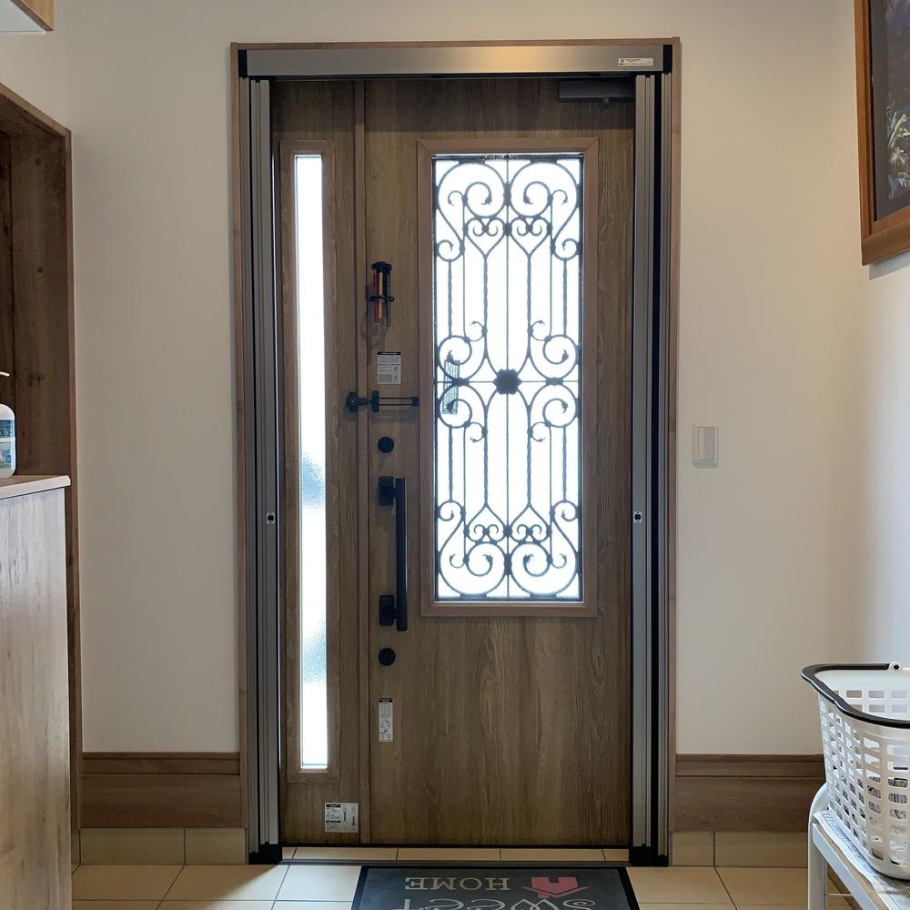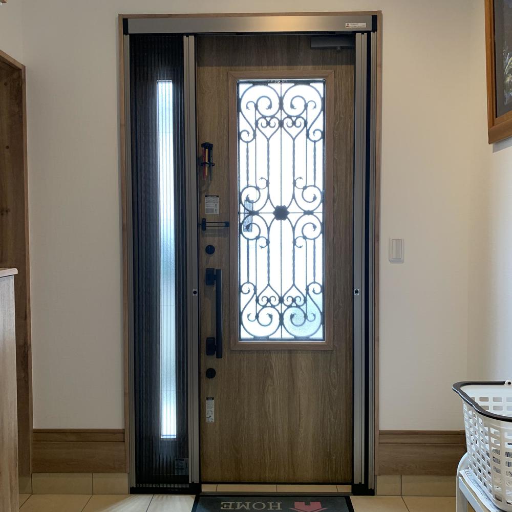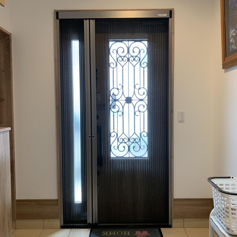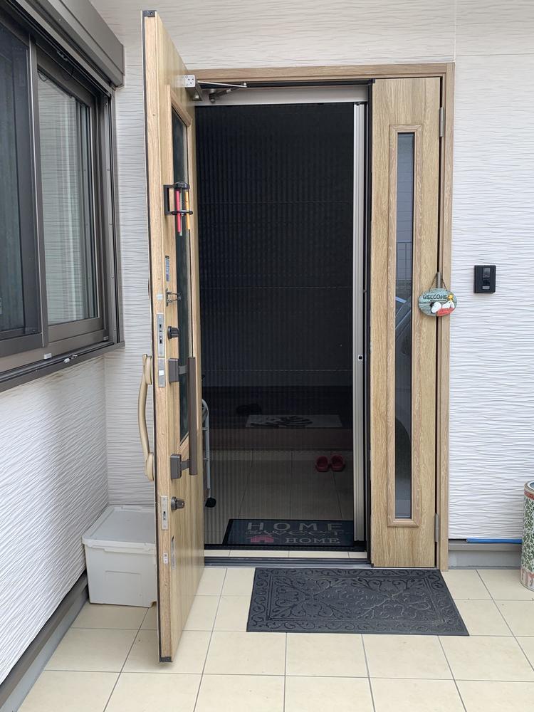 玄関に網戸を取付けいたしました。 室内の換気効率がぐっと上がります! ジャバラ式の網戸なので使用していない時はすっきり収納できますよ♪