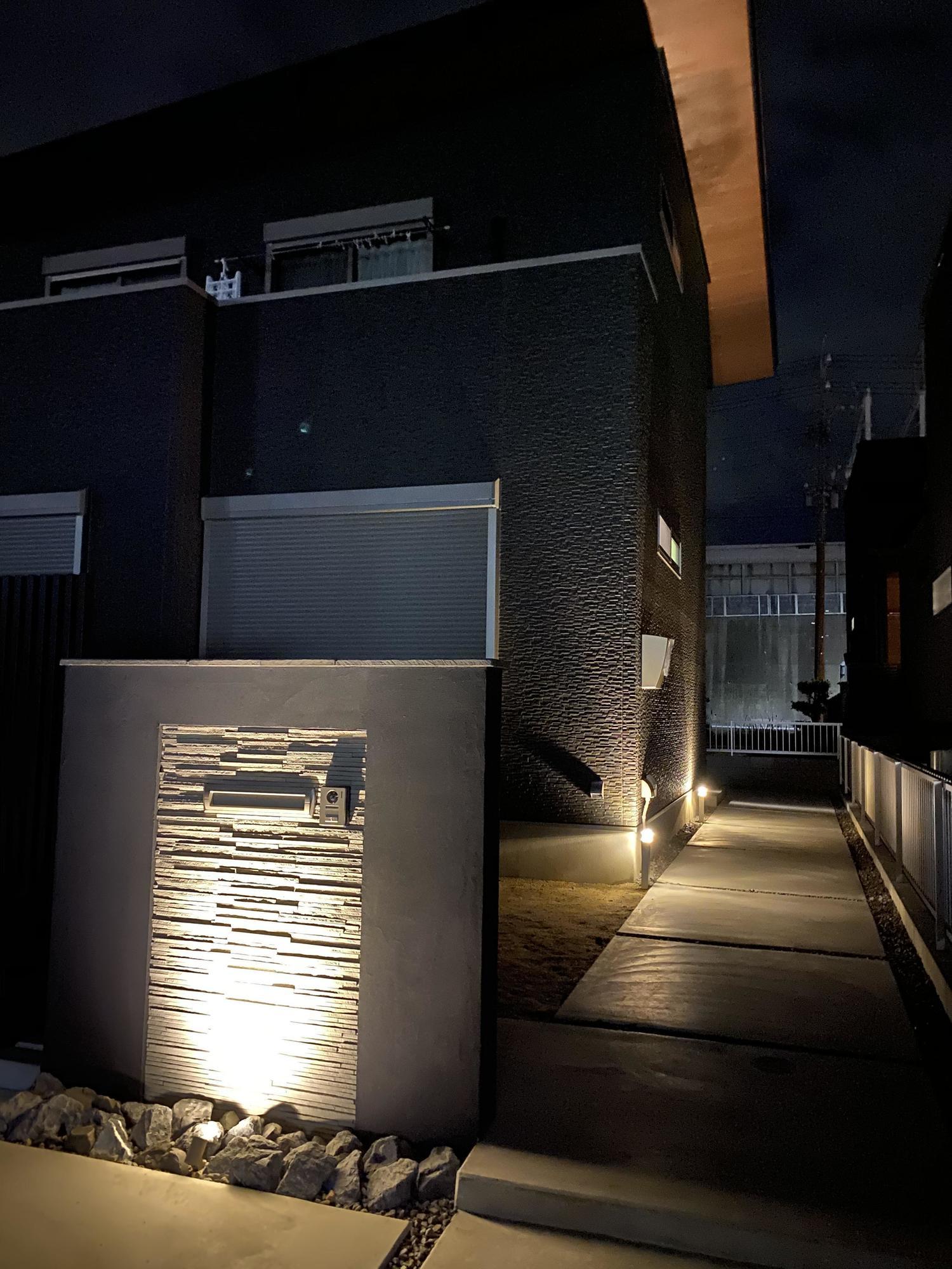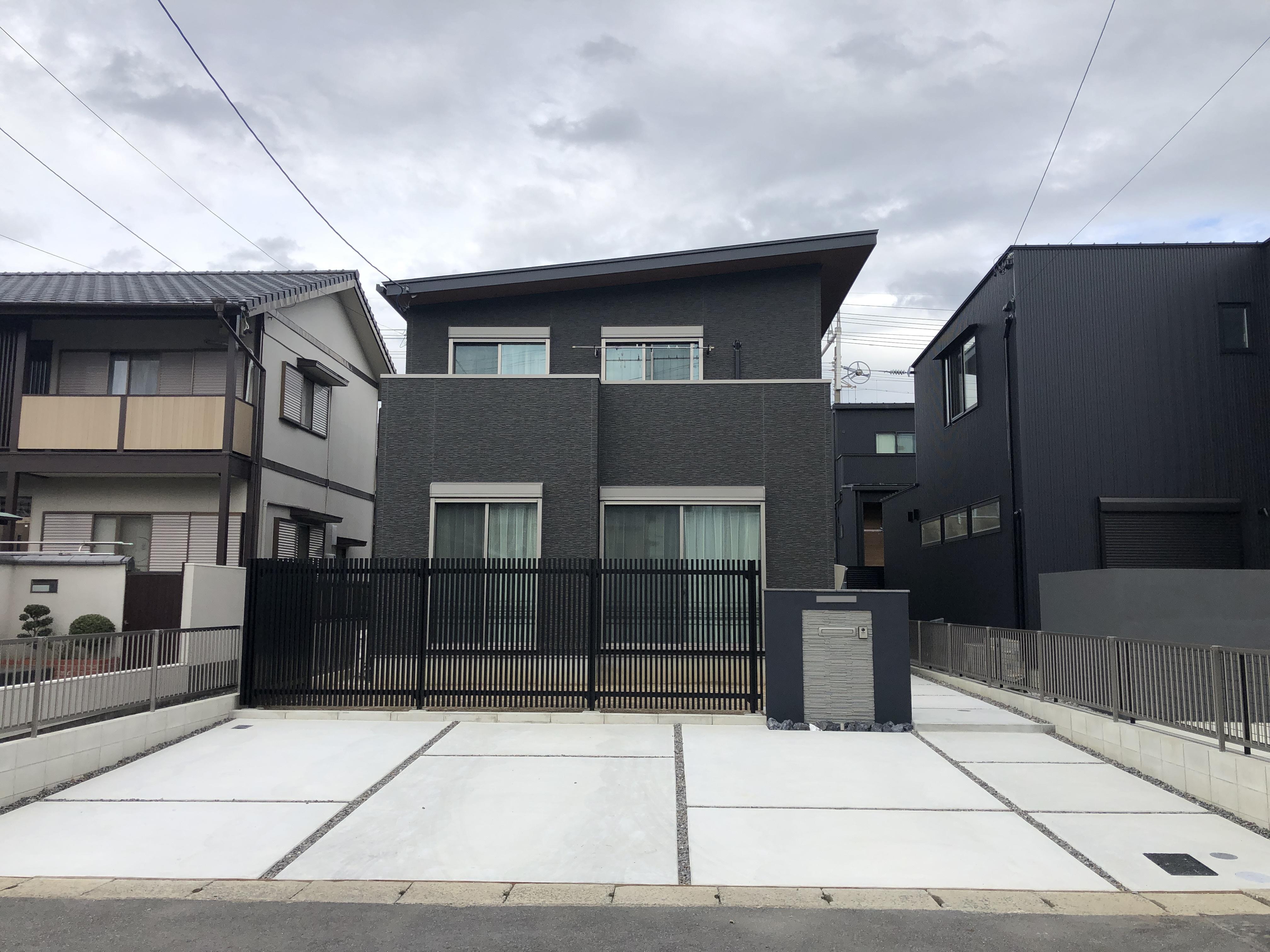 新築で建てられたお家の外構工事をおこないました。 ダークトーンの落ち着いた印象の外壁に合せて門柱もシックなカラーに。
