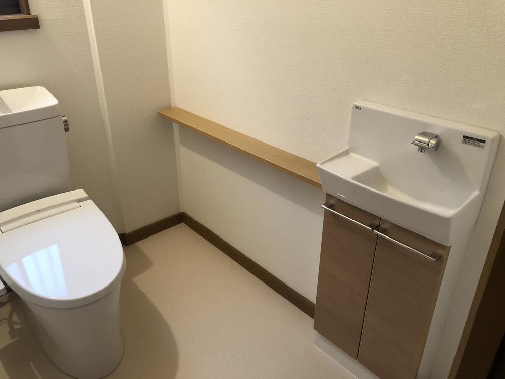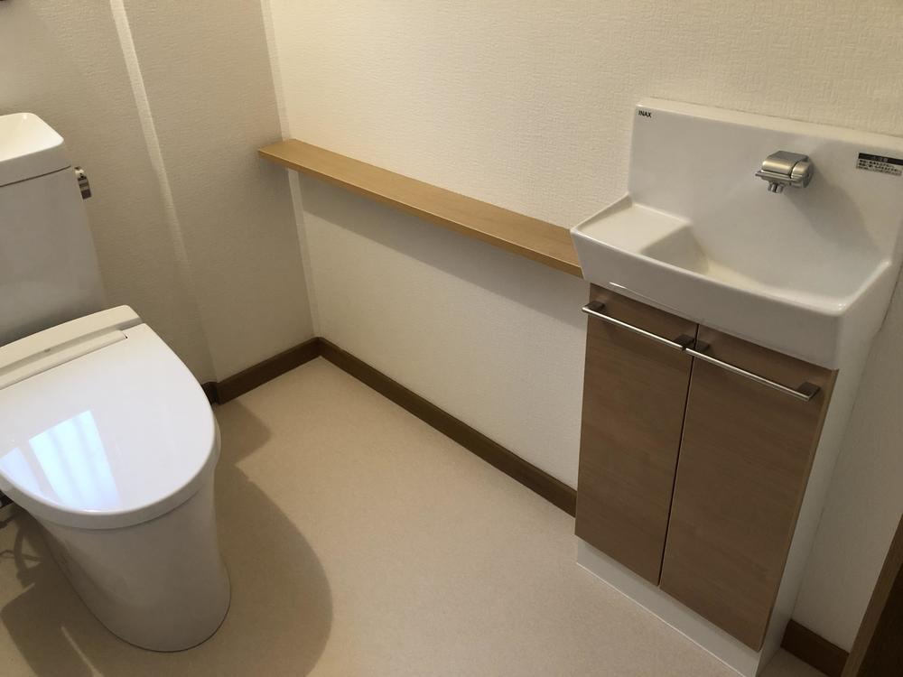 古くなったトイレに設置された手洗い器を取替いたしました。 手洗器のサイズが変わる為、クロスや床のクッションフロアも張替えしています。