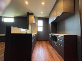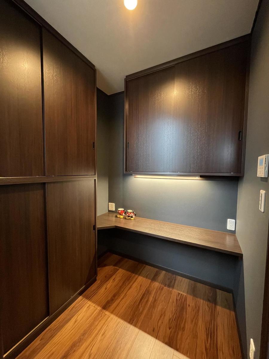 ご主人様のご実家に同居されることとなり、2世帯としてお住いいただけるように横屋をリフォームいたしました。 お施主様のこだわった内装やホテルライクな洗面化粧室、奥様の家事&趣味コーナーなど限られた空間を最大限利用し、ご夫婦の新居が完成! 天井を2700と最大限まで高くしたことで空間が広がり、圧迫感のない室内になりました。
