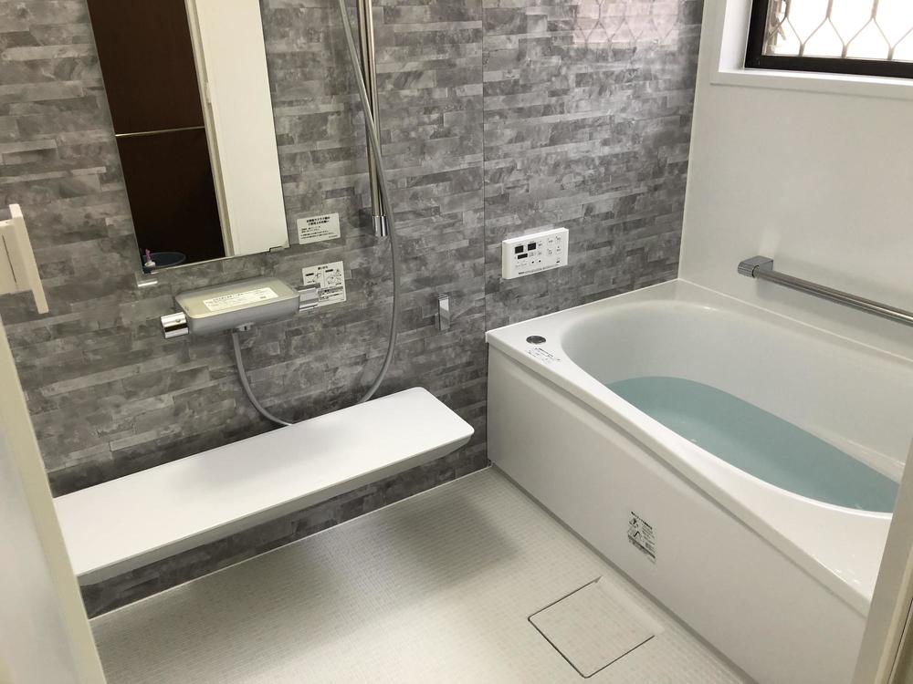 古くなった浴室をリフォームいたしました。 ダークトーンの壁パネルがいいアクセントになっています!