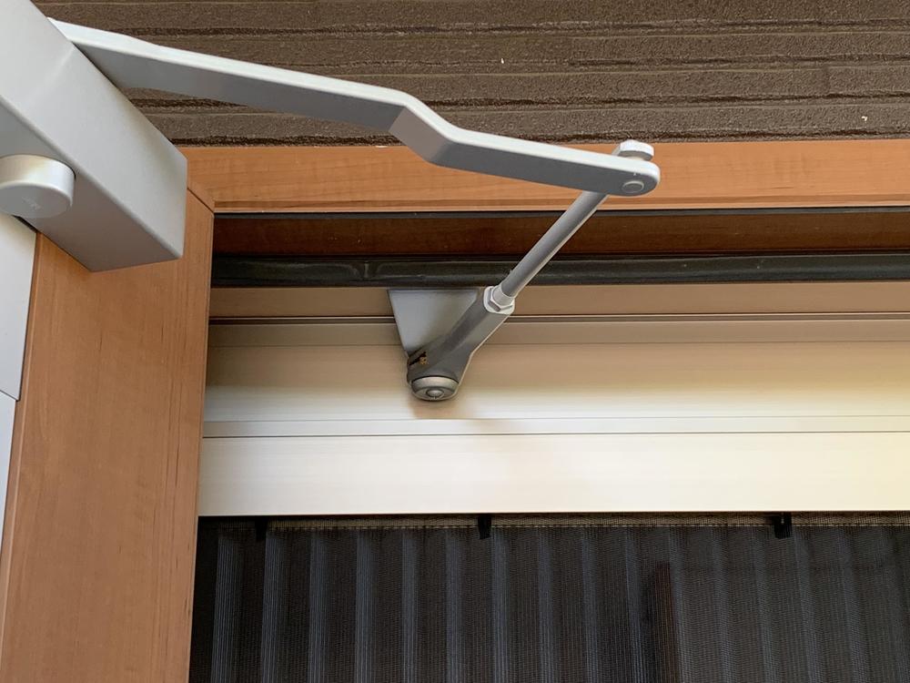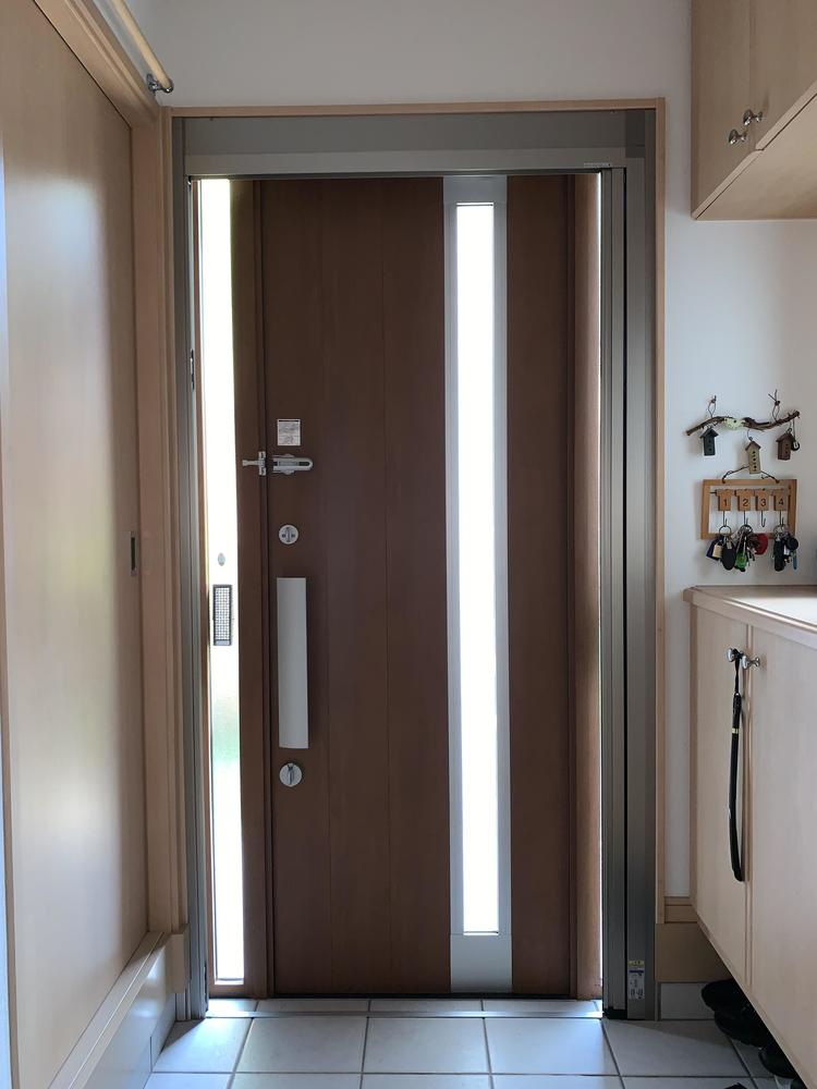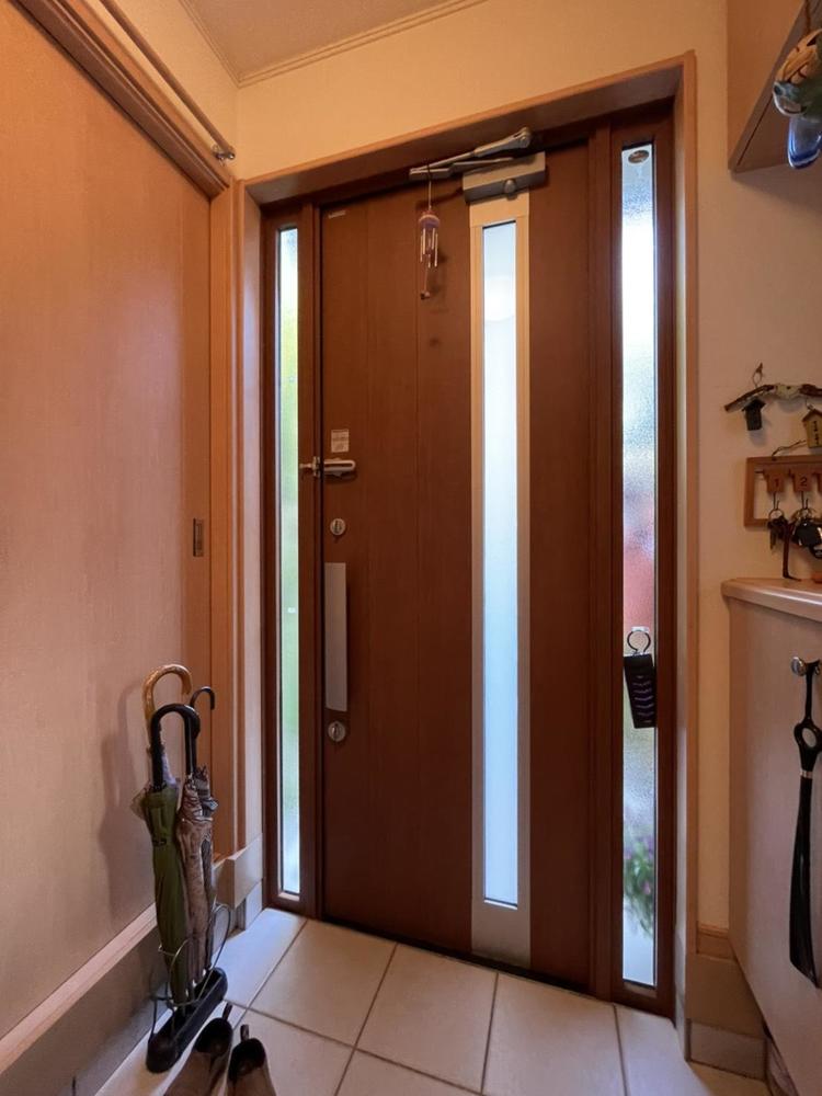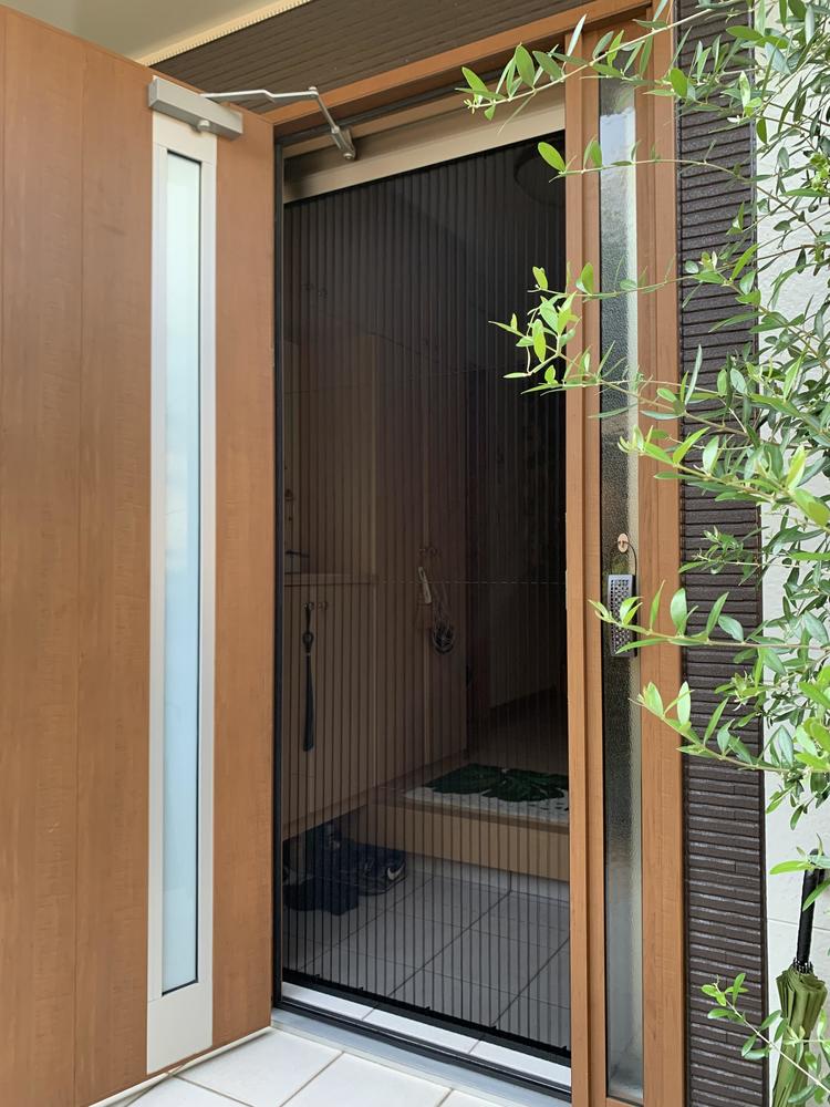 風通しを良くするため、玄関にも網戸を設置したいとお問い合わせいただきました。 玄関ドアの両端に袖があったため、広い間口に対応している片引きタイプの網戸を設置いたしました。