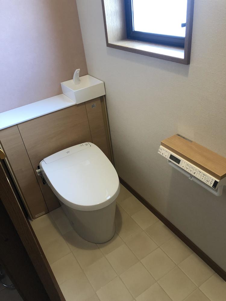 愛知県 岡崎市 M様邸 2022年11月 3日 シャワートイレの故障をきっかけにトイレのリフォームをいたしました。 インテリアリモコンにすることで壁に穴をあける必要もなくすっきりとします! アクセントクロスとタイル調のクッションフロアでかわいらしい内装のトイレになりました。 LIXIL リフォレI型 キャビネットカラー・棚付き紙巻き器カラー:クリエラスク
