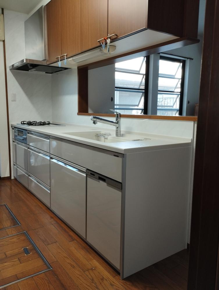 古くなったキッチンをリフォームいたしました。 レンジフードやガスコンロもお手入れのしやすいものを採用! 食洗器も導入して家事ストレスを軽減! 吊戸棚はきれいな状態でしたのでコストを抑えるためにも既設をそのまま利用いたしました。
