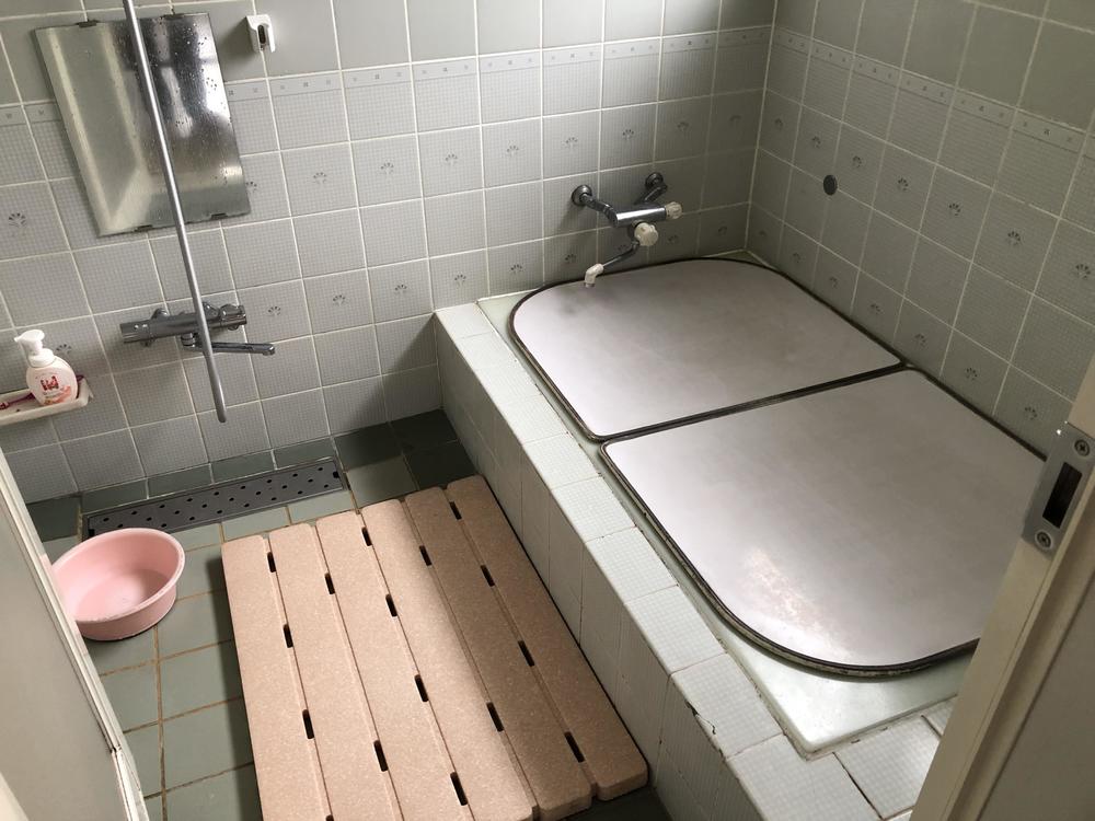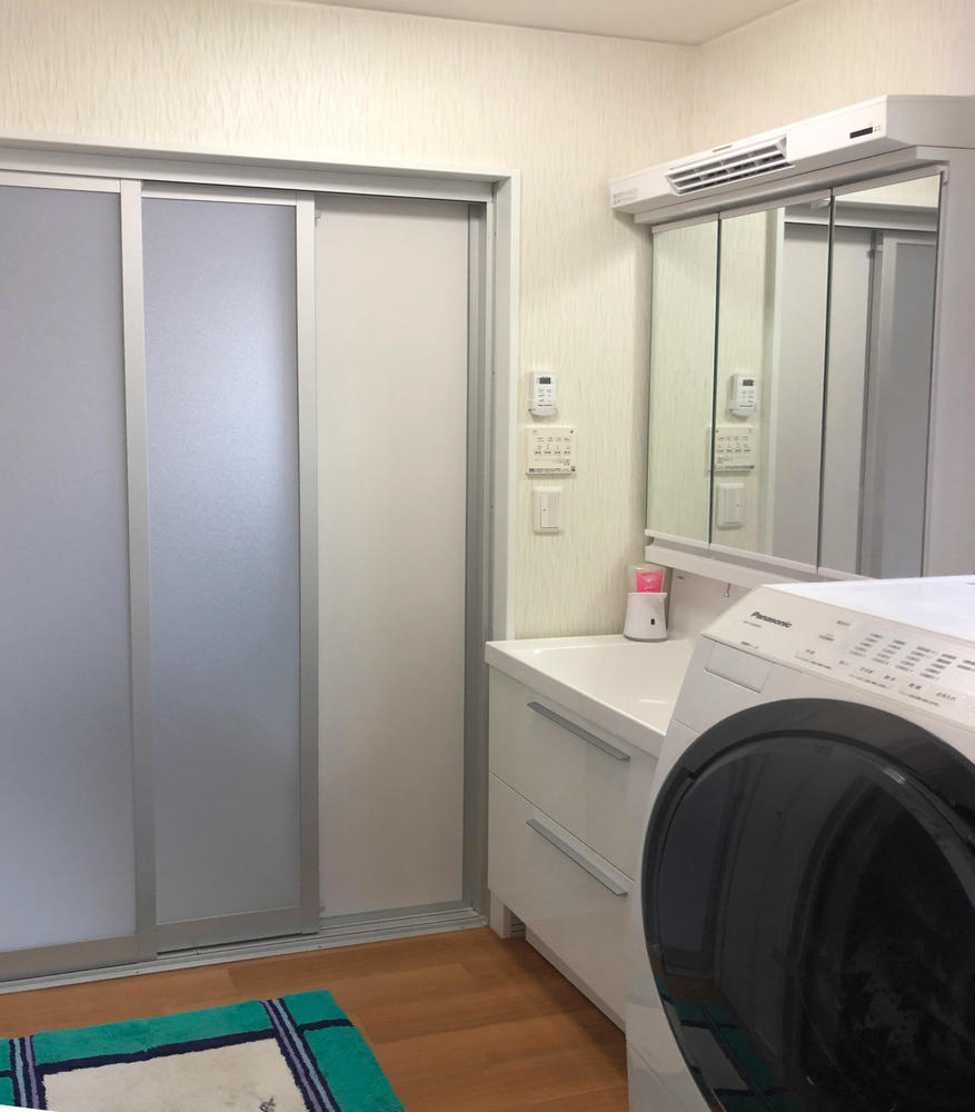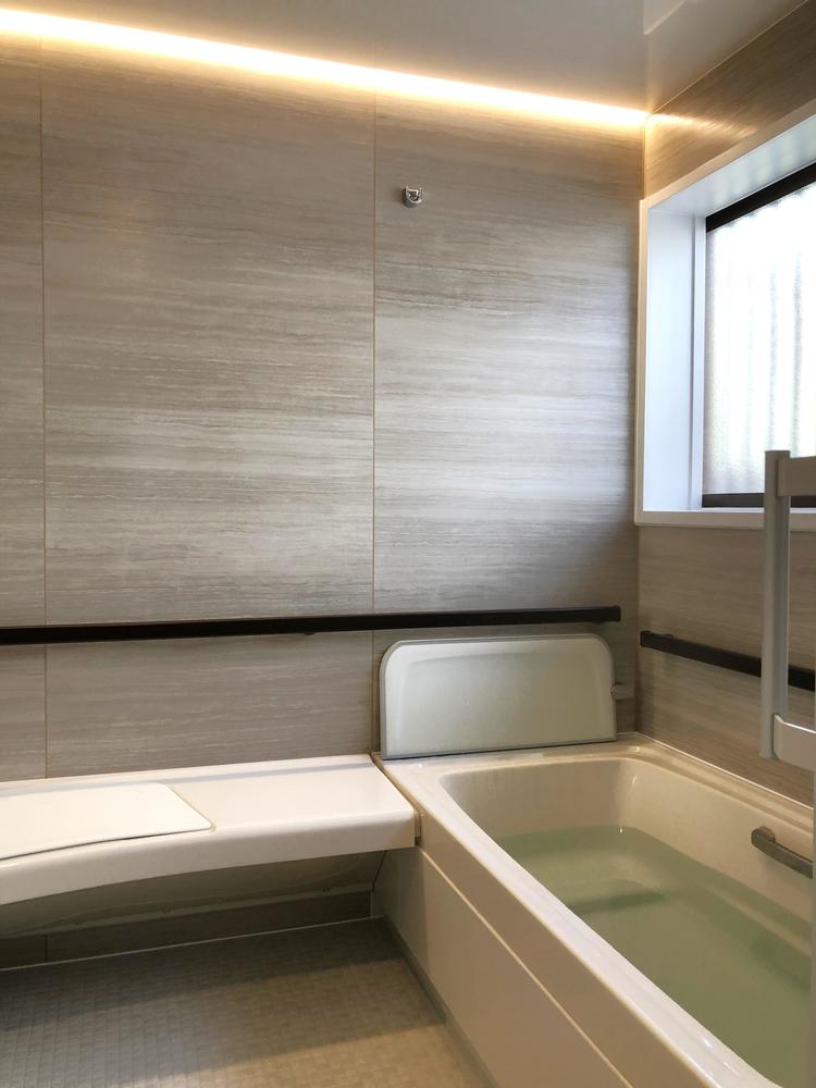 足の不自由なご家族のため、座ったまま洗い場から浴槽まで移動できるスパージュのベンチカウンターと座って使えるフタ(マルチボード)を採用いたしました。
