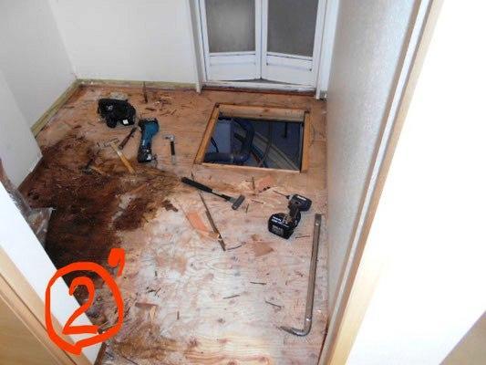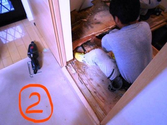 ②´の写真に写っている板は構造上もう捲れない板です。色は変わっていますが、幸いカビではなく、水によって木の色が濃くなっているだけでした。しっかり乾燥させれば大丈夫な状態と聞き、奥様と一緒にホッと一安心☆